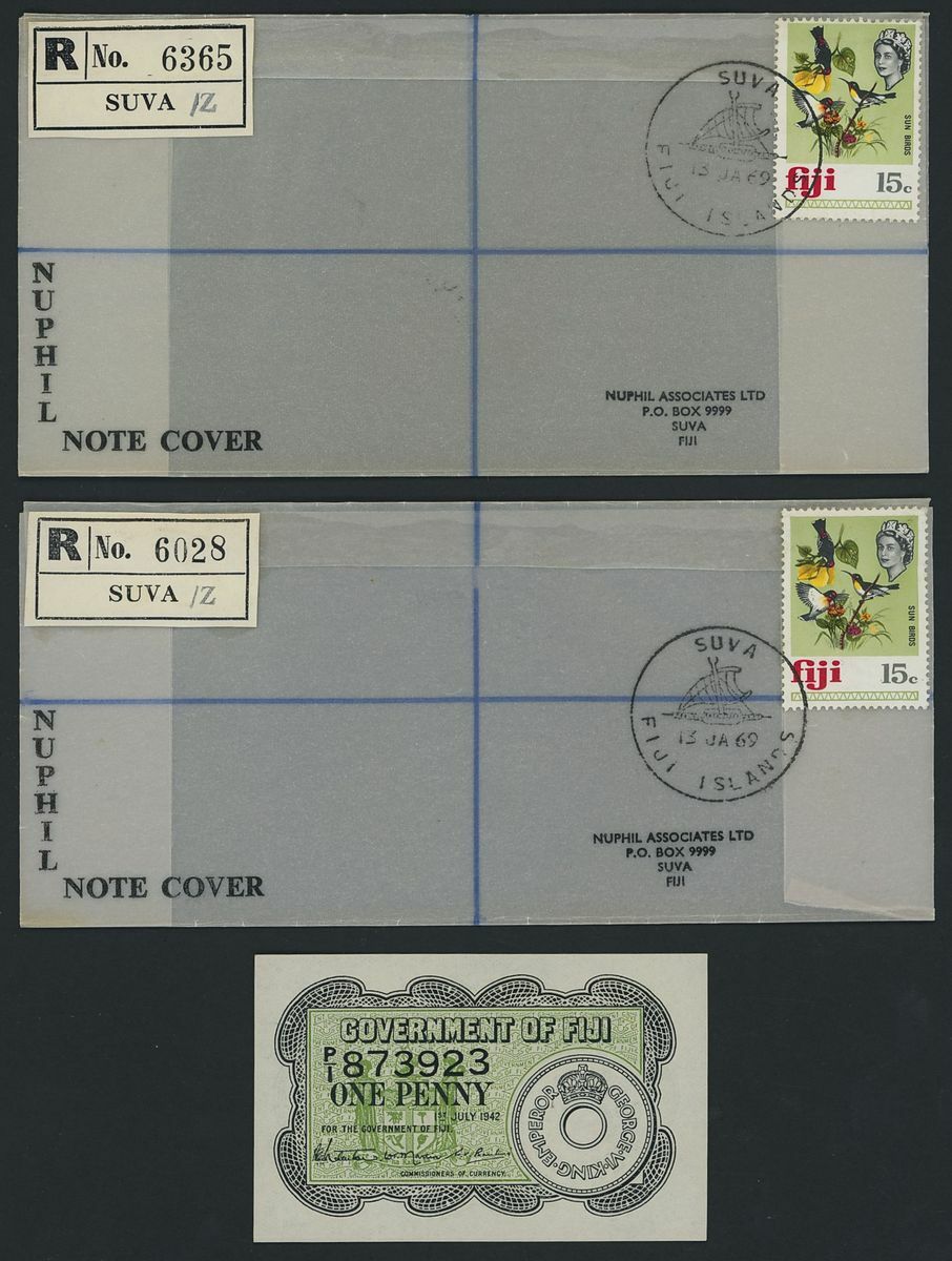 Fiji, [16 notes, 2 stamps] 1p, 50 Cents, 1, 2, 5, 10, 20, 50 Dollars, 1942-2007, includes two beautiful Fiji stamps on banknote covers, one emergency issue note from 1942, and one interesting Y2K commemorative issue