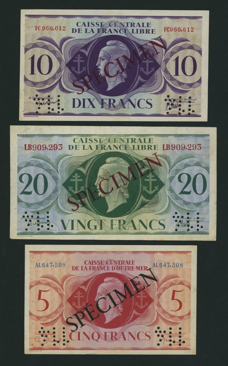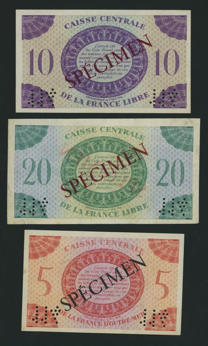(x) Caisse Centrale de la France d'Outre-Mer, French Equatorial Africa, [3 notes] specimen 5, 10, 20 Francs, 1941-44, 10 Francs, 2nd December 1941, serial number FC 960,612; 20 Francs, 2nd December 1941, serial number LB 909,293; 5 Francs, 2nd February 1944, serial number AL 647,508