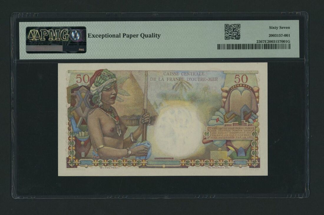 Caisse Centrale de la France d'Outre-Mer, French Equatorial Africa, [Top Pop] 50 Francs, ND (1947), serial number U.28 41174, (Pick 23, BNB 409), in PMG holder 67 EPQ Superb Gem Uncirculated