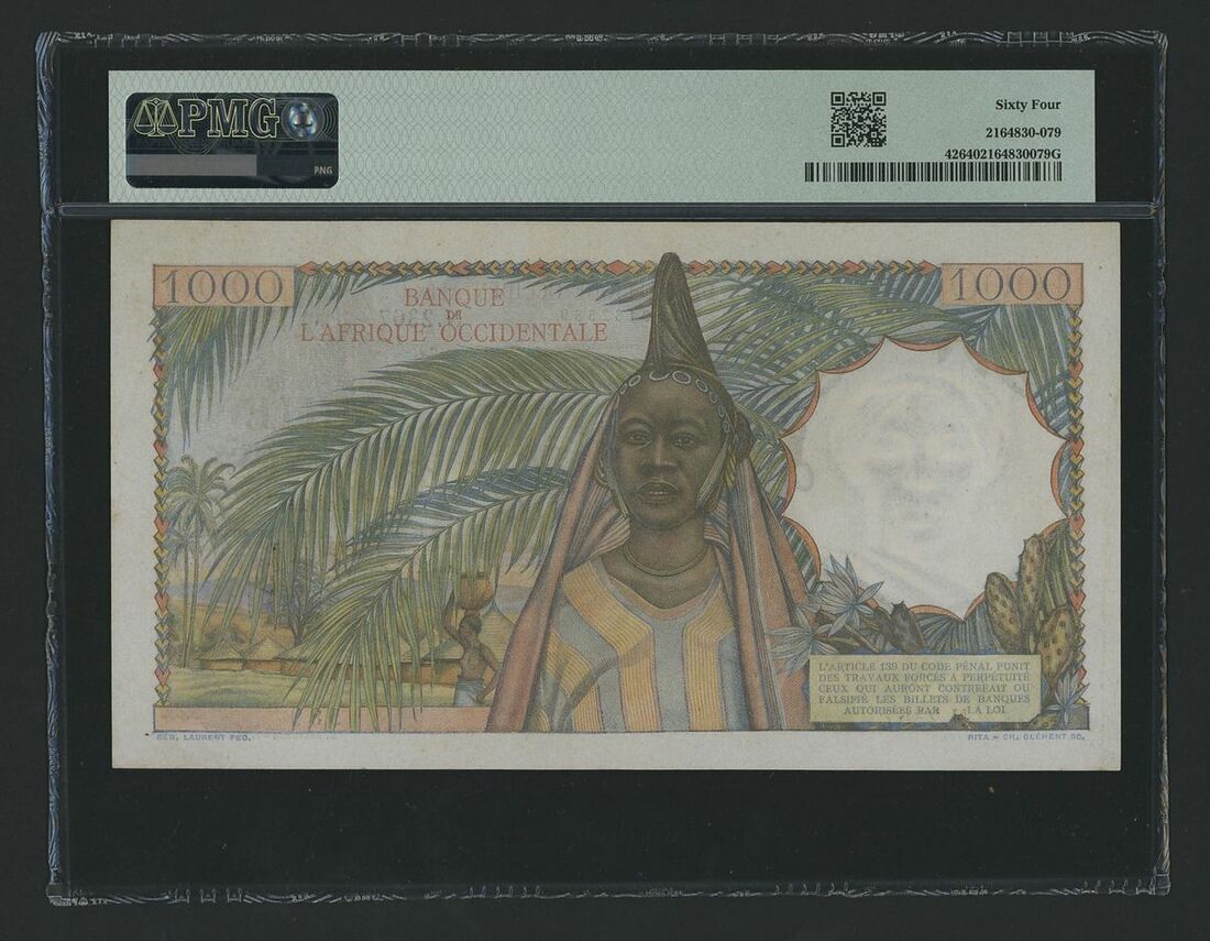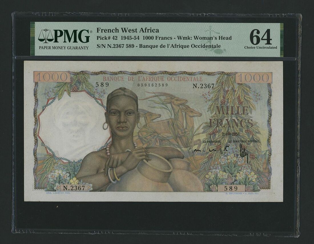 Banque de l'Afrique Occidentale, French West Africa, [Top Pop] 1000 Francs, 2nd October 1951, serial number N.2367 589, (Pick 42, BNB 126), in PMG holder 64 Choice Uncirculated, single finest graded at PMG