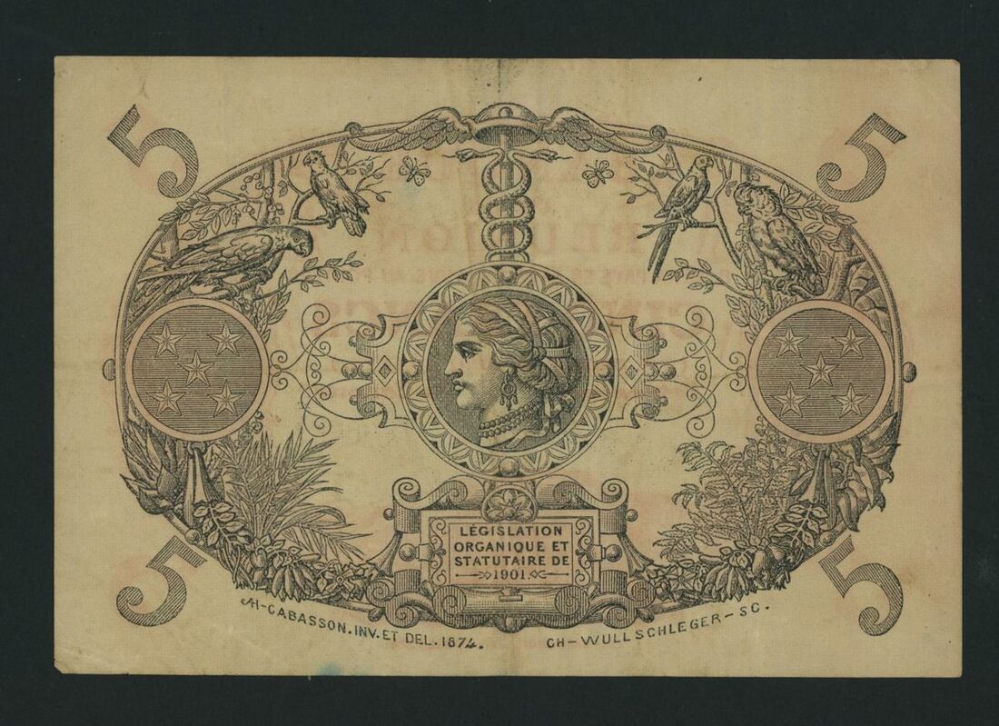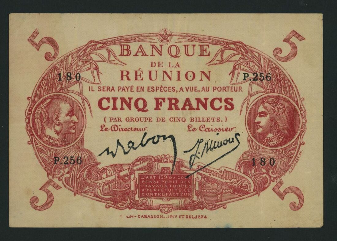 Banque de la Reunion, 5 Francs, ND (1913-14), serial number P.256 180, (Pick 14, BNB 207i), good fine