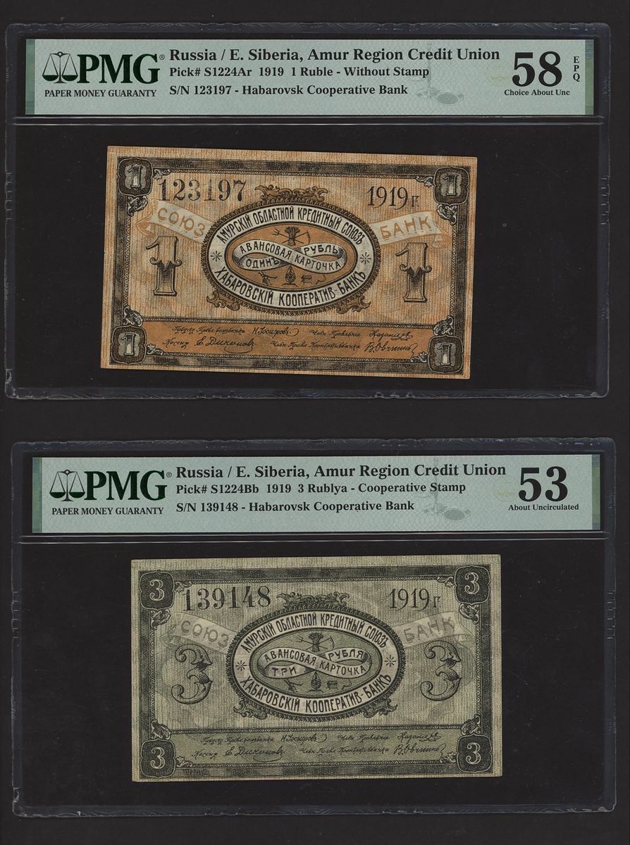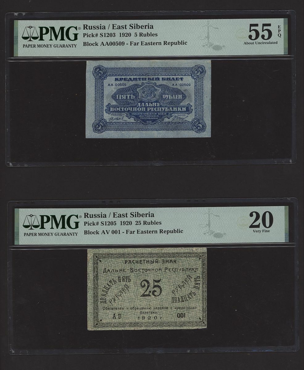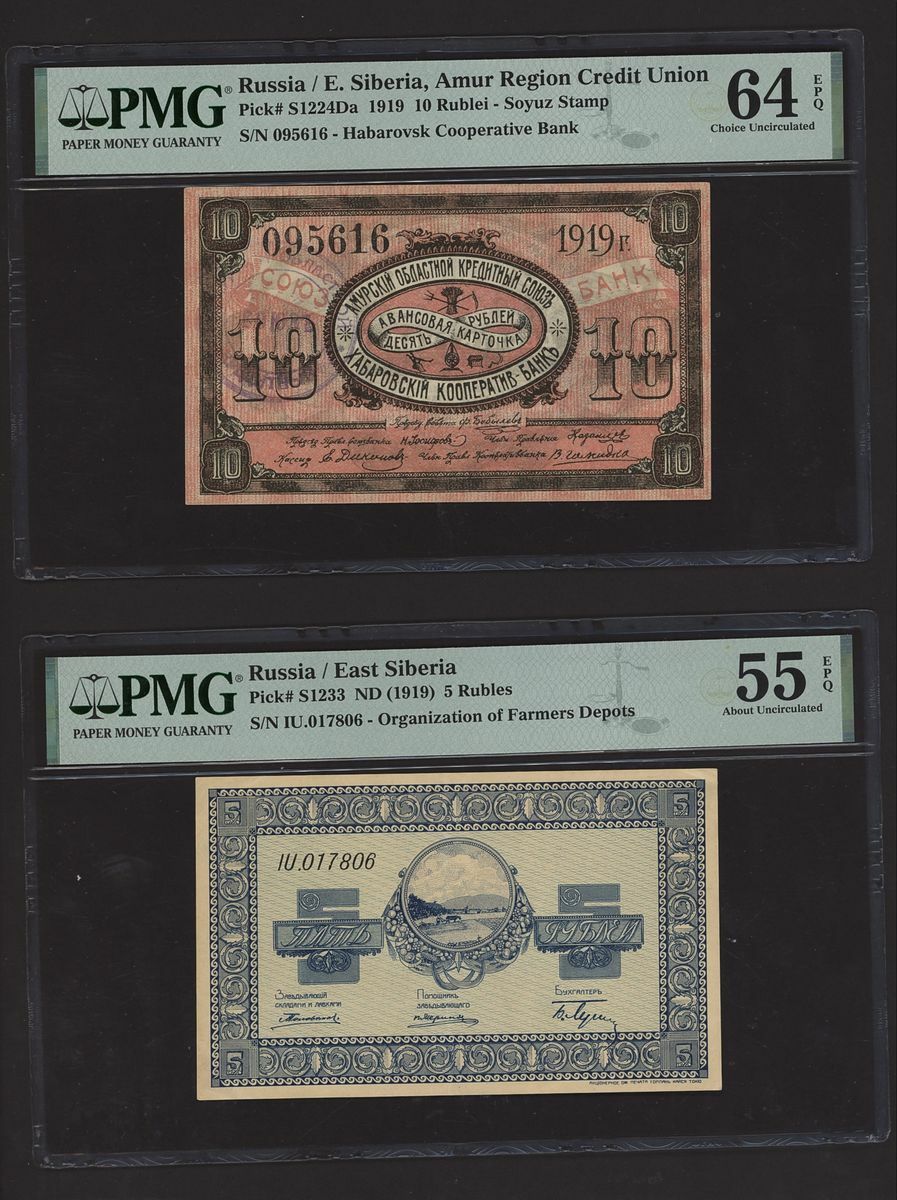 (x) East Siberia, Russia, [10 notes] 1, 3, 5, 10, 25, 100 Rubles, 1918-20, (Pick S1187b, S1196, S1203, S1205, S1244Ar, S1224Bb, S1224Da, S1233, S1237, S1245), in PMG holders 20 Very Fine to 64 EPQ Choice Uncirculated (10 notes)
