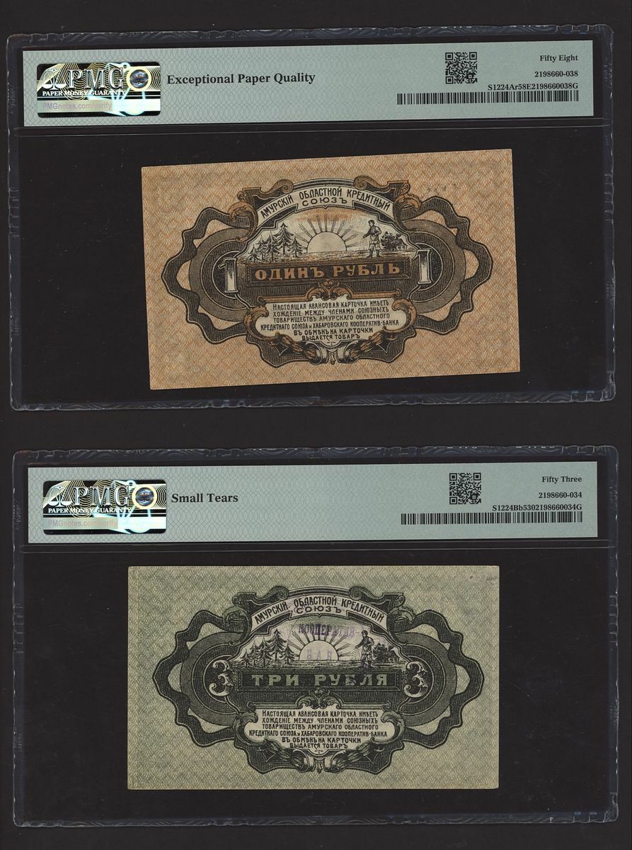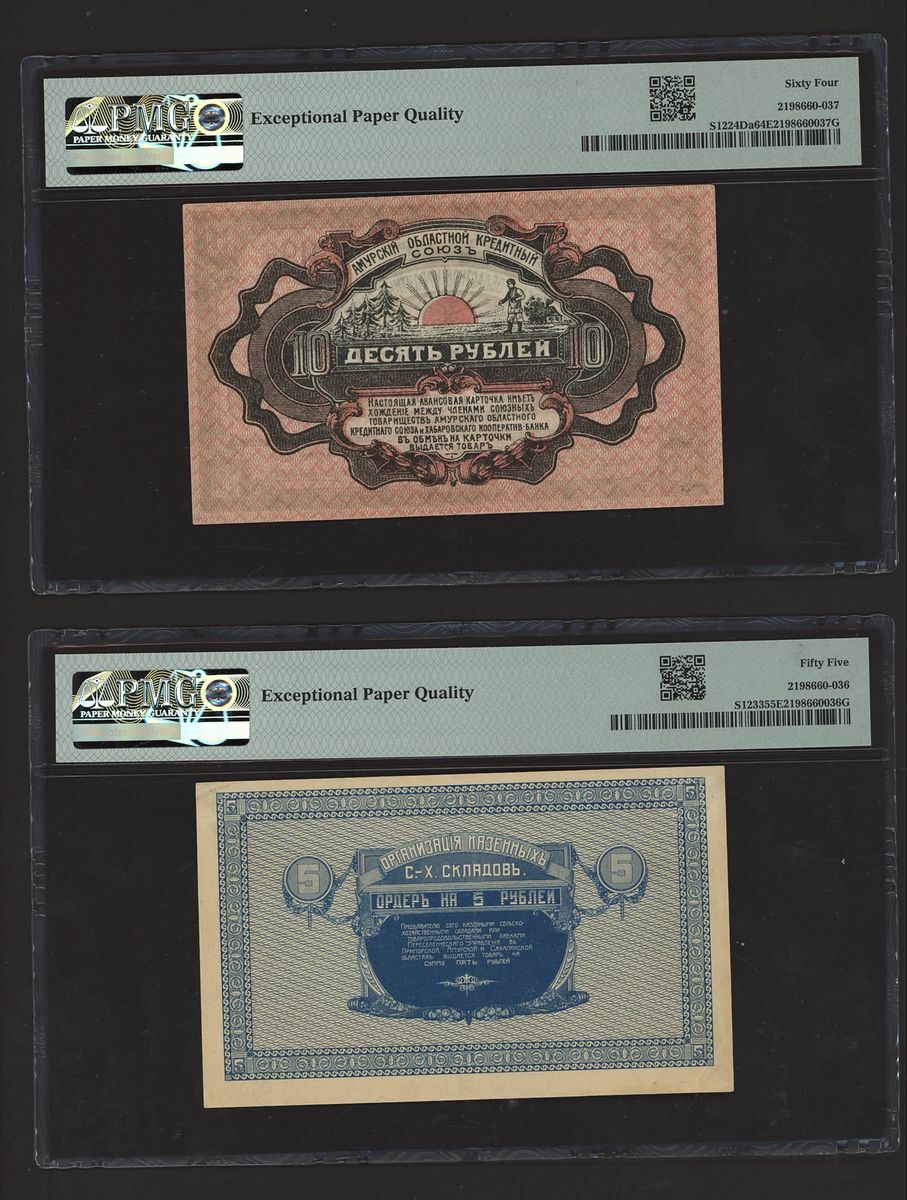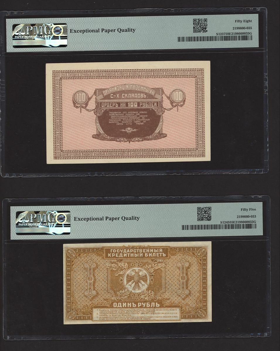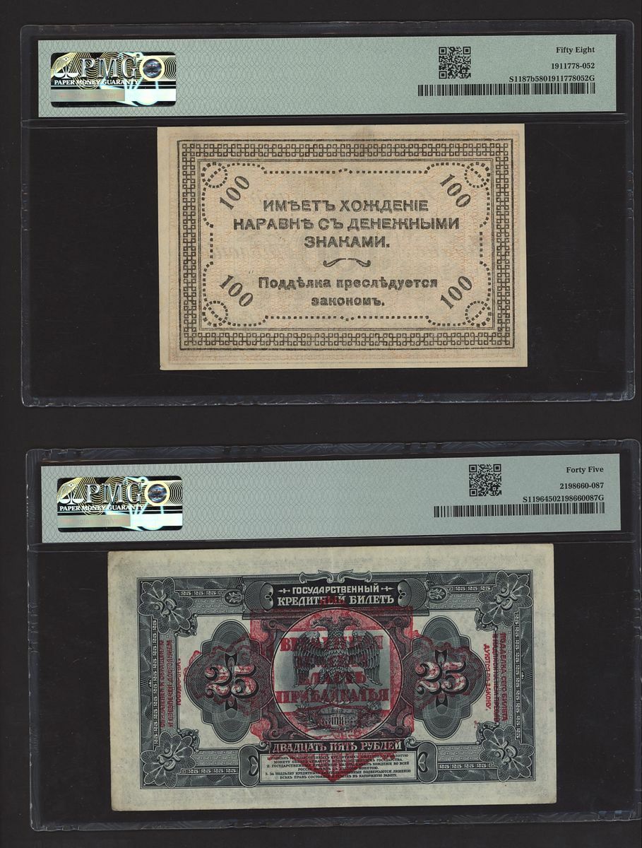 (x) East Siberia, Russia, [10 notes] 1, 3, 5, 10, 25, 100 Rubles, 1918-20, (Pick S1187b, S1196, S1203, S1205, S1244Ar, S1224Bb, S1224Da, S1233, S1237, S1245), in PMG holders 20 Very Fine to 64 EPQ Choice Uncirculated (10 notes)