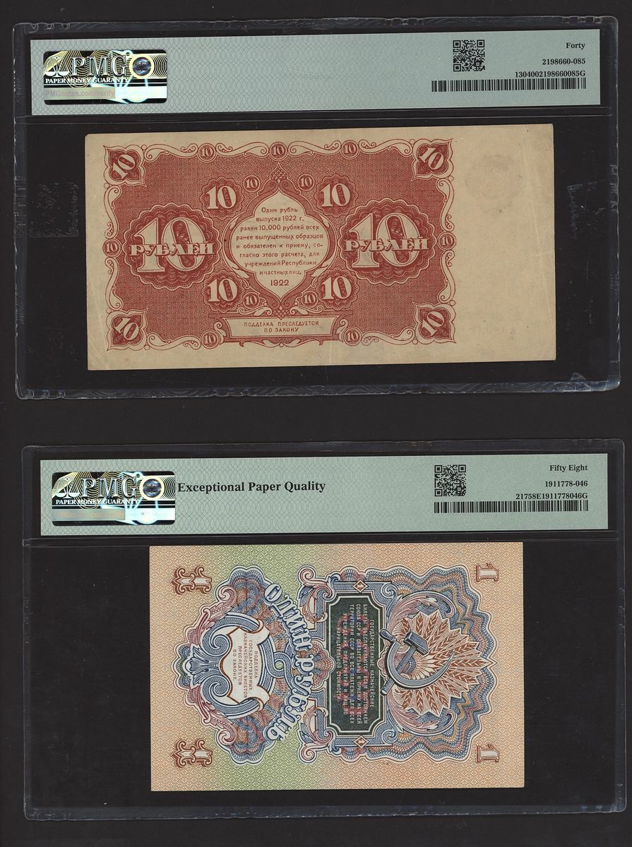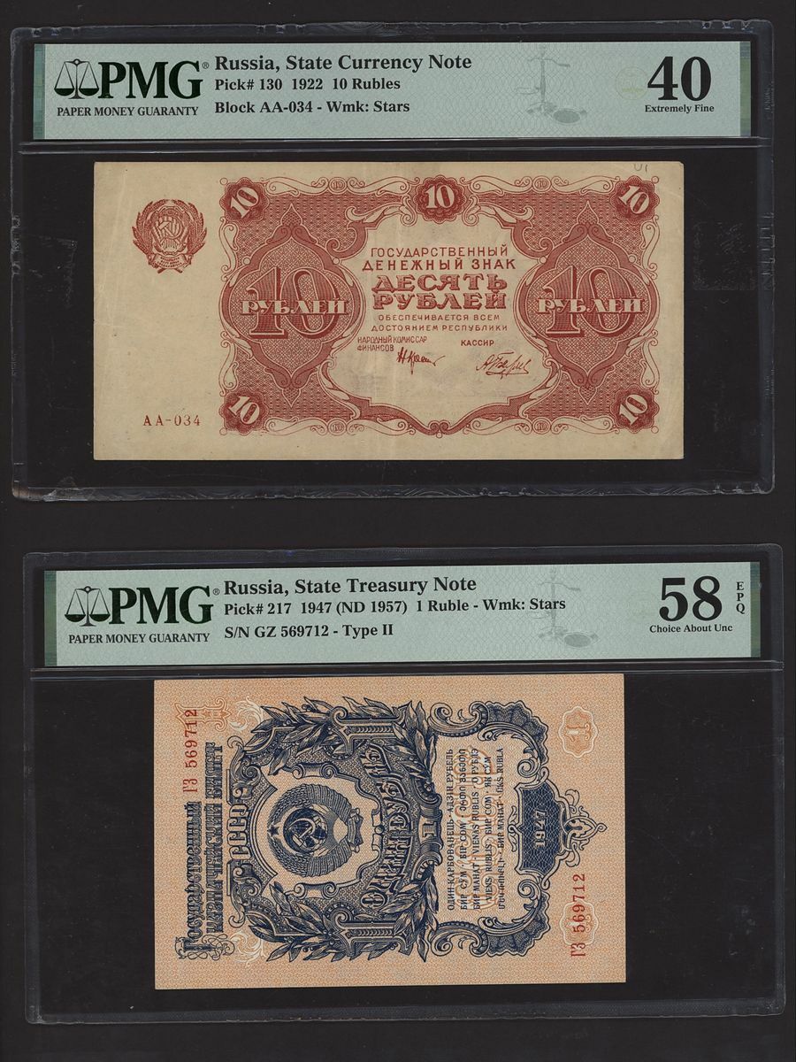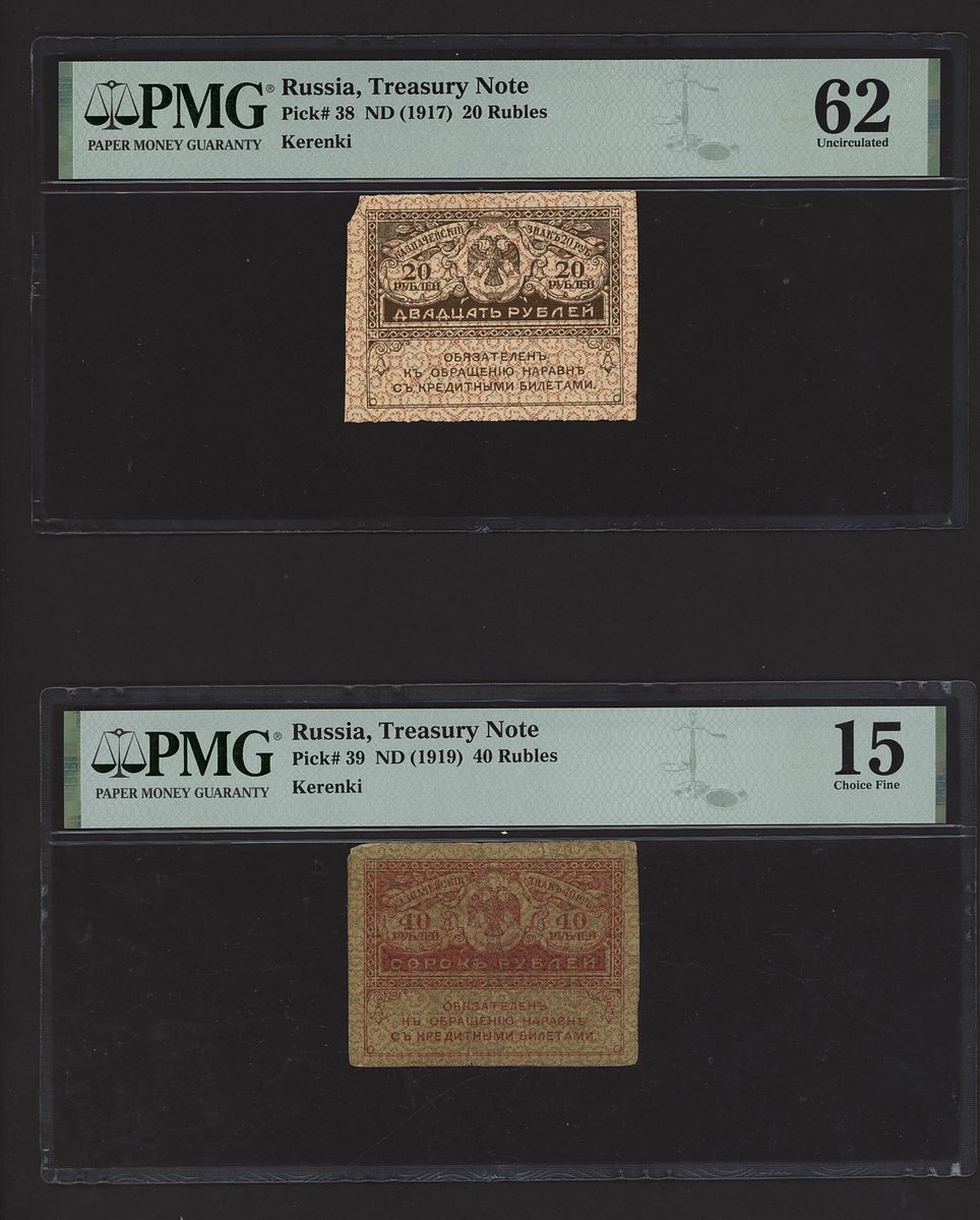 (x) Russia, [4 notes] 1, 10, 20, 40 Rubles, 1917-1947, (Pick 38, 39, 130, 217), in PMG holders 15 Choice Fine to 62 Uncirculated (4 notes)