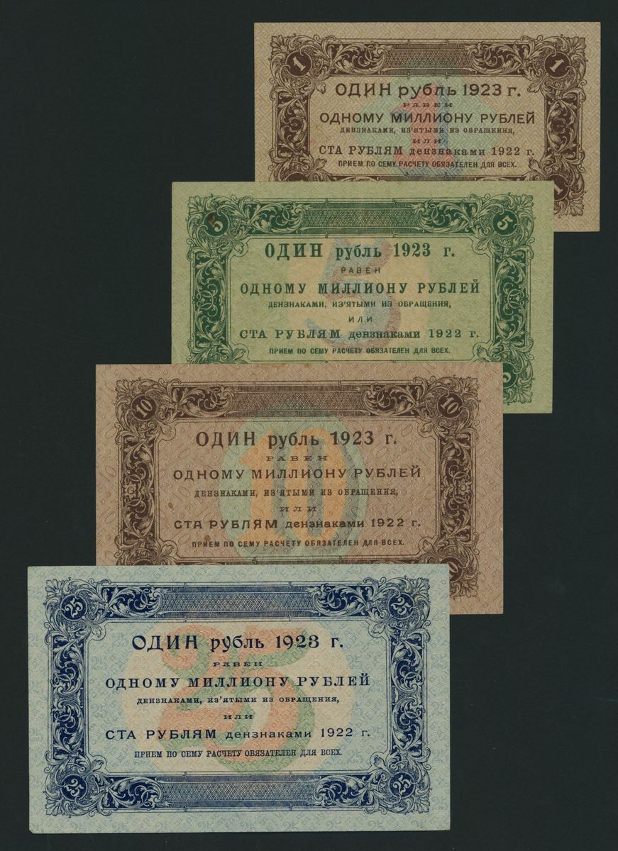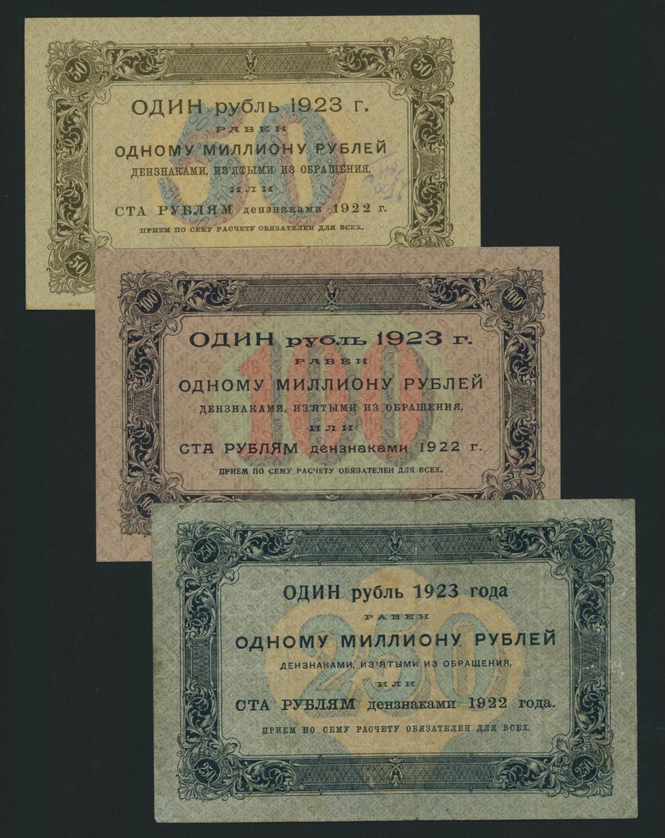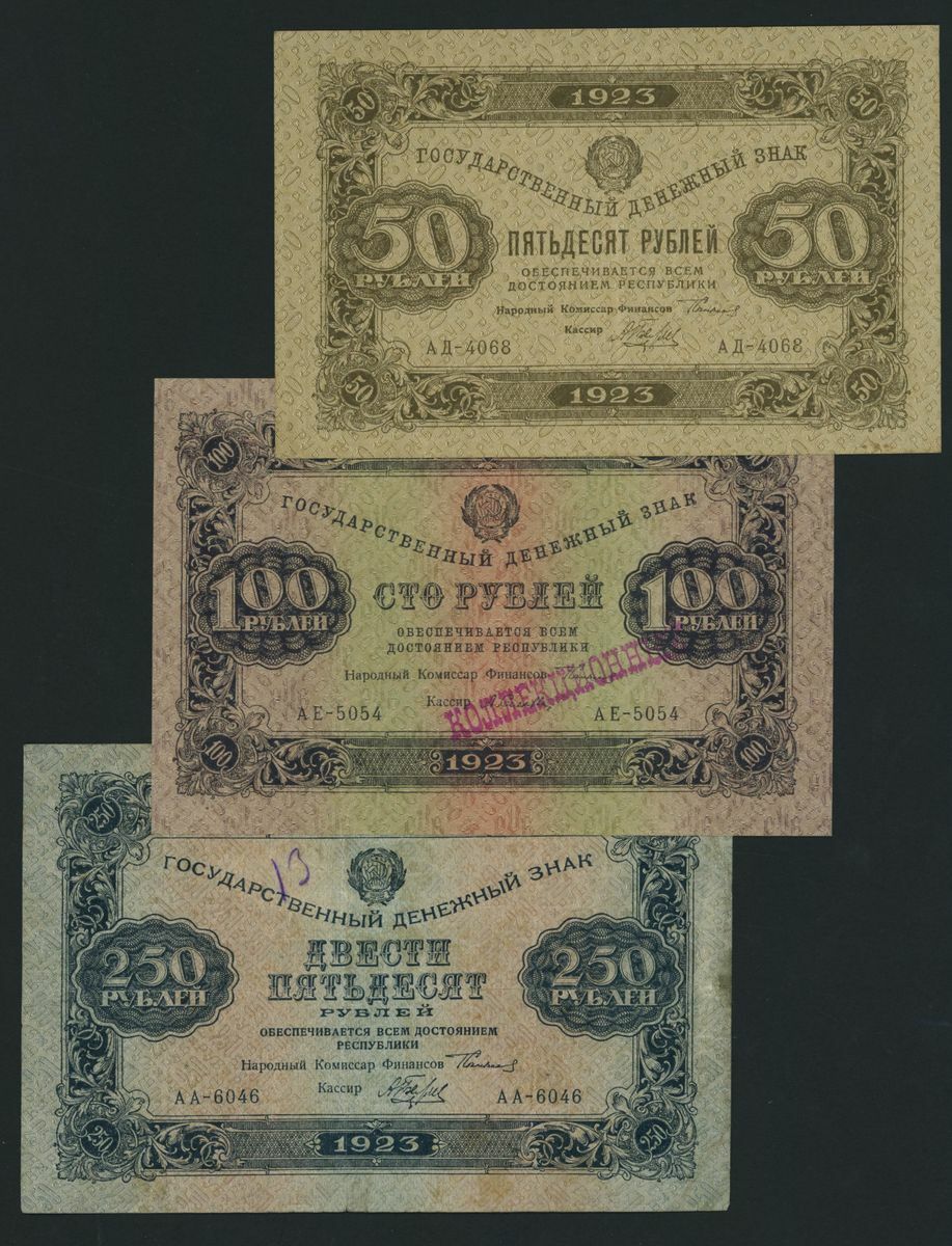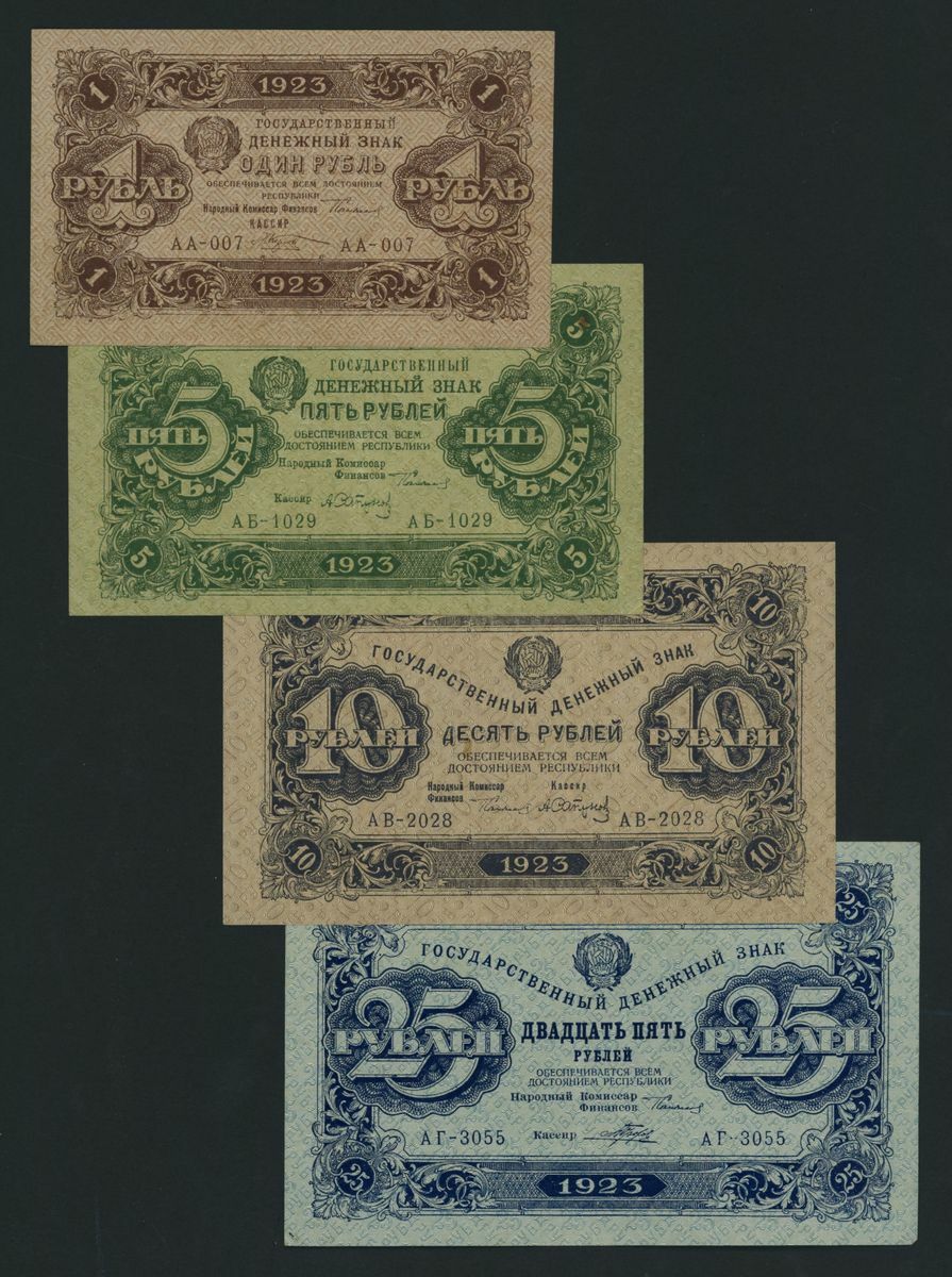 State Currency Notes, Russia, [7 notes] 1, 5, 10, 25, 50, 100, 250 Rubles, 1923, first issue, serial numbers: AA 007 (P156); AB 1029 (P157); AV 2028 (P158); AG 3055 (P159); AD 4068 (P160); AE 5054 (P161); AA 6046 (P162)