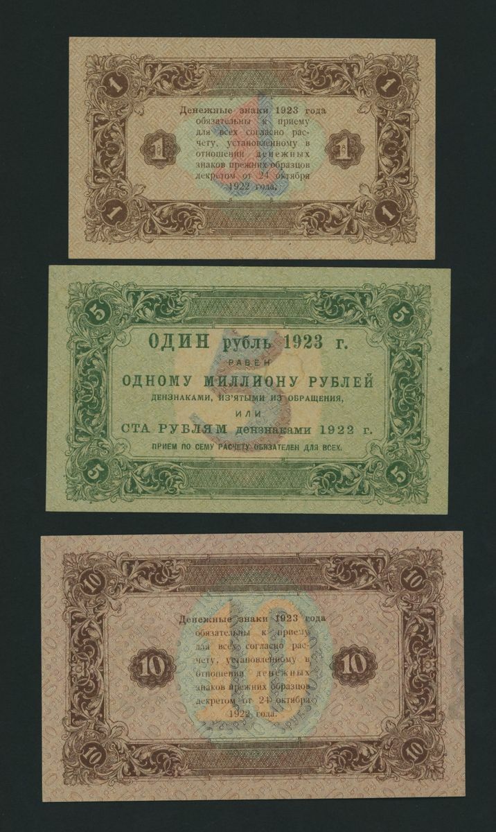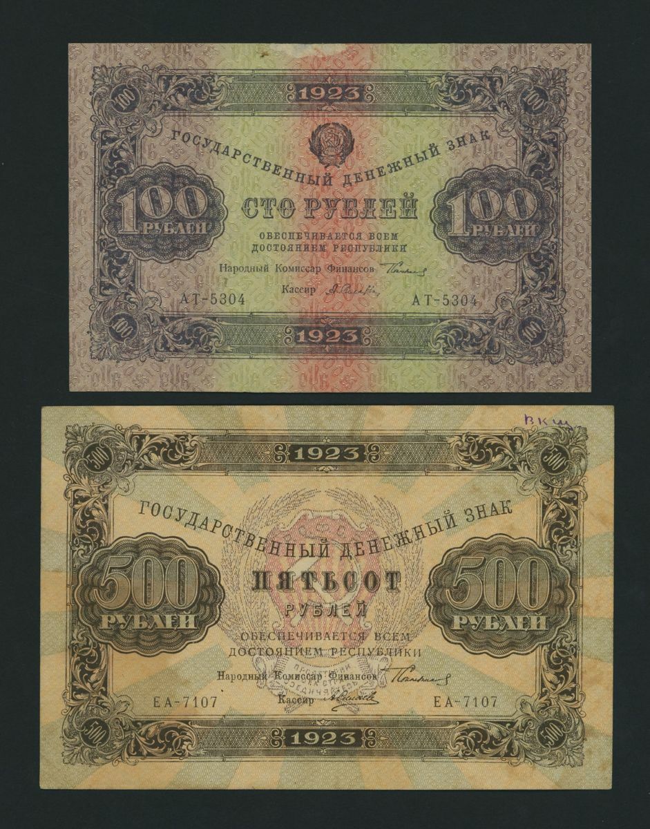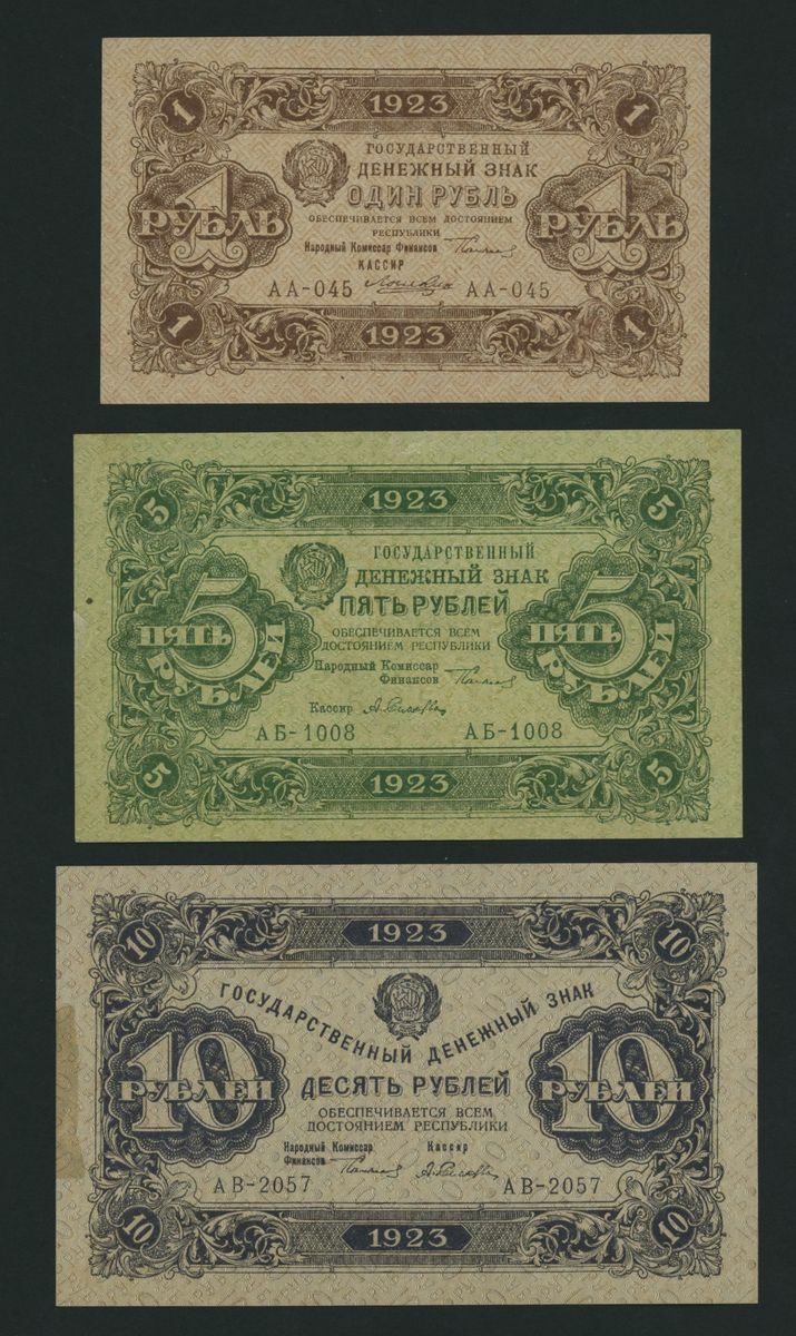 Soviet State Currency Notes, [5 notes] 1, 5, 10, 100, 500 Rubles, 1923, serial numbers: AA 045 (P163); AV 2057 (P165); AT 5304 (P168); EA 7107