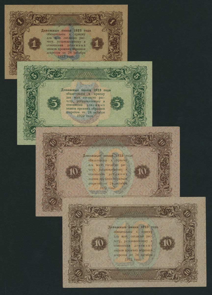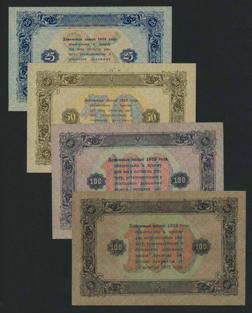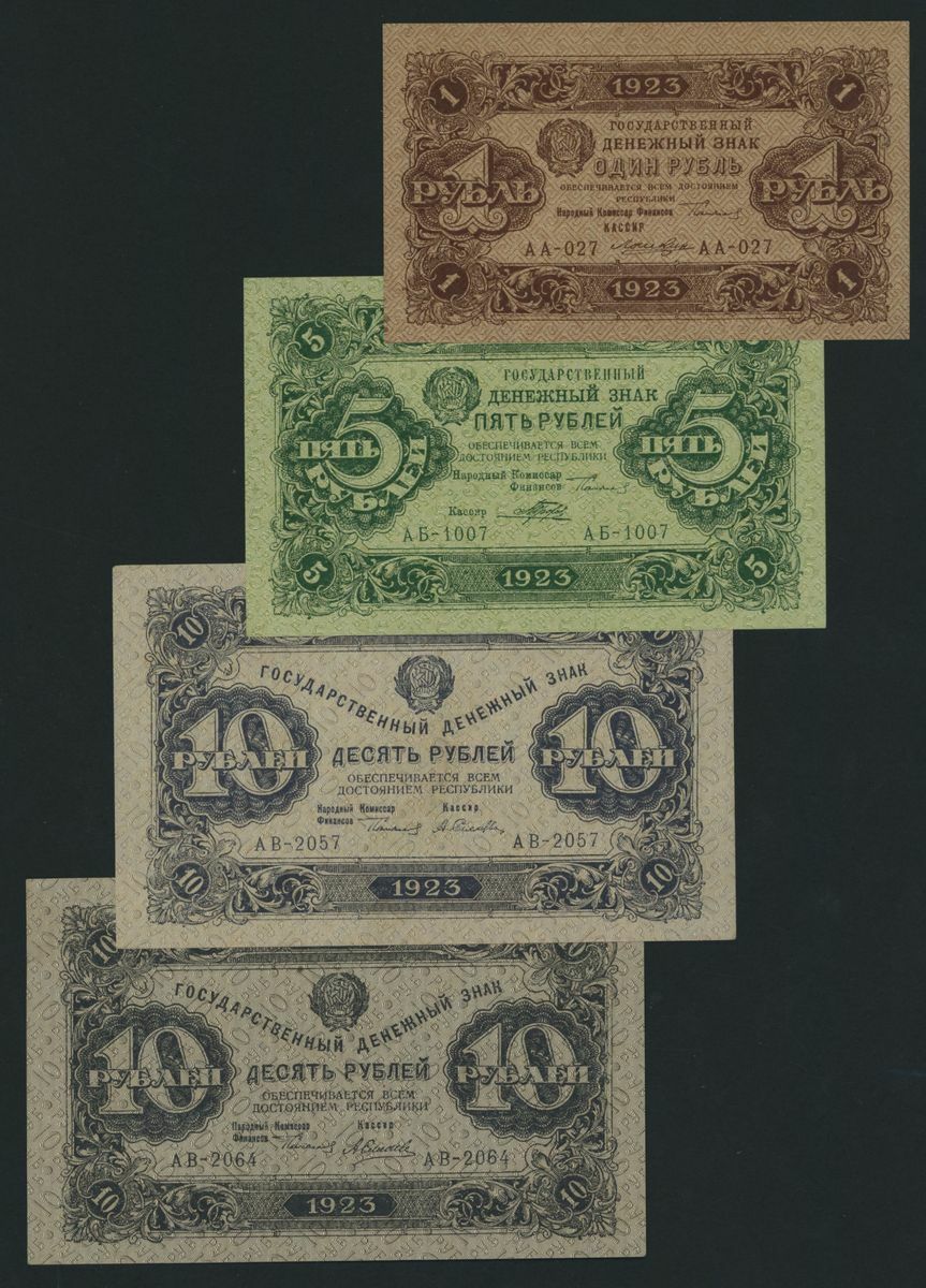 Soviet State Currency Notes, [8 notes] 1, 5, 10, 25, 50, 100 Rubles, 1923, second issue, serial numbers: AA 027 (P163); AB 1007 (P164); AV 2057 (P165); AV 2064 (P165); AG 3092 (P166); AD 4085 (P167); AO 5263 (168); ATS 5406 (168)