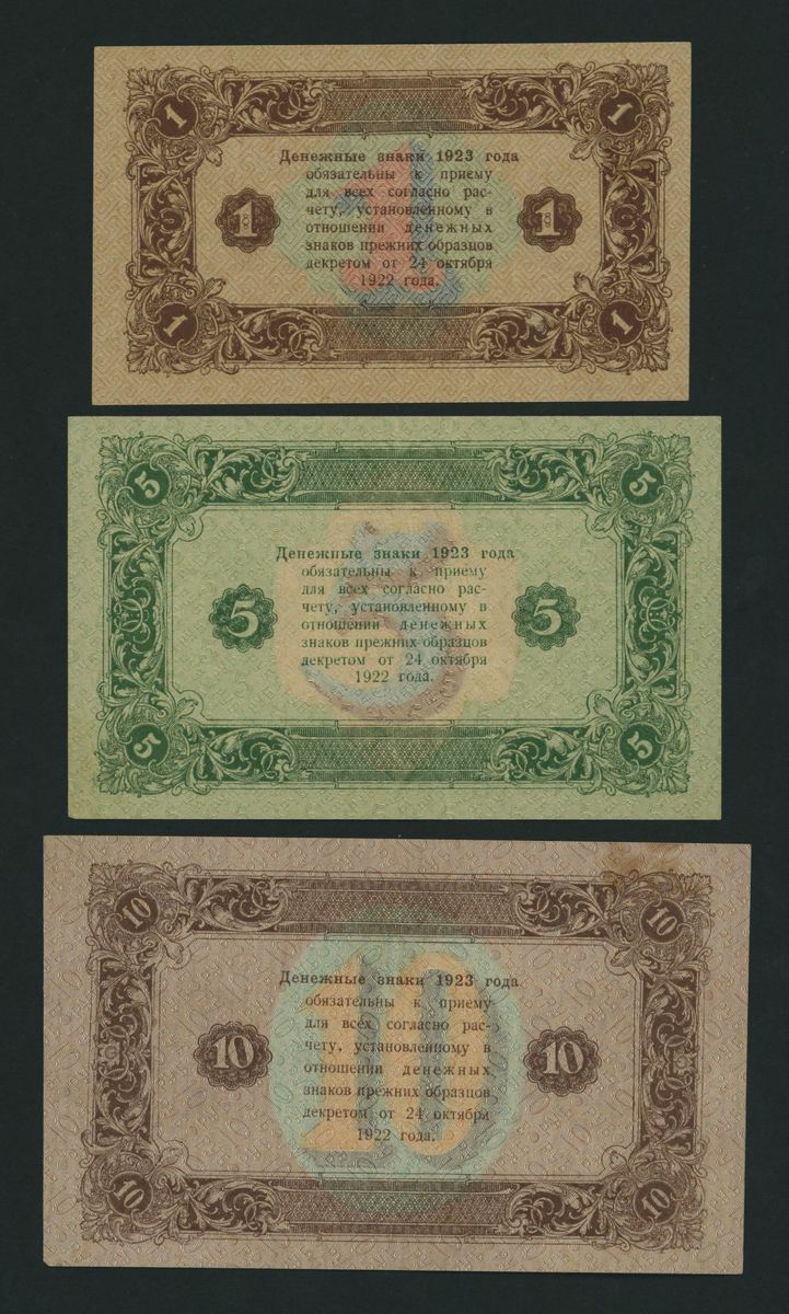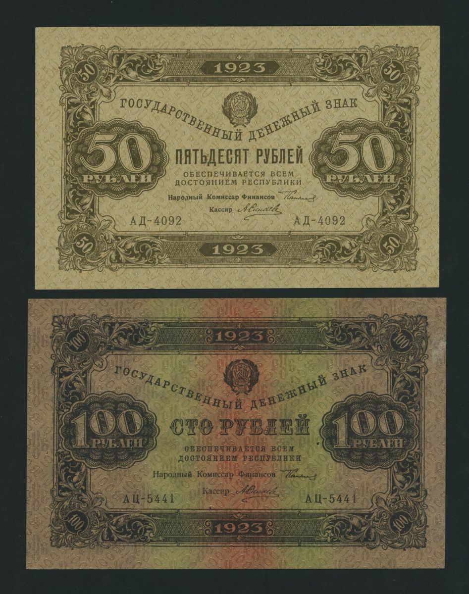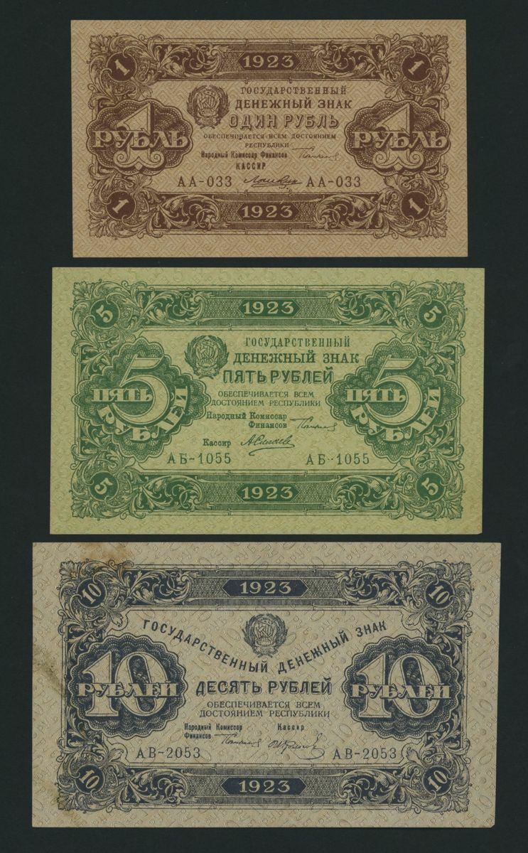 Soviet State Currency Notes, [5 notes] 1, 5, 10, 50, 100 Rubles, 1923, second issue, serial numbers: AA 033 (P163); AB 1055 (P164); AV 2053 (P165); AD 4092 (P167); ATS 5441 (P168)