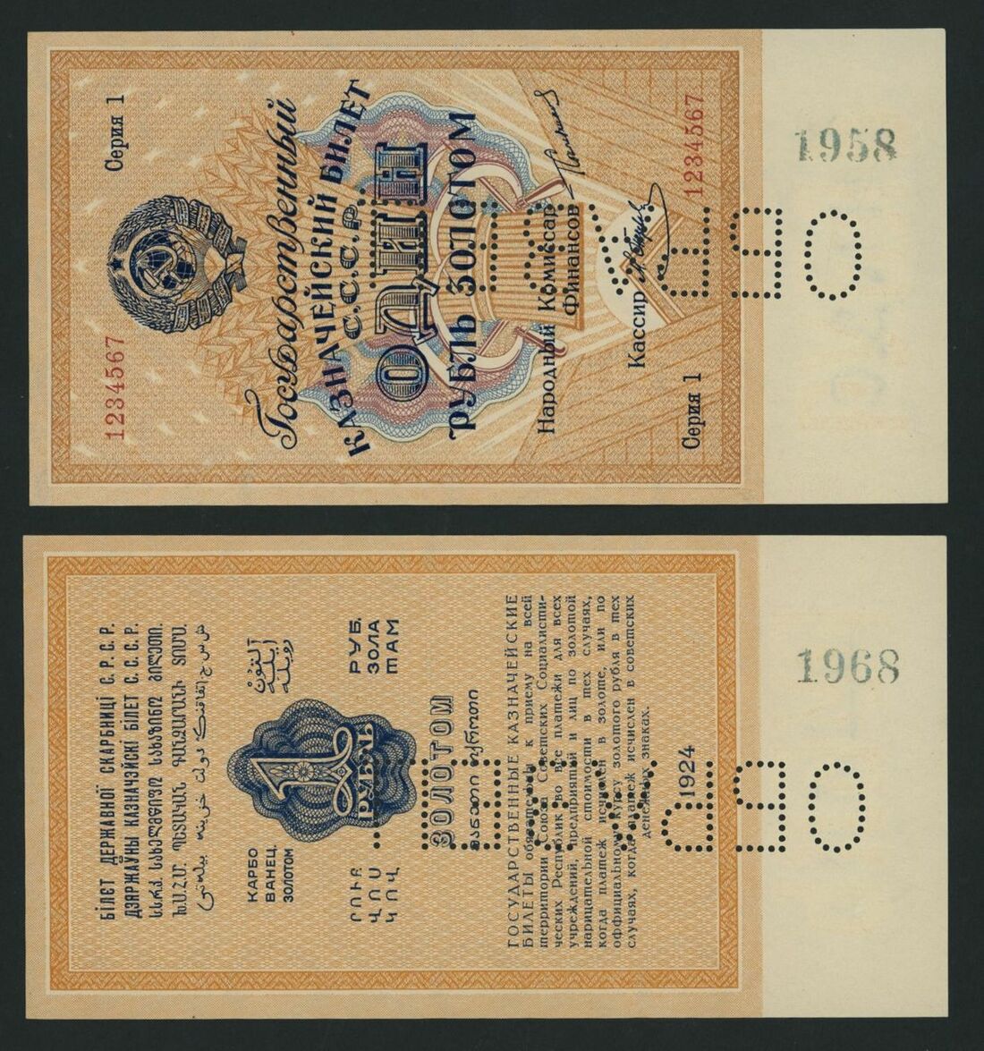 Soviet State Currency Notes, [2 notes] 1 Gold Ruble, 1924, serial number 1234567, obverse and reverse specimens