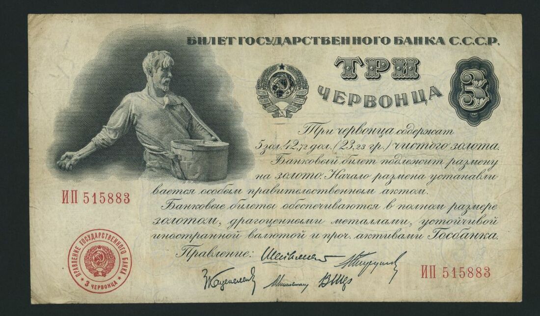 Soviet National Banknotes, 3 Chervontsa, 1924, serial number IP 515883, banknote and medallion stamps (8)
