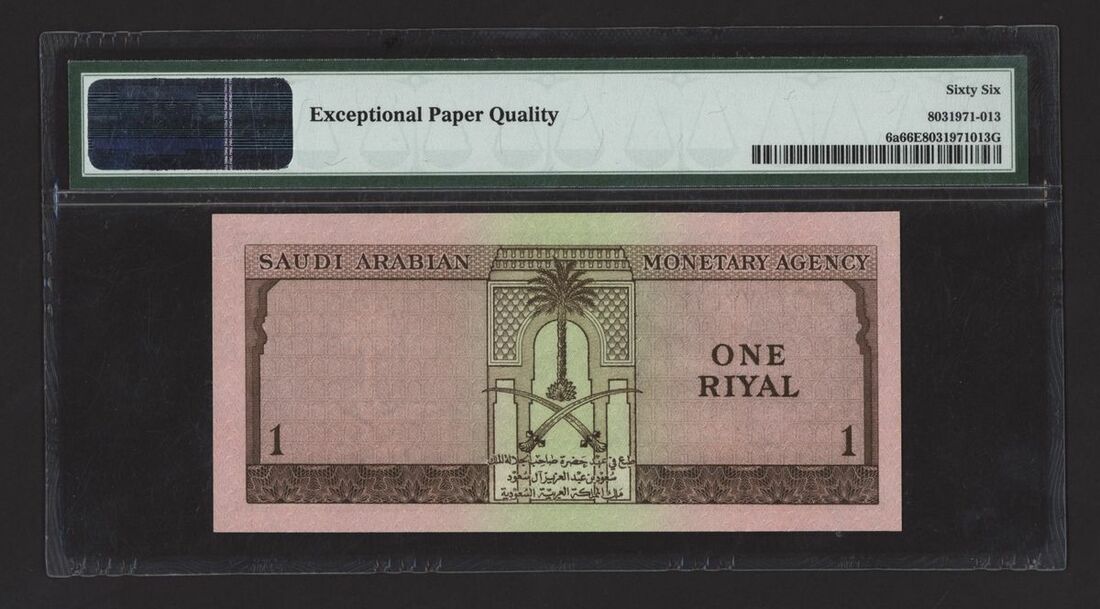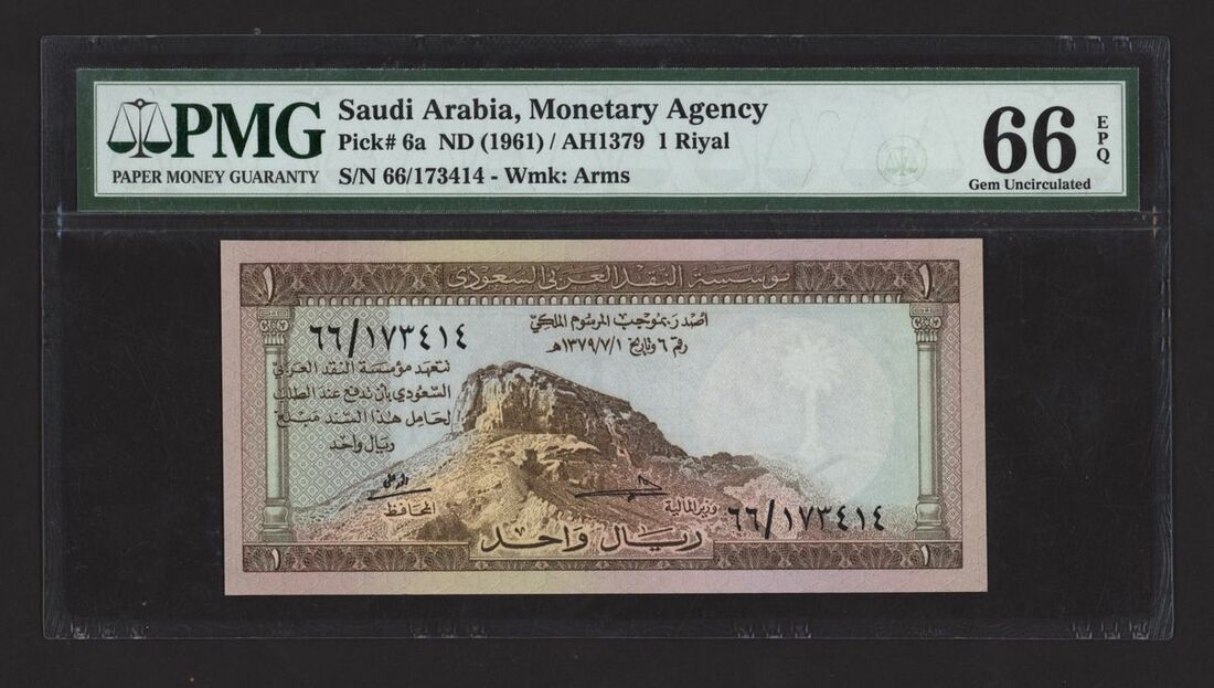 (x) Monetary Agency, Saudi Arabia, 1 Riyal, ND (1961), serial number 66/173414, (Pick 6a, BNB 105), in PMG holder 66 EPQ Gem Uncirculated