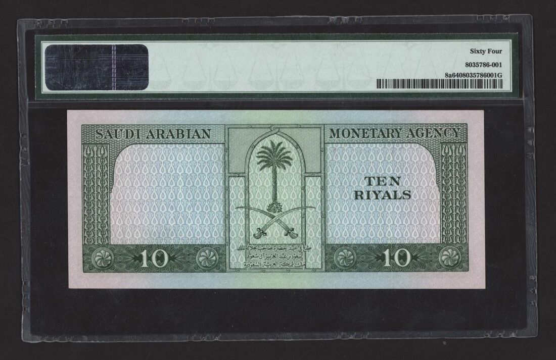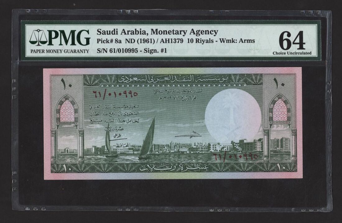 (x) Monetary Agency, Saudi Arabia, 10 Riyals, ND (1961), serial number 61/010995, (Pick 8a, BNB 107), in PMG holder 64 Choice Uncirculated
