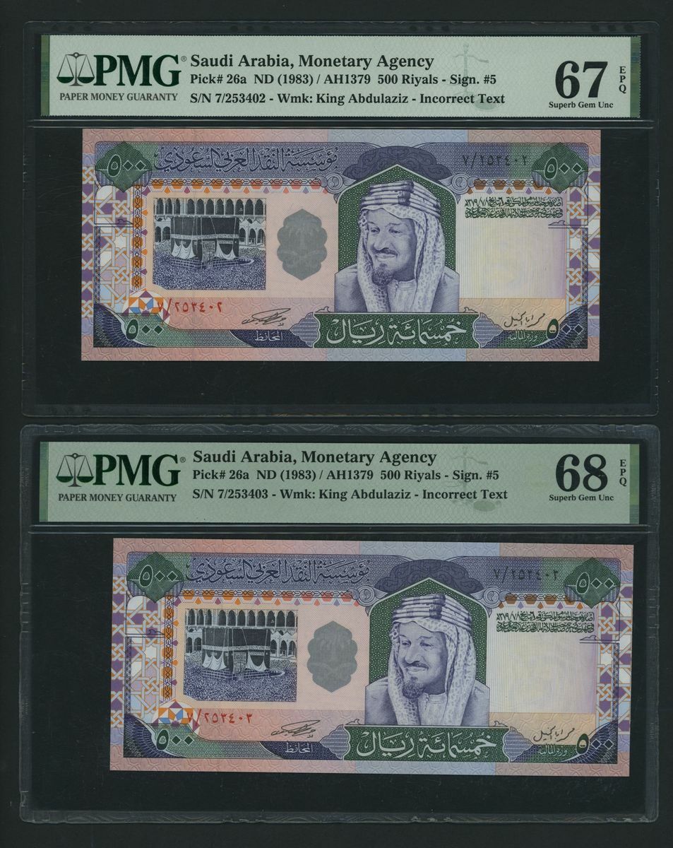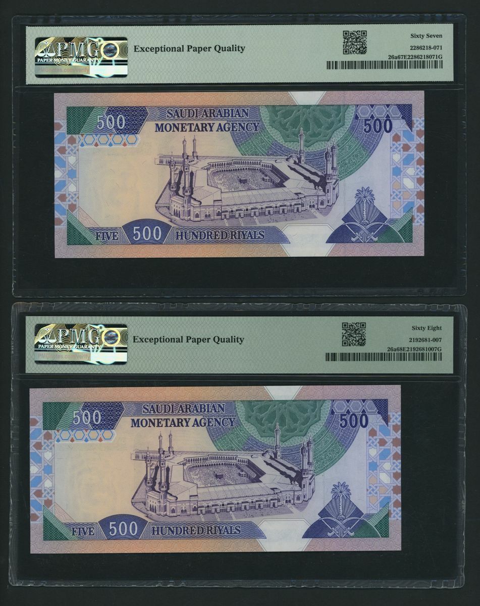 Saudi Arabia, Monetary Authority, [2 notes] 500 Riyals, ND (1983), serial number 7/253402-3, (Pick 26a, BNB 125a), in PMG holders 67 EPQ Superb Gem Uncirculated and 68 EPQ Superb Gem Uncirculated (2 notes)