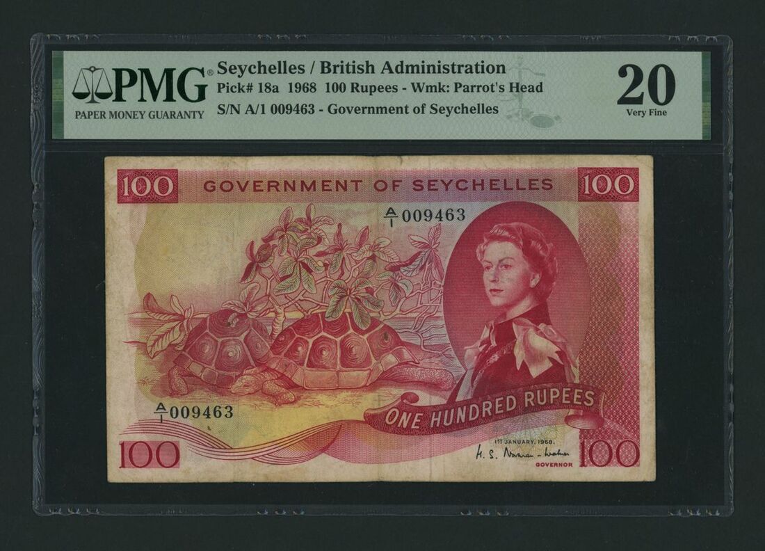 (x) Seychelles, British Administration, 100 Rupees, 1st January 1968, serial number A/1 009463, (Pick 18a, BNB 125), in PMG holder 20 Very Fine