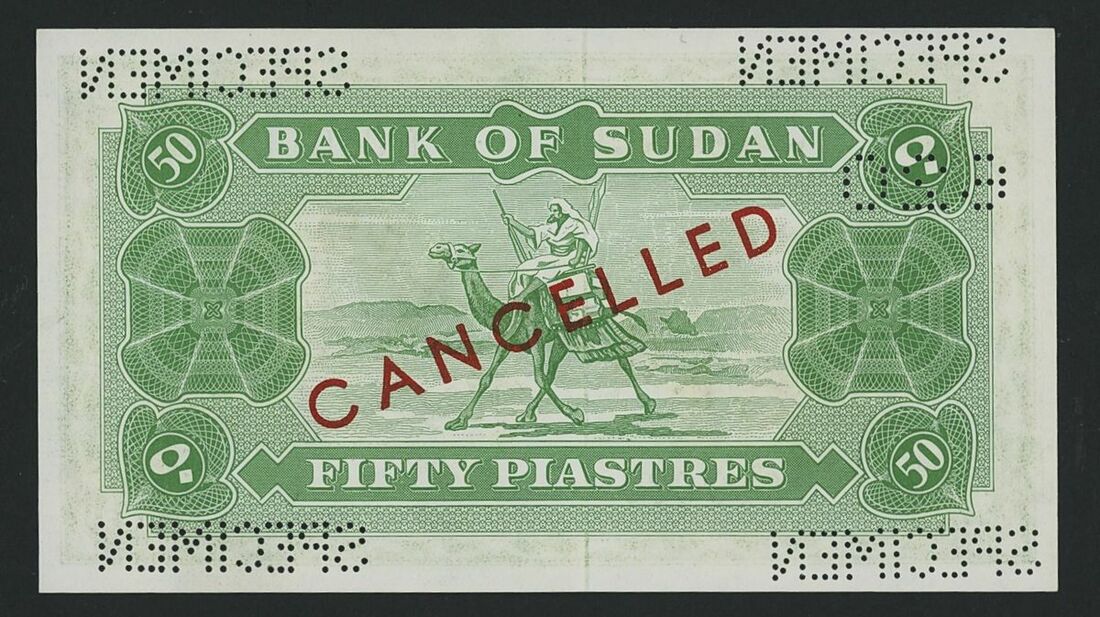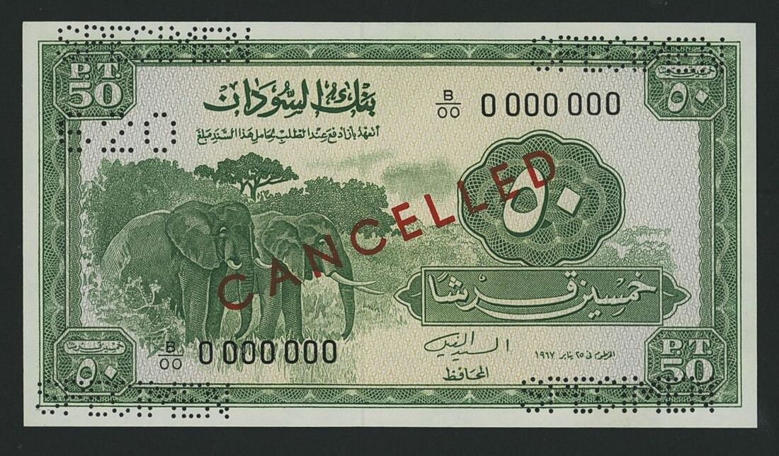 Bank of Sudan, cancelled specimen 50 Piastres, 1967, serial number B/00 0000000 620, (Pick 7bs), about uncirculated