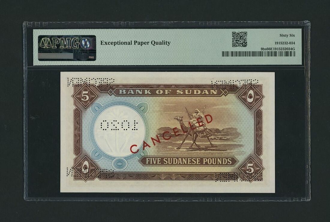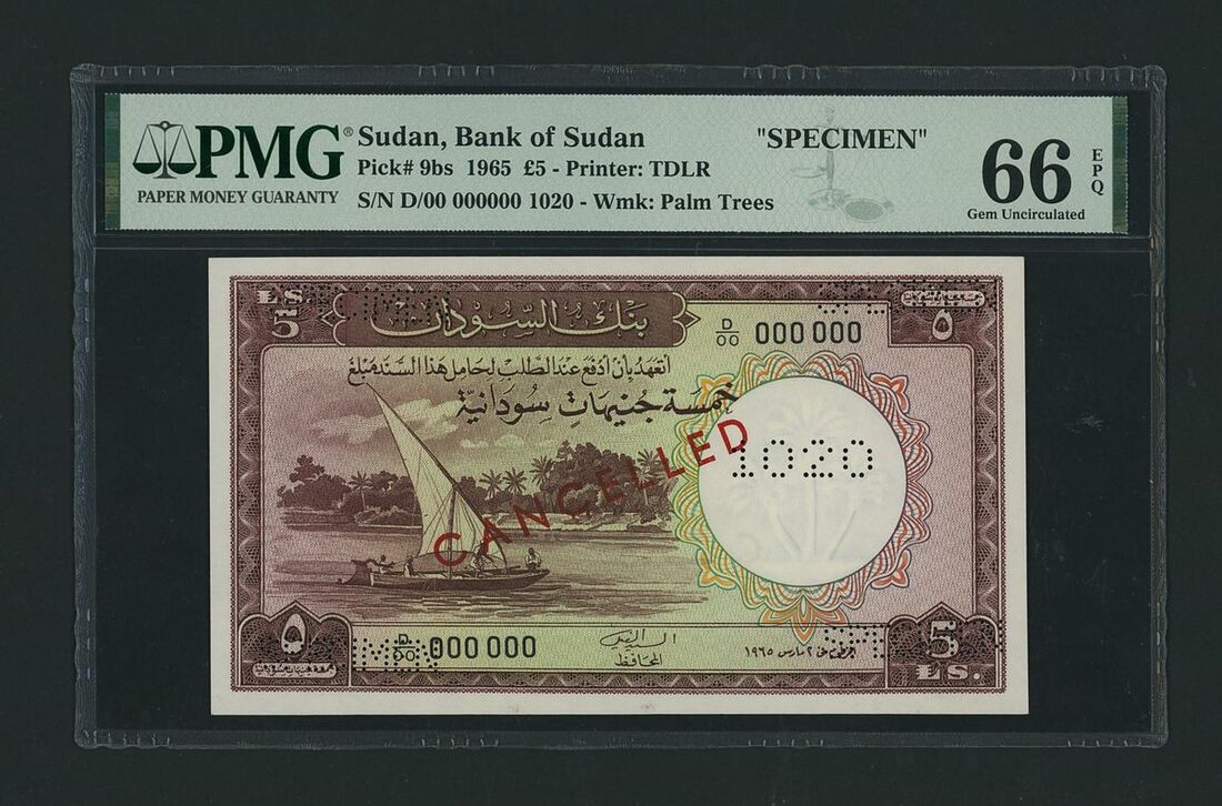 (x) Bank of Sudan, specimen £5, 1965, serial number D/00 000000 1020, (Pick 9bs, BNB 304), in PMG holder 66 EPQ Gem Uncirculated