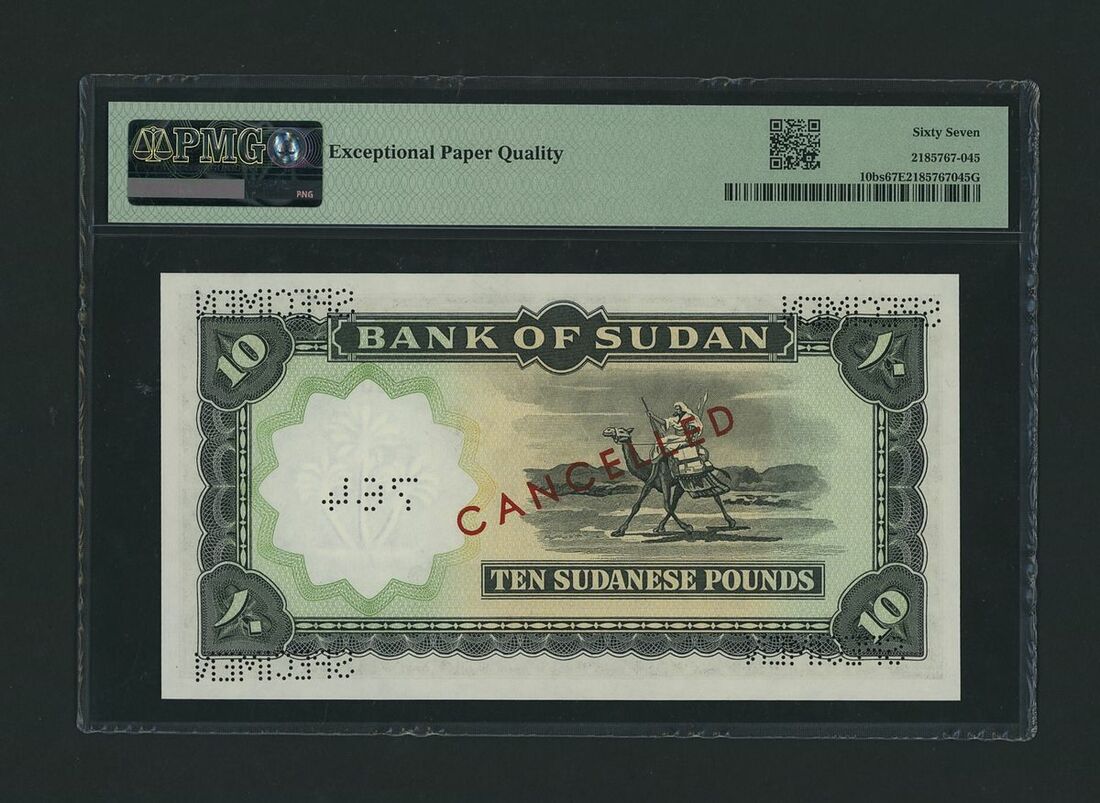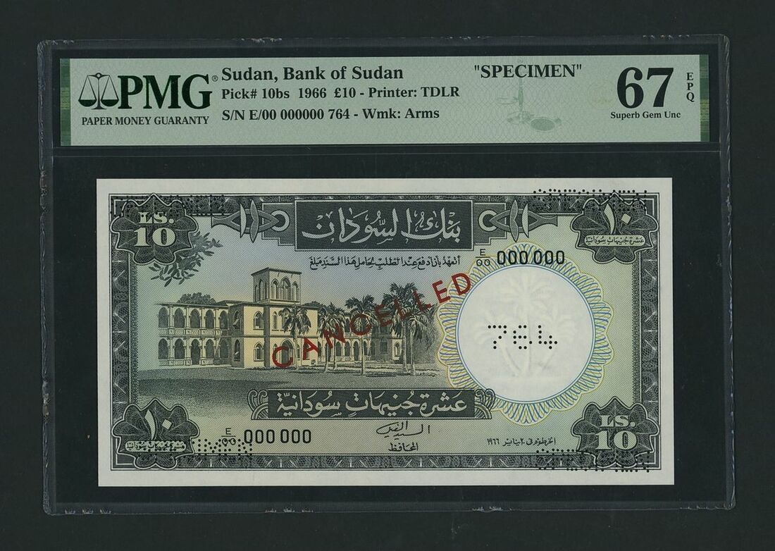 (x) Bank of Sudan, specimen £10, 1966, serial number E/00 000000 764, (Pick 10bs, BNB 305), in PMG holder 67 EPQ Superb Gem Uncirculated
