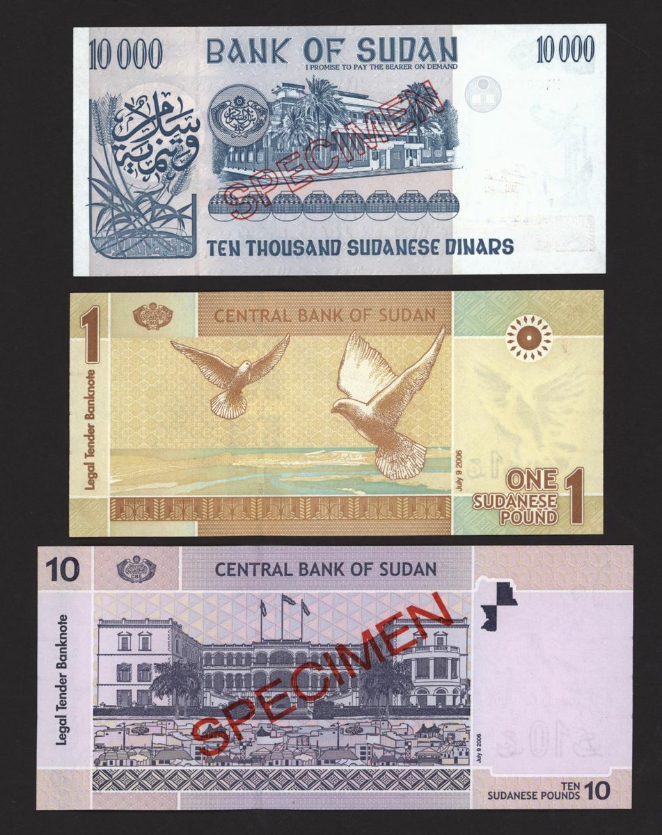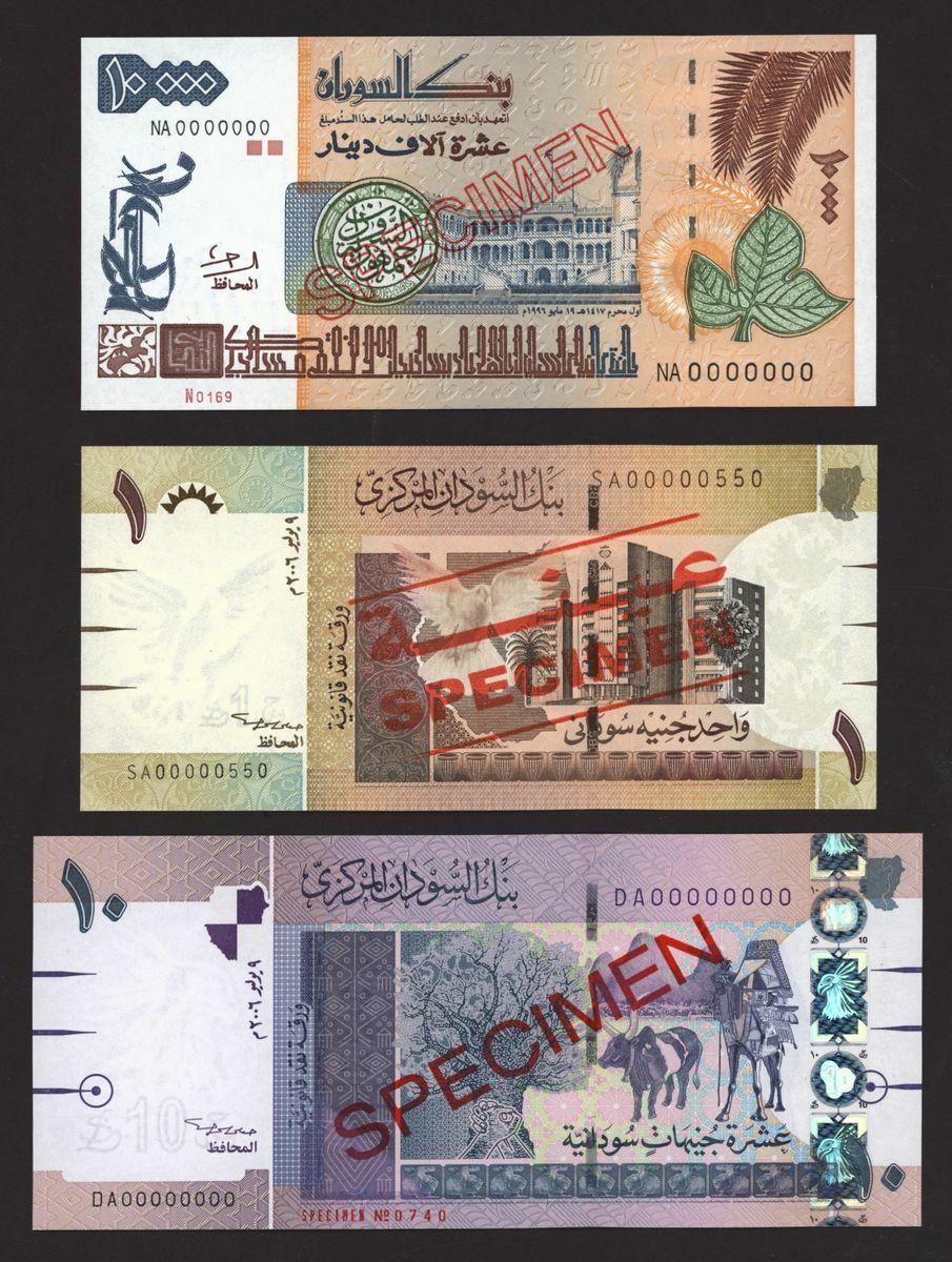 (x) Bank of Sudan, Central Bank, [3 notes] specimens 10000 Dinars, 1, 10 Pounds, 1996-2006, 10000 Dinars, 1996, serial number NA 0000000 0169; 1 Pound, 9th July 2006, serial number SA00000550; 10 Pounds, 9th July 2006, serial number DA00000000 0740