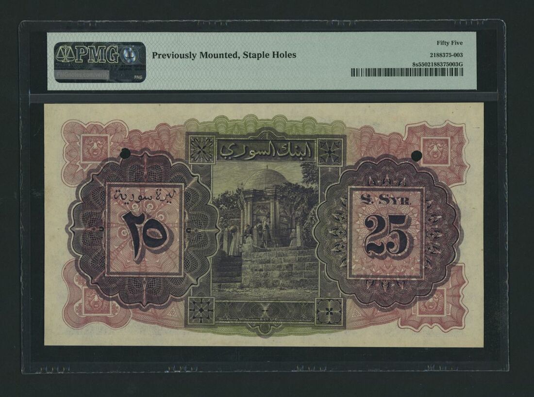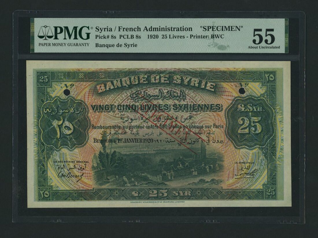 Syria / French Administration, Banque de Syrie, specimen 25 Livres, Beirut, 1 January 1920, (Pick 8s, BNB 109as1), in PMG holder 55 About Uncirculated, previously mounted, staple holes