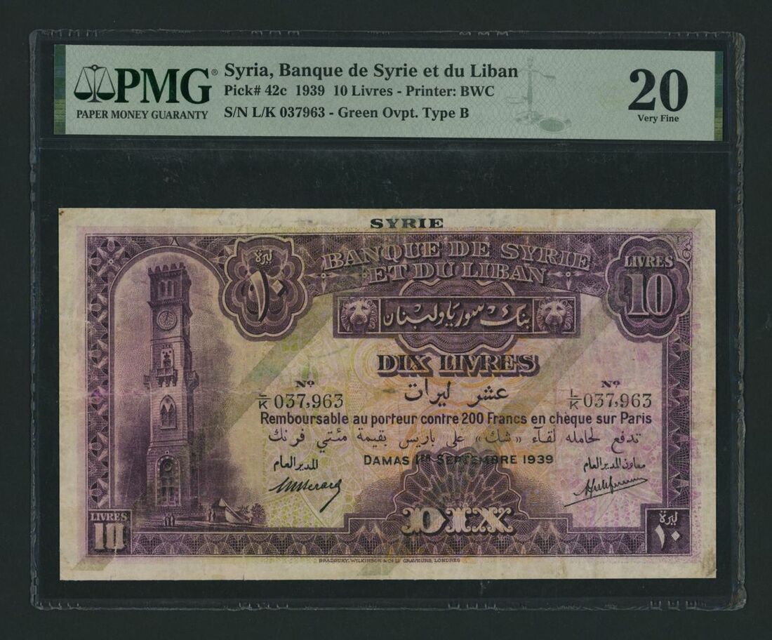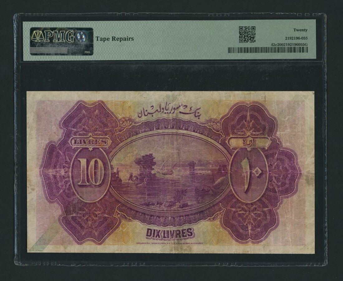 Banque de Syrie et du Liban, Syria, 10 Livres, Damascus, 1 September 1939, serial number L/K 037963, (Pick 42c, BNB 303c), in PMG holder 20 Very Fine, tape repairs