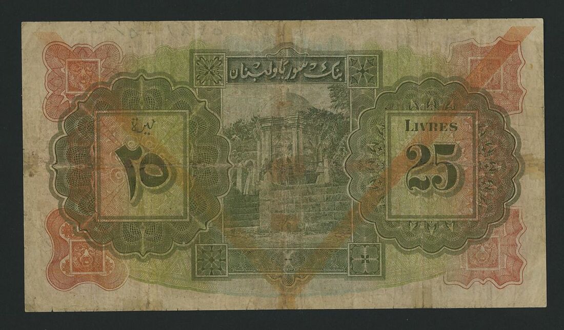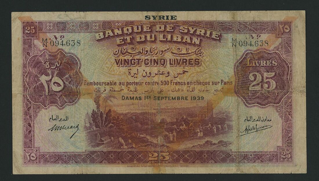 Banque de Syrie et du Liban, Syria, 25 Livres, 1st September 1939, serial number M/N 094638, (Pick 43a, BNB 304), fine, tape repairs