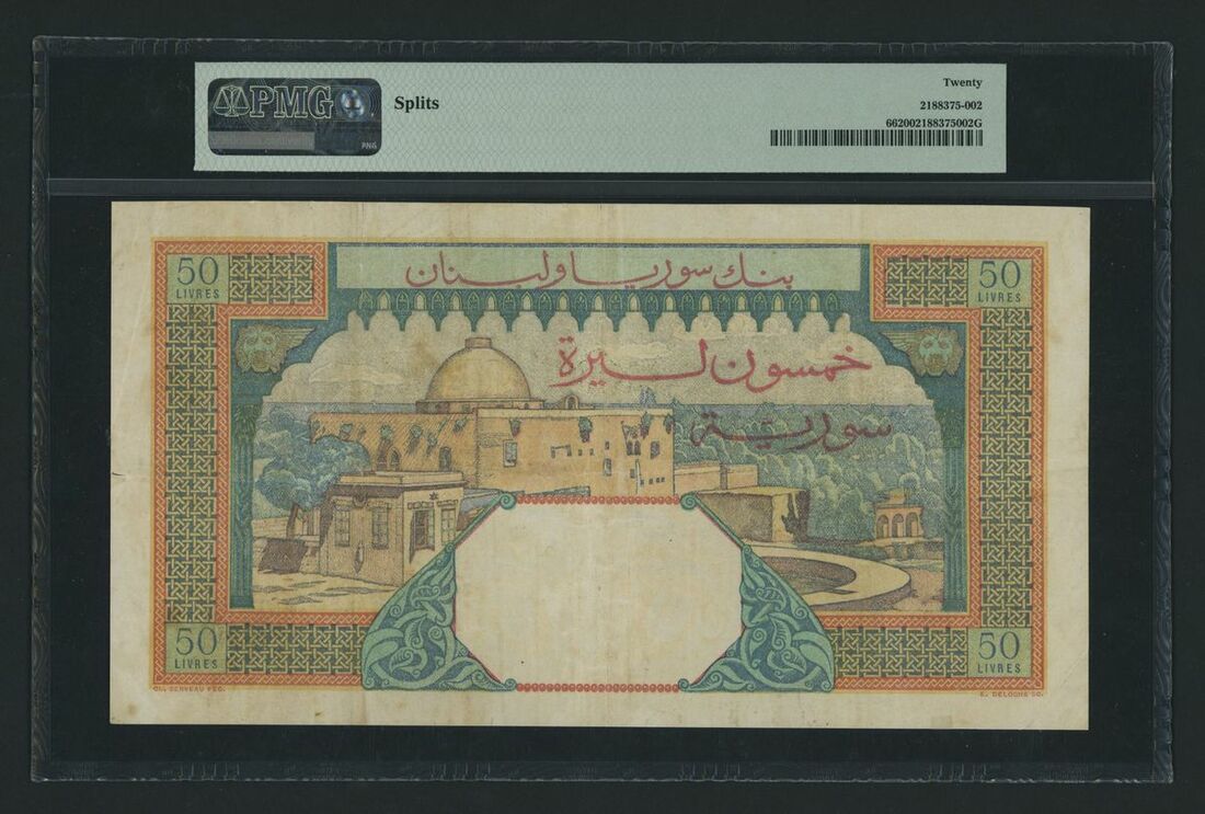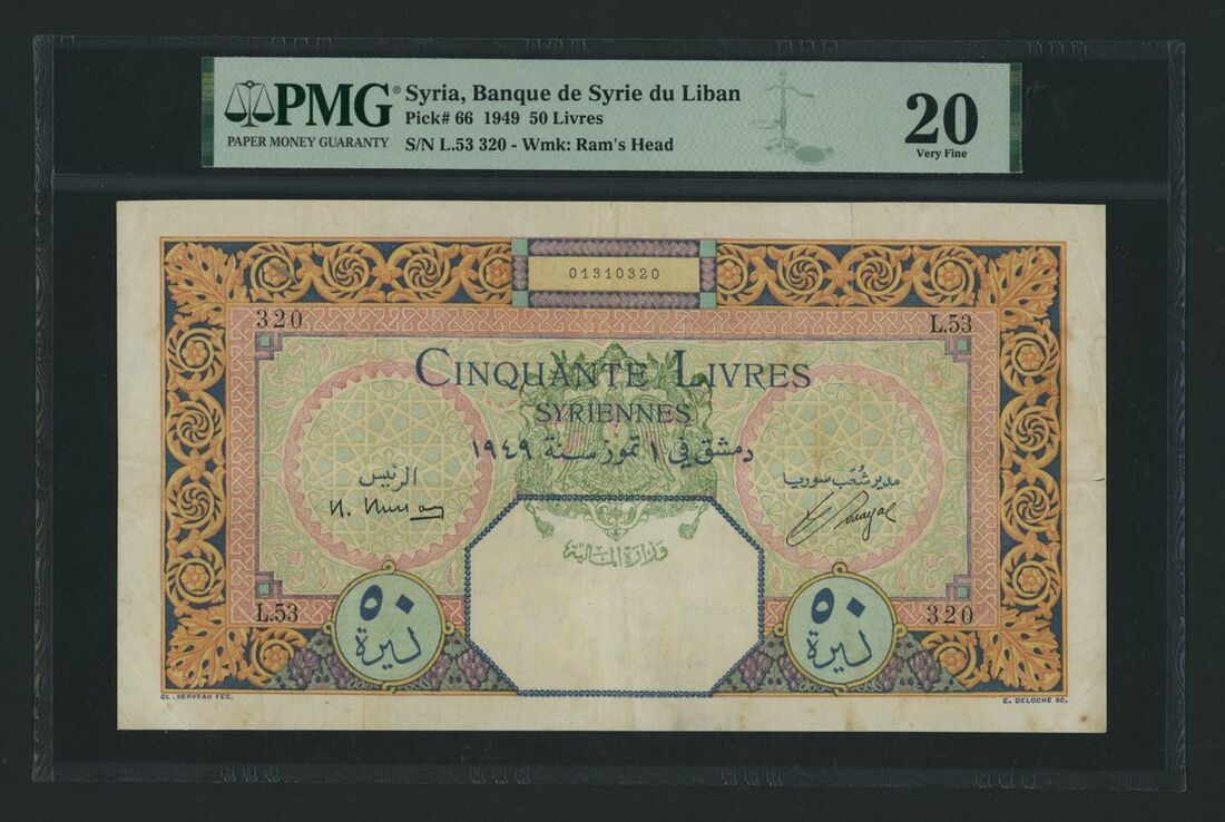 Banque de Syrie et du Liban, Syria, 50 Livres, ND (1949), serial number L.53 320, (Pick 66, BNB 313b), in PMG holder 20 Very Fine, splits, scarce