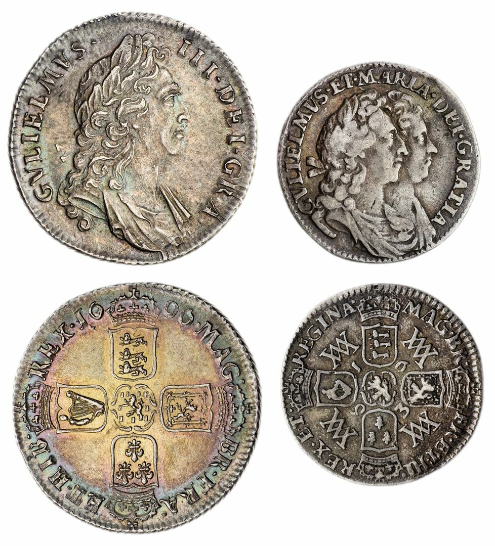 William and Mary (1688-1694), Sixpence, 1693, conjoined laureate and draped busts right, rev. crowned cruciform shields, WM in angles, four strings to harp, obliquely milled edge, 2.94g [45.4grns], 7h (ESC 1529; Bull 869; Spink 3438), worn at the higher points, toned, good fine; and William III, Solus (1694-1702), Shilling, 1696, first laureate and draped bust right, rev. crowned cruciform shields, obliquely milled edges, 5.84g [90.1grns] (ESC 1078; Bull 1104; Spink 3497), light wear to the higher points, otherwise beautifully toned with colourful hues, extremely fine (2)