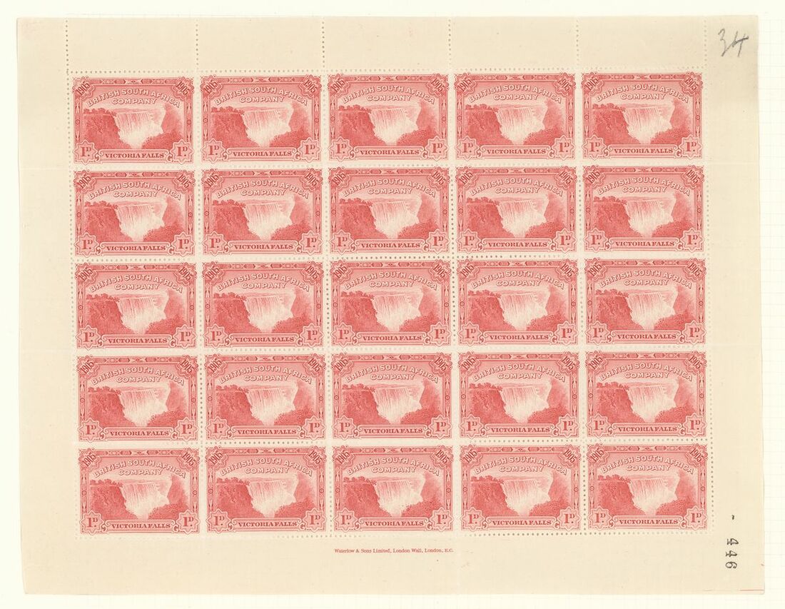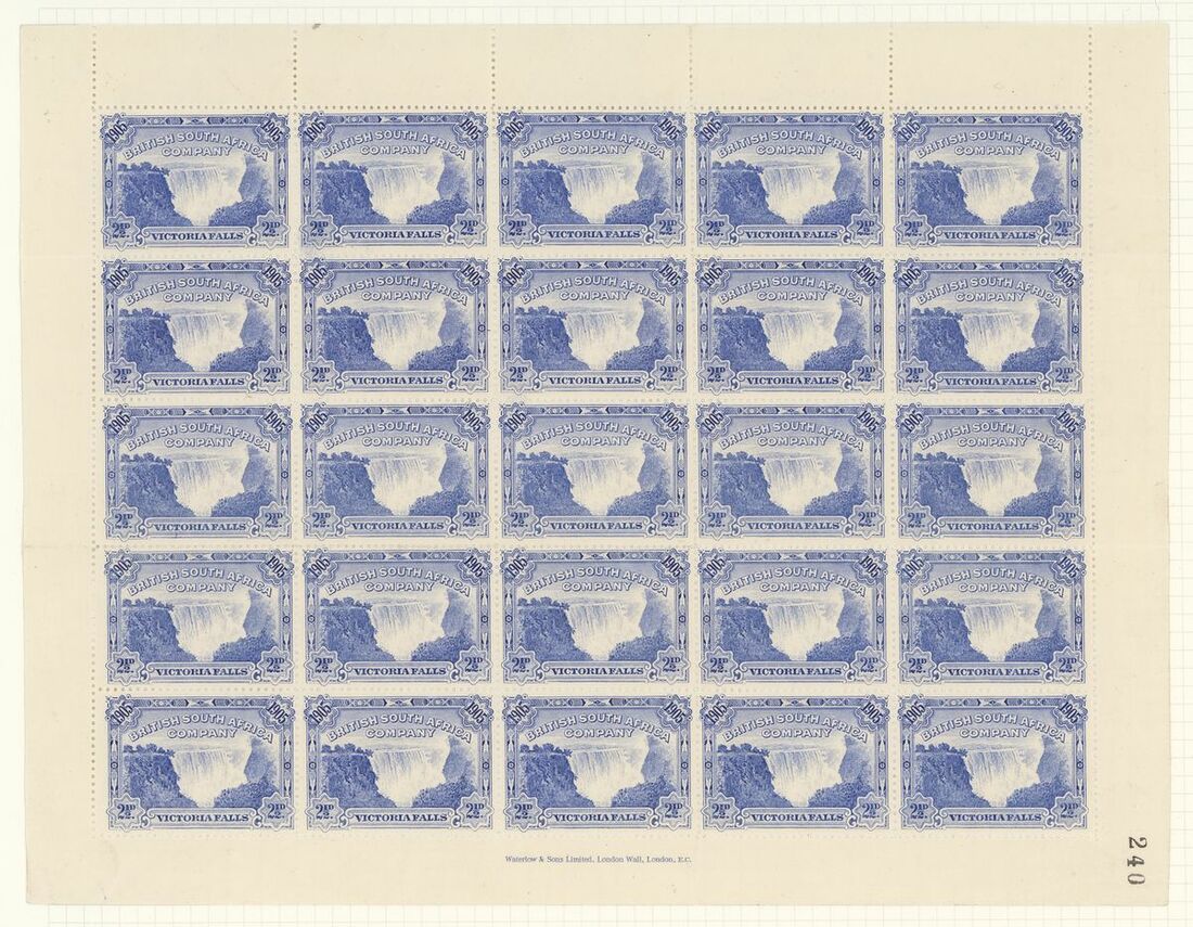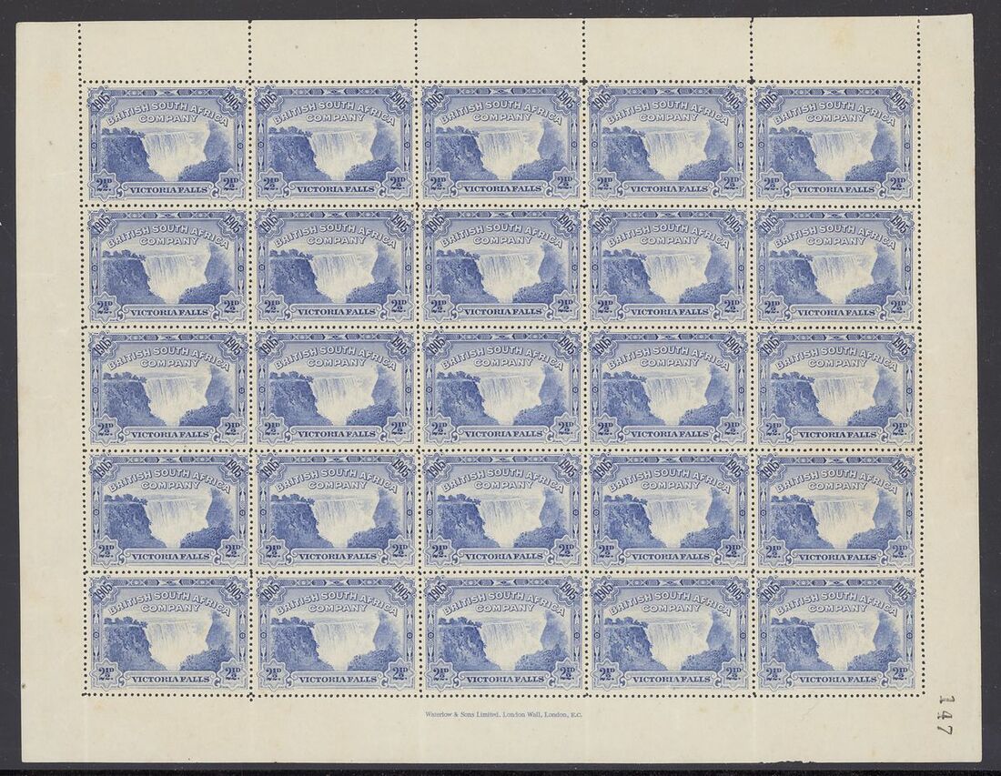 1905 Victoria Falls perf. 14 1d. red, perf. 14 2½d. deep blue and perf. 14½-15 2½d. deep blue, each in a complete sheet of twenty-five; full original gum, fine. S.G. 94, 95, 95a, £1,650