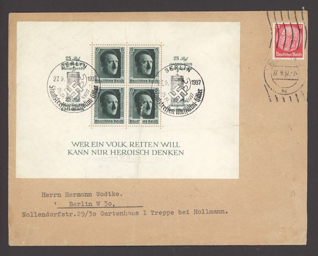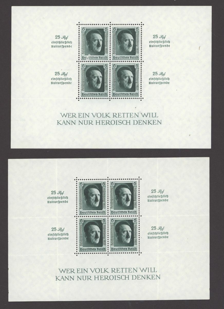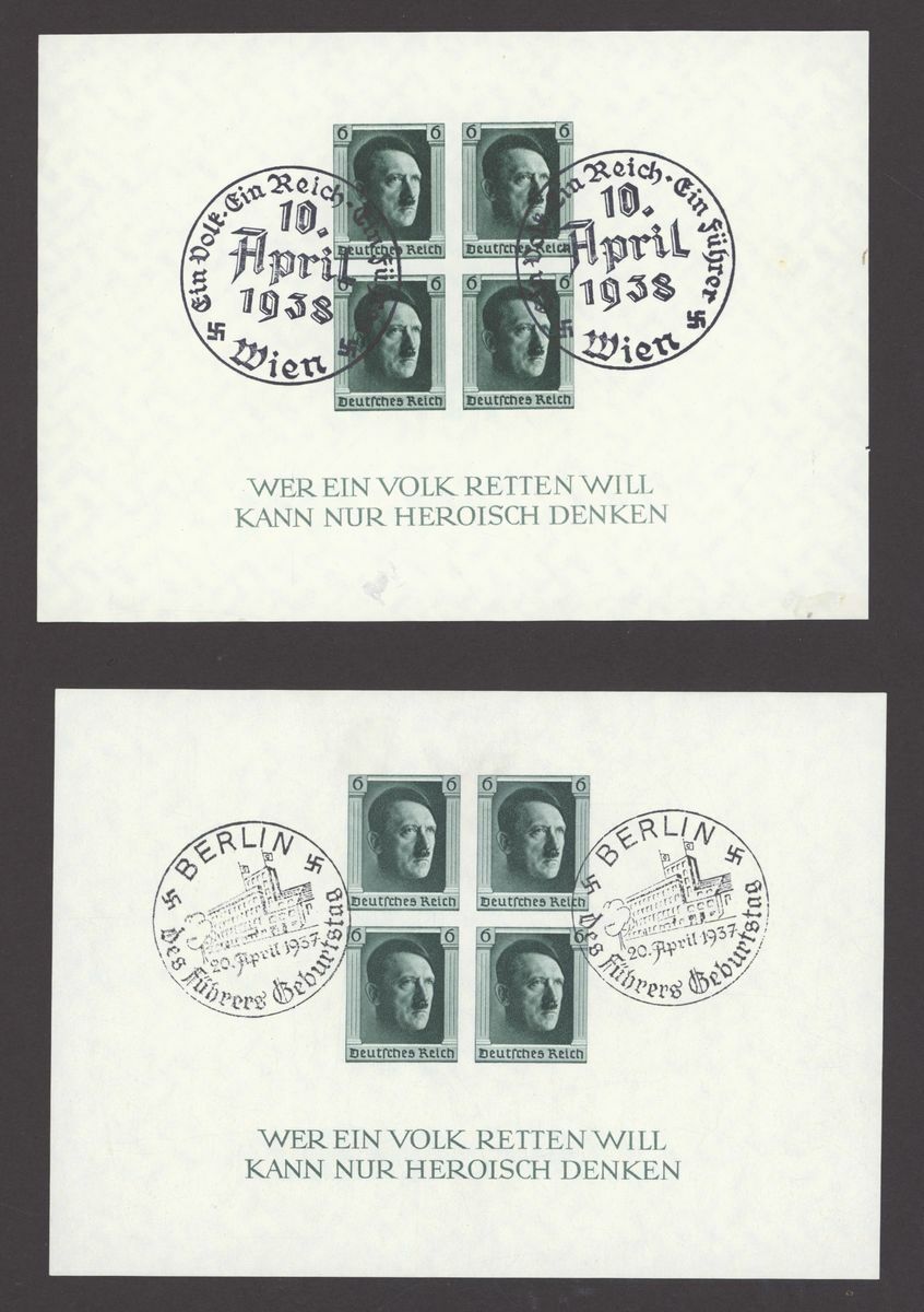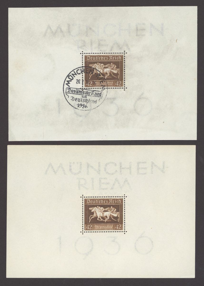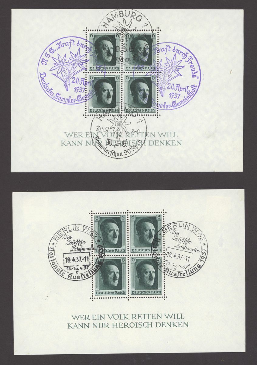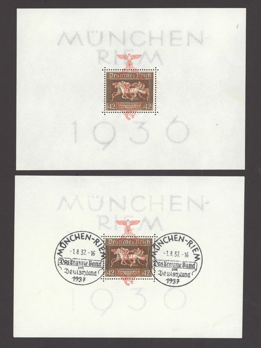 1936 Brown Ribbon miniature sheet (4 mint, 1 used), 1936 Olympics miniature sheets (4 used sets), 1937 Culture fund perf. (7 mint, 9 used with one on cover), imperf. (2 mint, 5 used), rouletted 3 mint, 2 used, one is cut down), 1937 Brown Ribbon miniature sheet (mint and used), 1937 Nuremberg Congress (3 mint and 3 used;); mixed condition