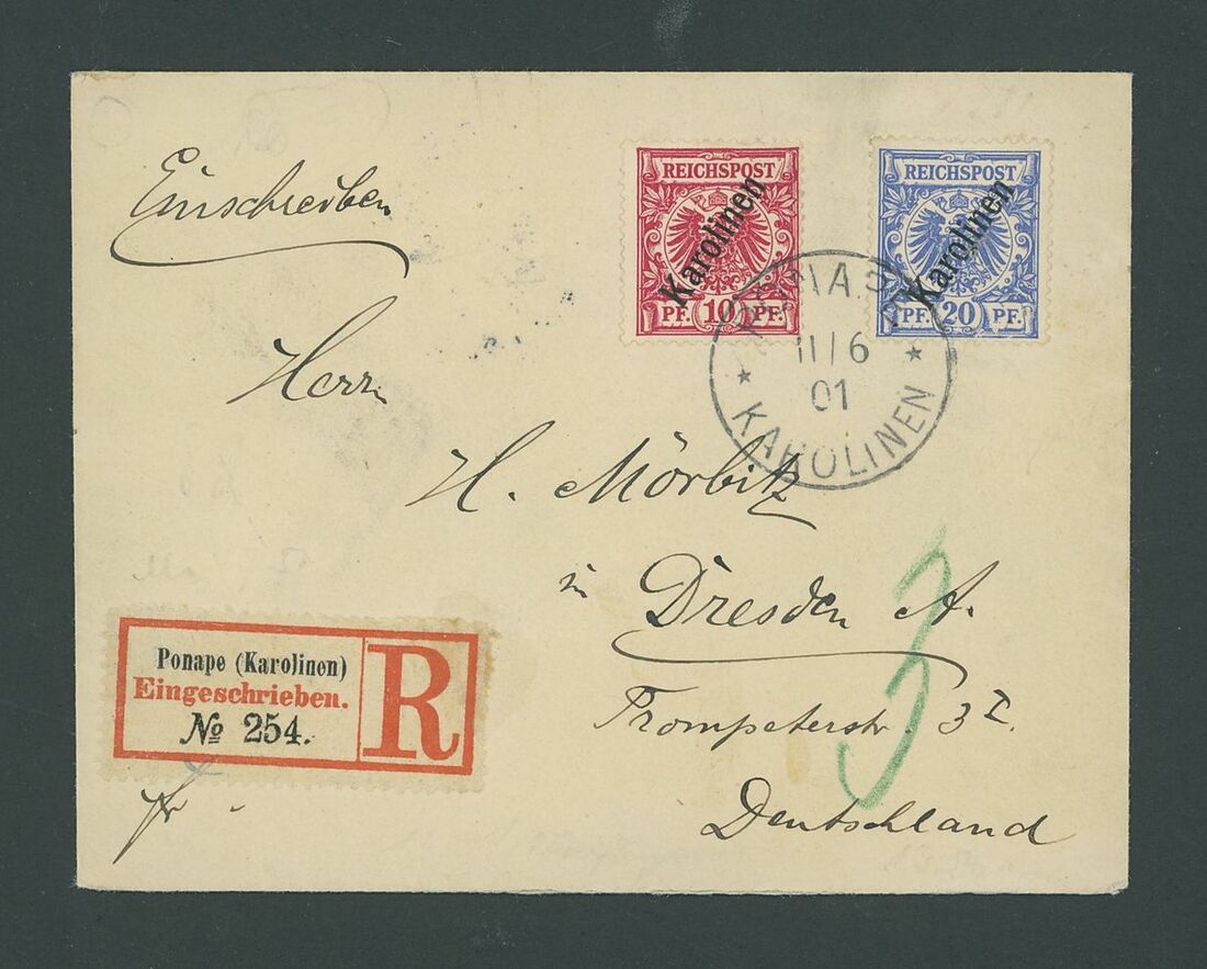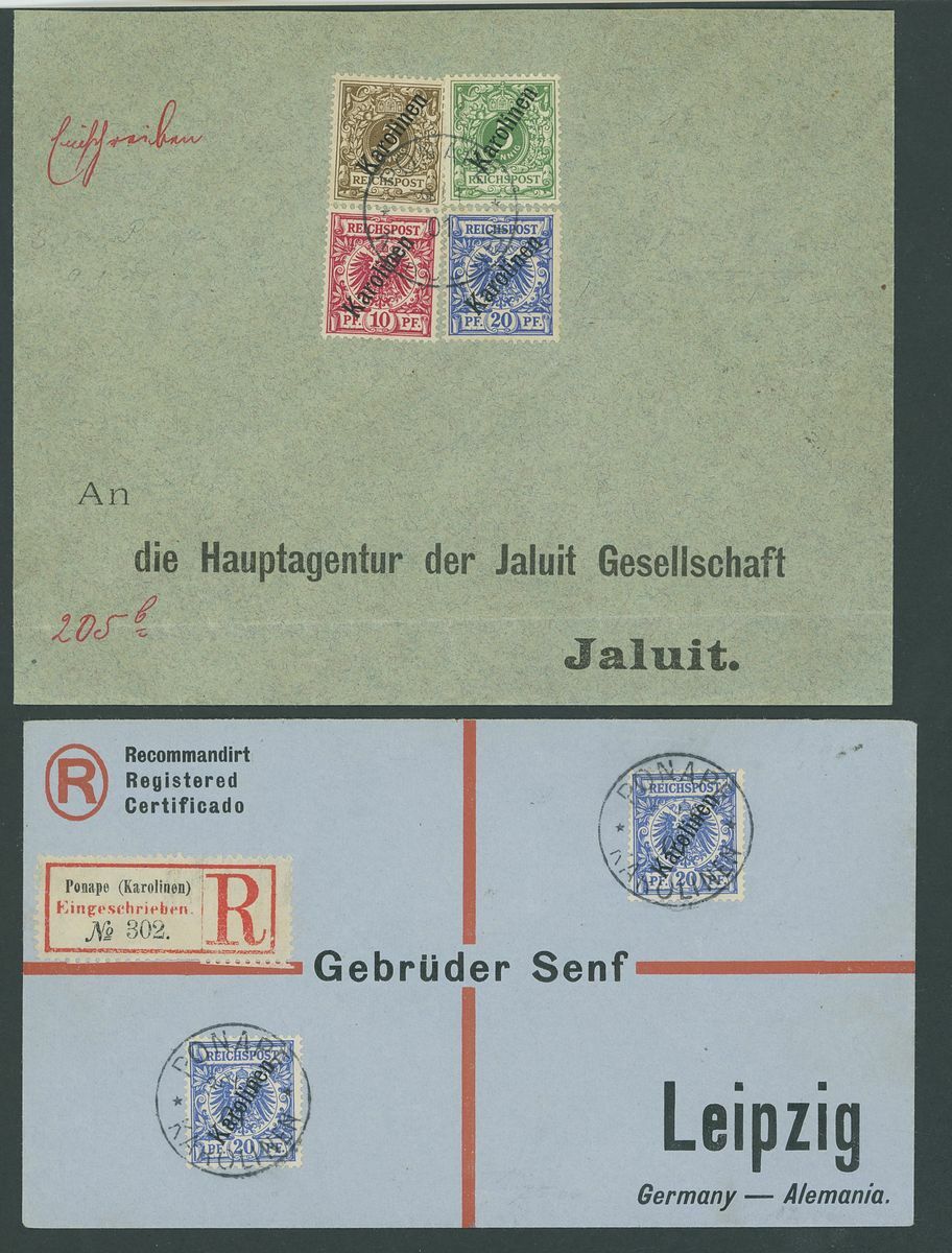 1899-1900 48 degree overprint 20pf., used with 56 degree 3pf., 5pf. and 10pf. on cover from Ponape to Jailut, 56 degree 10pf. and 20pf. ob cover Registered from Ponape to Dresden, 20pf. (2) on Senf Bros. cover Registered from Ponape to Leipzig; fine. S.G. 4, 7-11