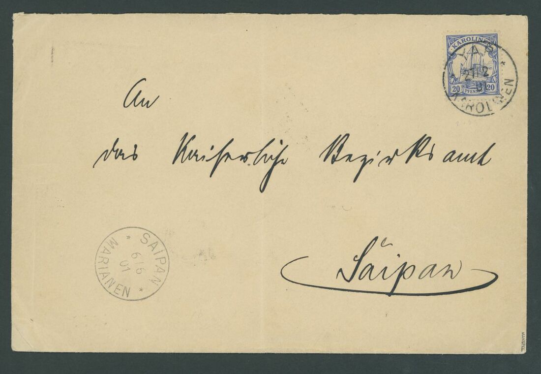 20pf., tied by Yap c.d.s. of 27 Feb. 1901 to envelope to Saipan and with arrival on 6 June 1901; light vertical filing fold, fine and scarce inter island mail. S.G. 16
