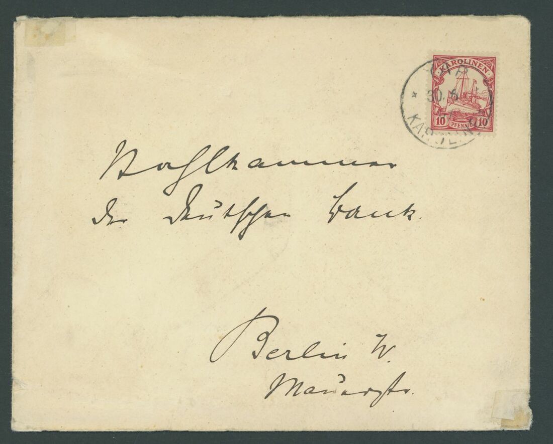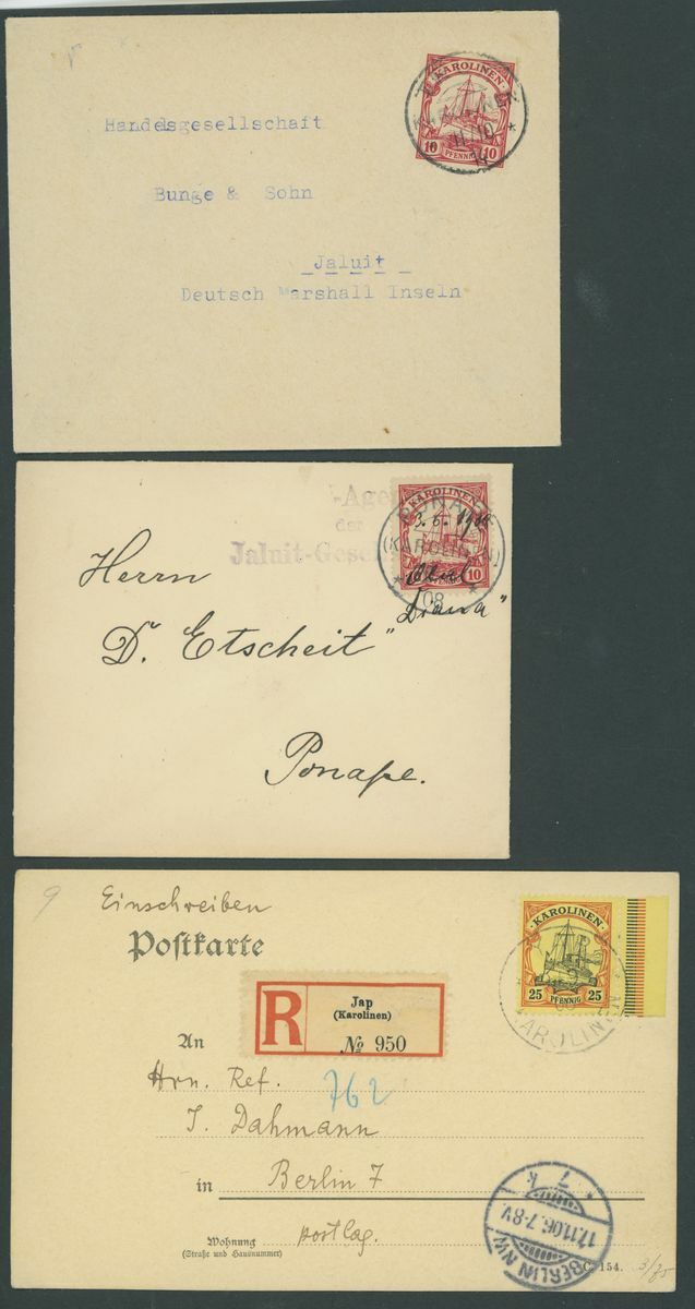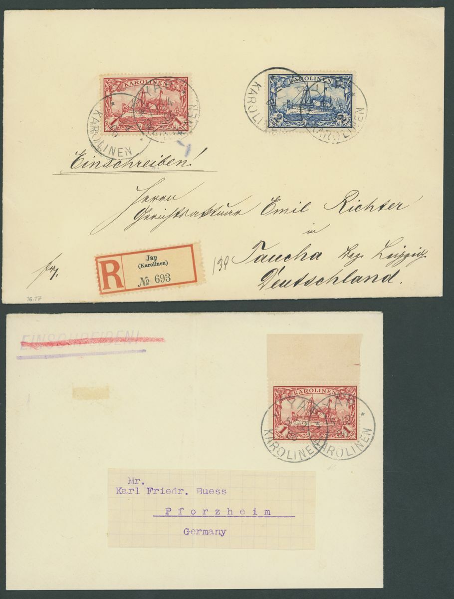 Selection of five covers and a card, including 25pf. on card Registered from Yap to Berlin, 1m. on covers from Yap to Pforzheim, 1m. and 2m. on cover Registered from Yap To Taucha, 10pf. on cover from Yap to Berlin with blue Yap seal on the reverse, 10pf. on Ponape local cover with additional manuscript cancellation, etc.; good to fine