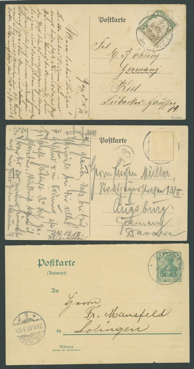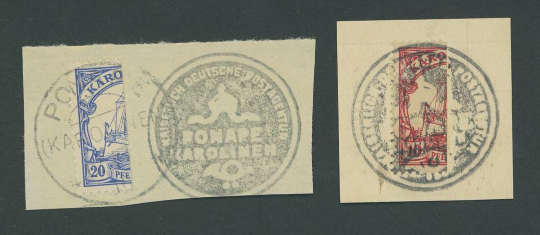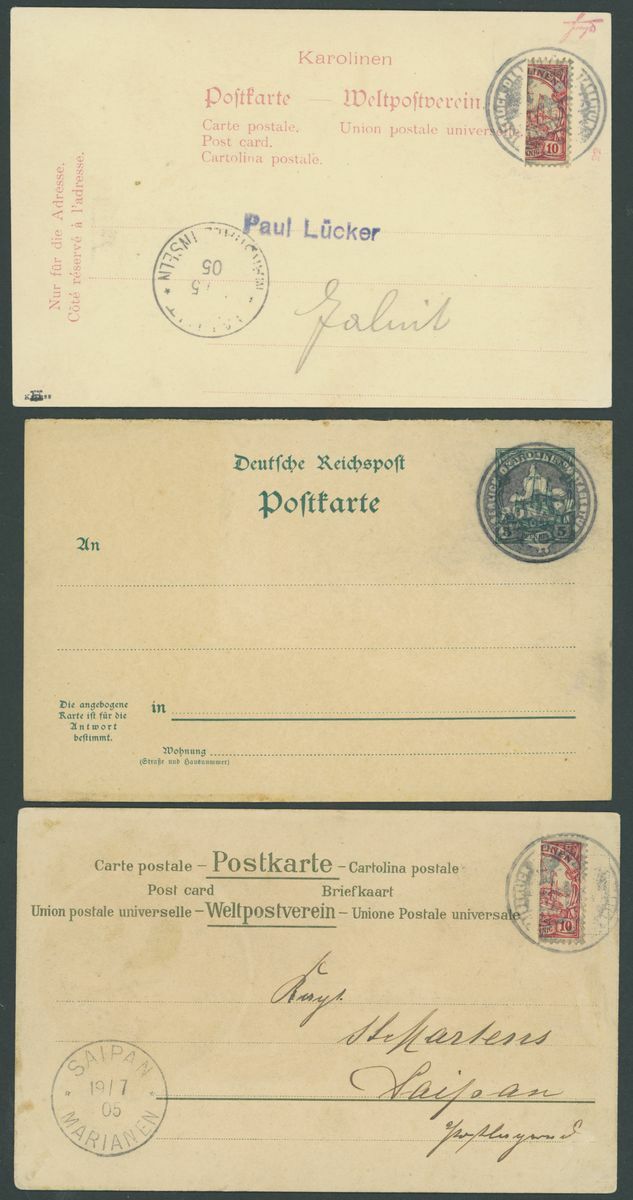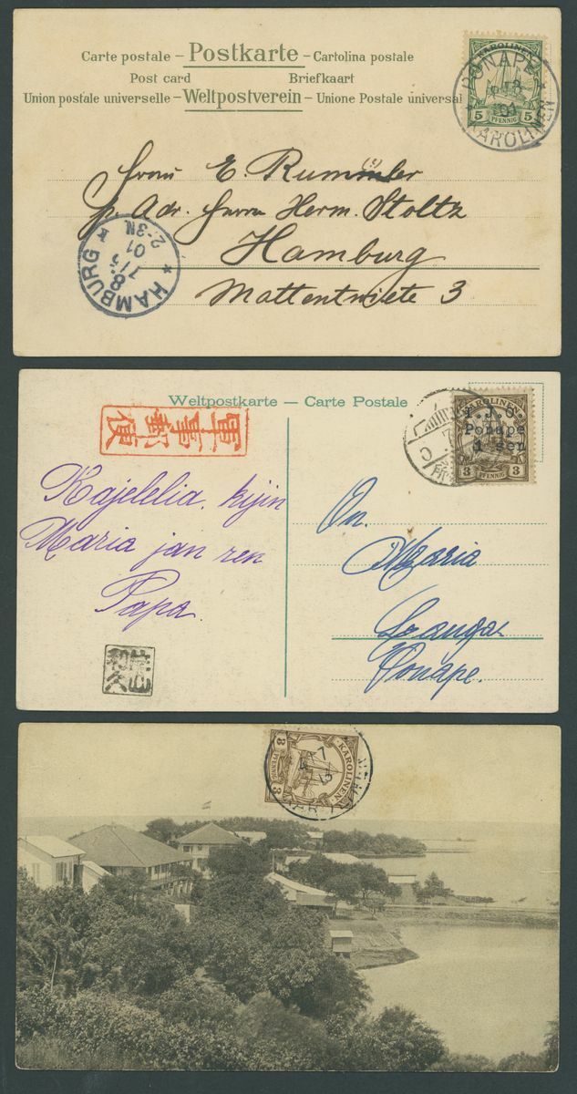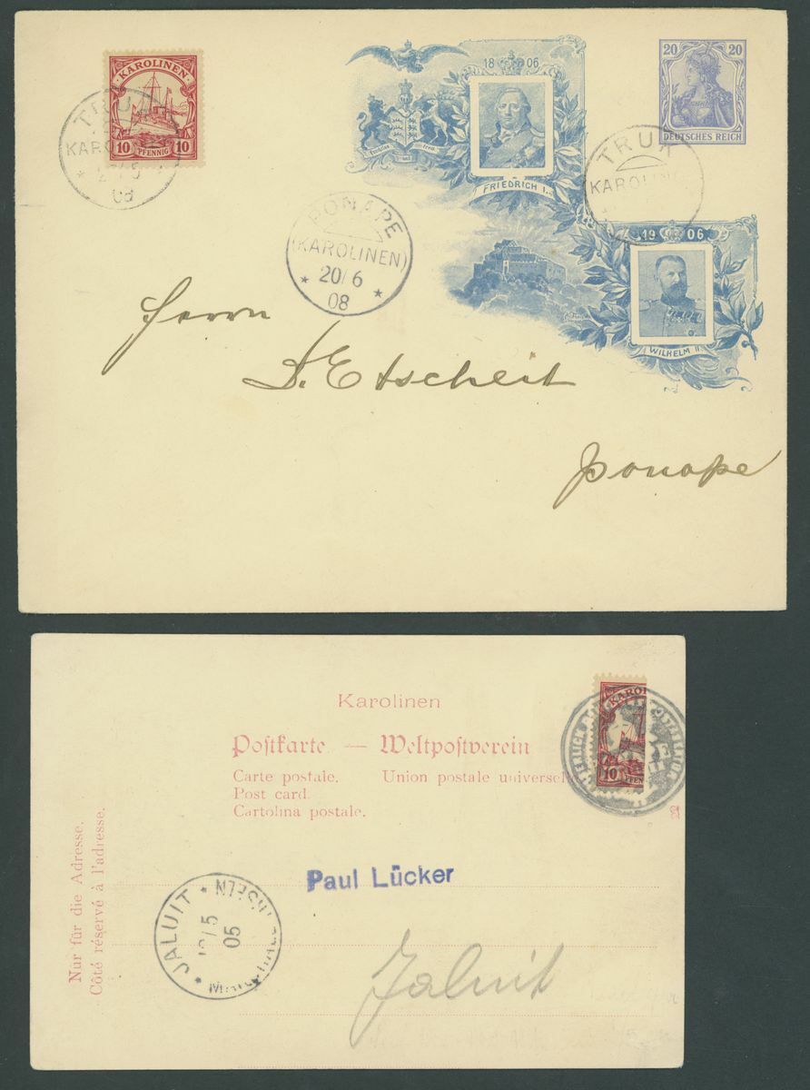 Selection of eleven covers or cards and two pieces, including three cards franked 10pf. vertical bisect tied by negative seal cancellation, 1908 German commemorative 20pf. envelope franked 20pf. on arrival with Truk cancellation, 1914 p.p.c. franked 3pf. with typewritten "I.J.O./Ponape/1sen", etc., chiefly fine