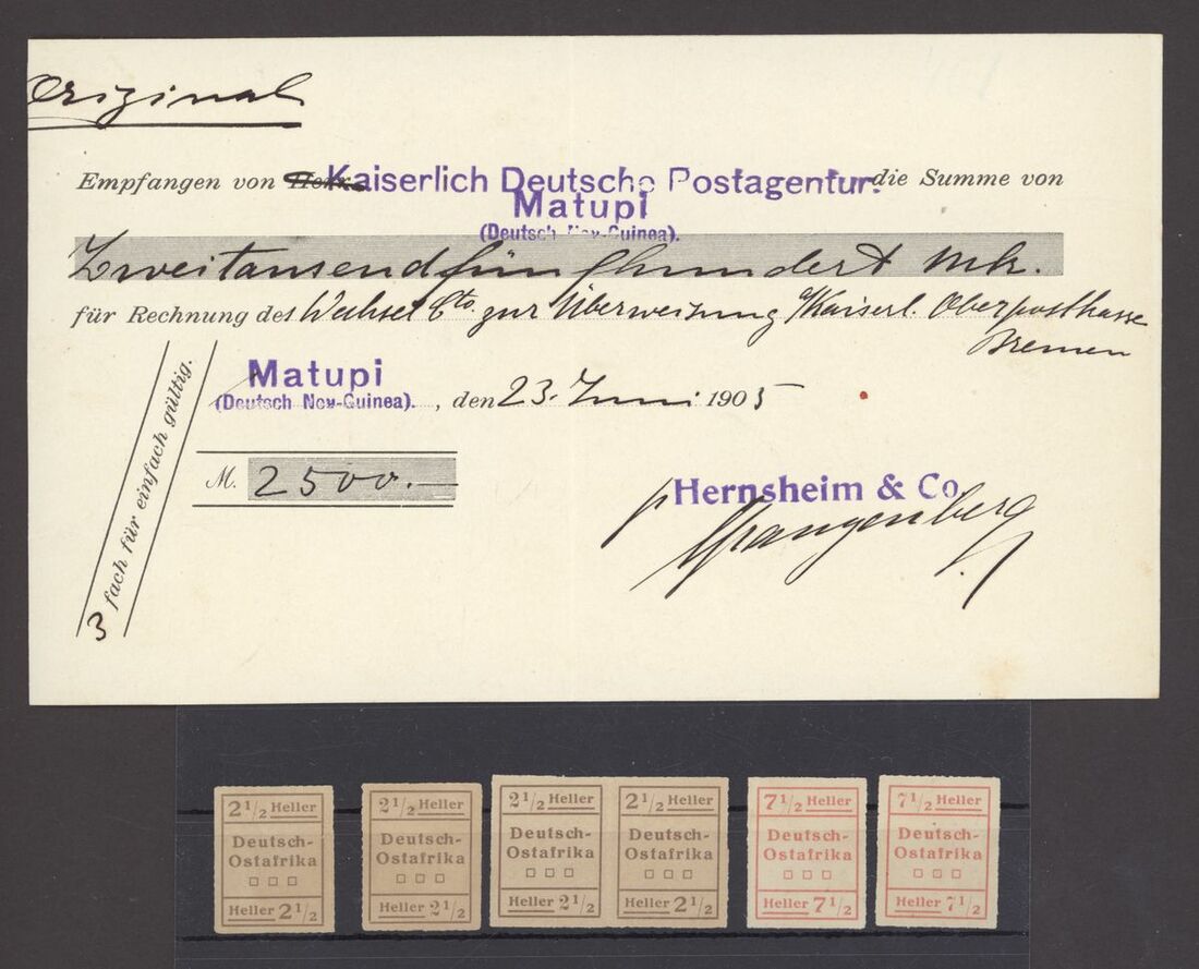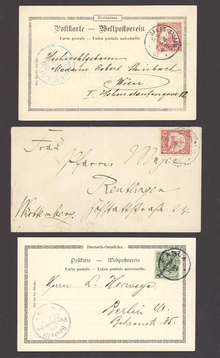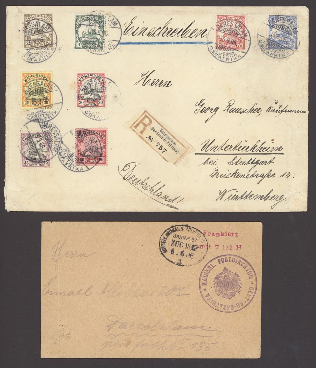 Mint and used selection on stockpage and loose, including 1893 surcharge set, 1896-99 3p. on 5pf. on p.p.c. to Berlin, 1901 German map, blue Jaulut Post Office seals (2 different), 1901 1r, (used), 3r. part original gum (Provinsky Certificate 2013), 1905 cover Registered from Daressalem to Germany franked 2½h. to 80h. 1905-20 45h.,1915 stampless cover with red "Frankiert/mit 7½H" handstamp, Witu Official 1889 5p. block of four including tete-beche pair (Michel 17 var., Jakubek Certificate 1993) chiefly good to fine