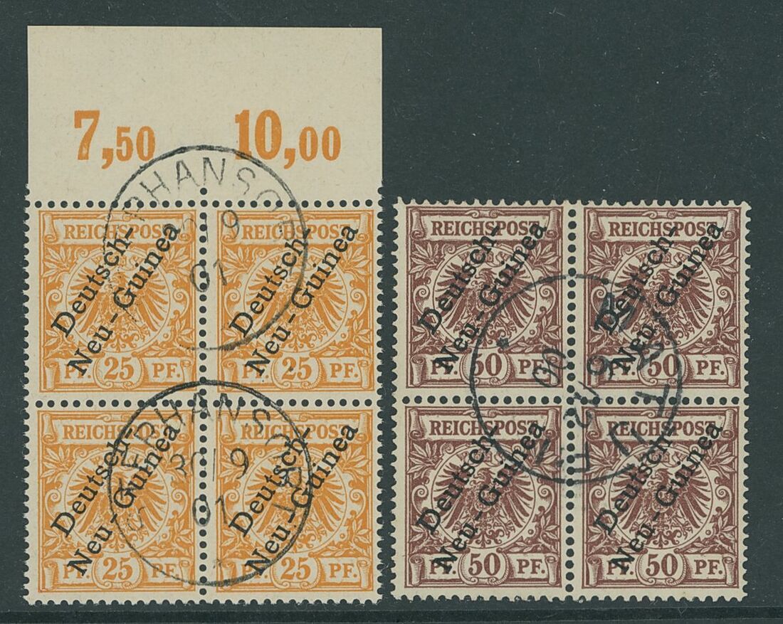 25pf. orange and 50pf. chocolate, both values in cancelled blocks of four; fine. S.G. 5-6