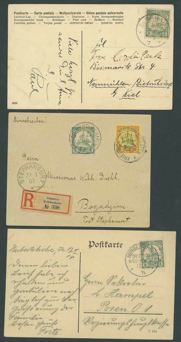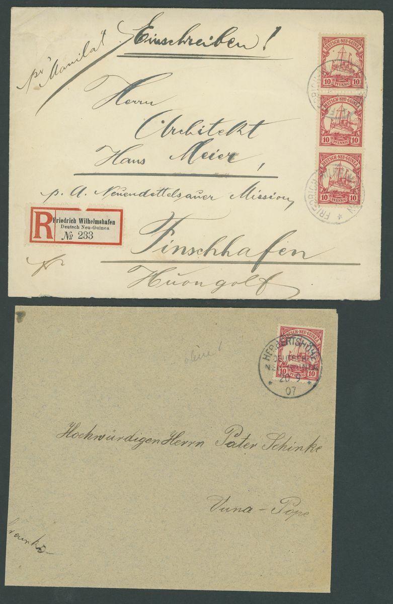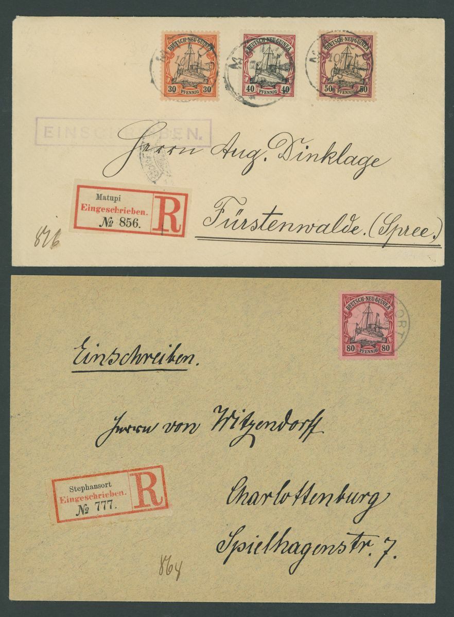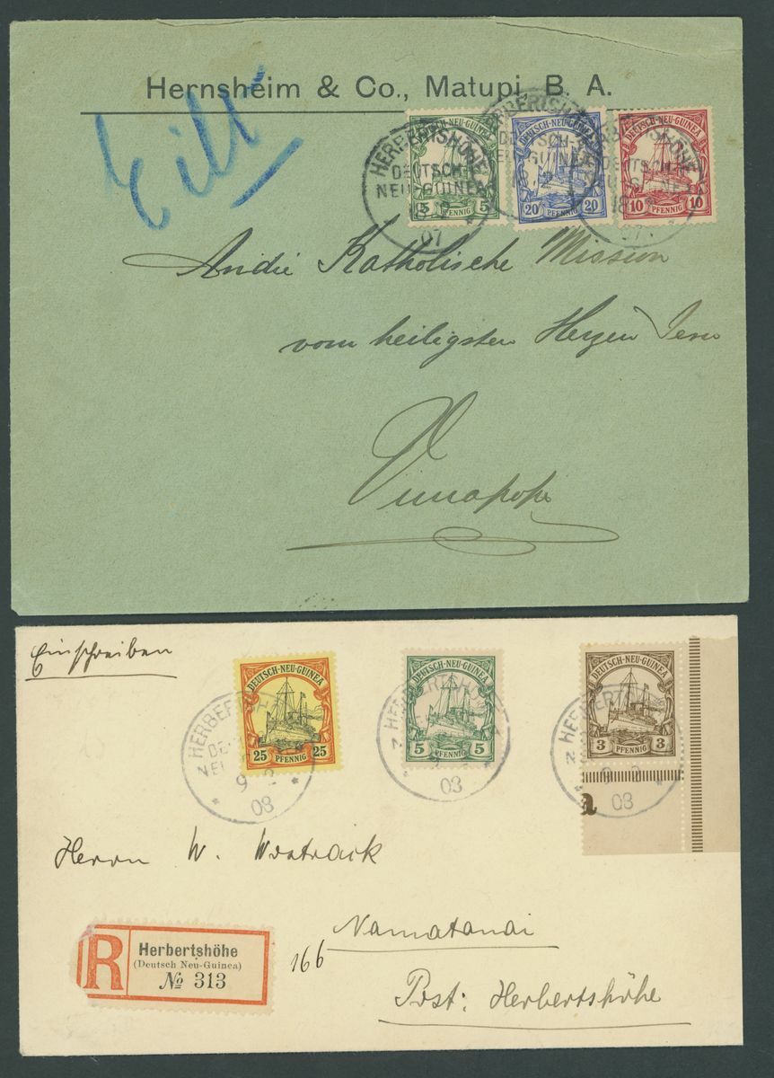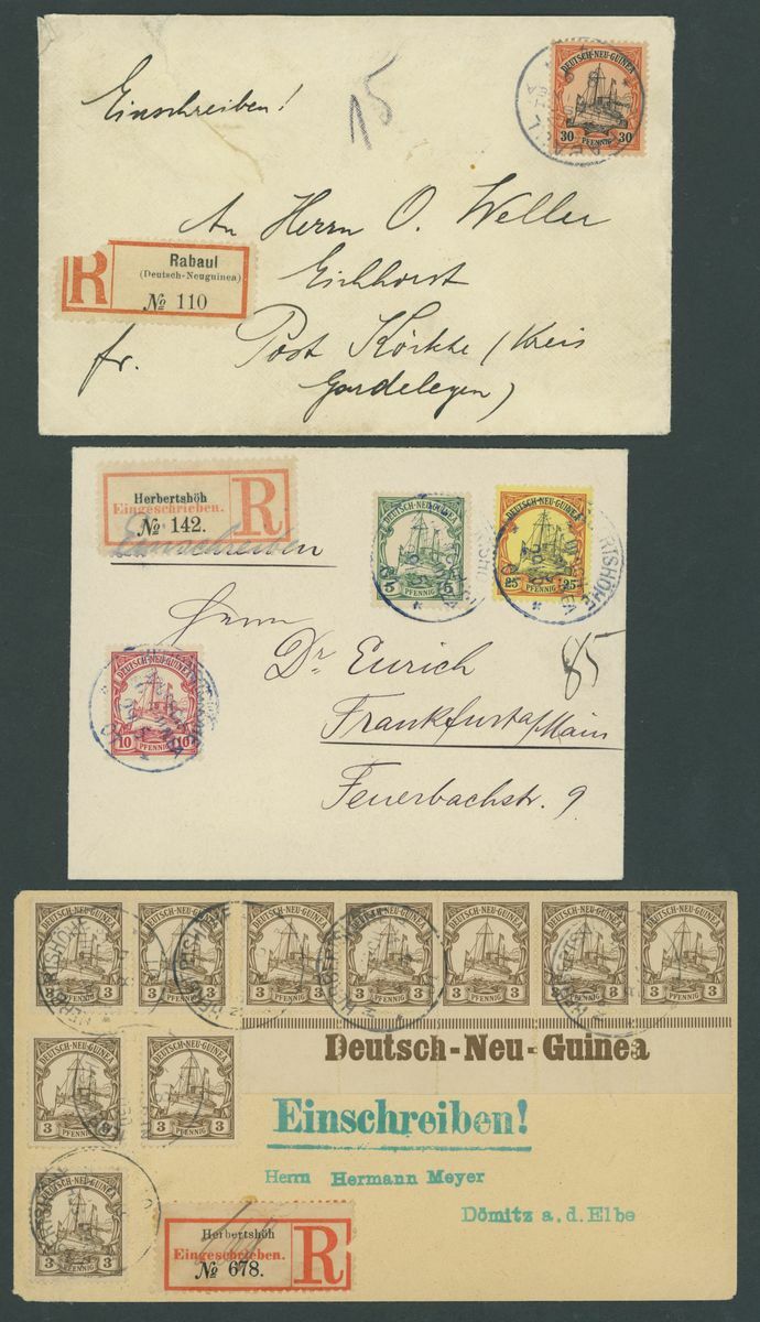 Selection on nineteen covers or cards (8 Registered), including incoming cover from Colombia, 3pf. (10) including imprint strip of five, on cover Registered from Herbertsoh to Domitz, 5pf., 10pf. and 25pf. on cover Registered to Frankfurt with blue Herbertshoh cancellations, 30pf. on cover Registered from Rabaul, 30pf., 40pf. and 50pf. on cover Registered from Matupi, 80pf. on cover Registered from Stephansort, etc., chiefly good to fine