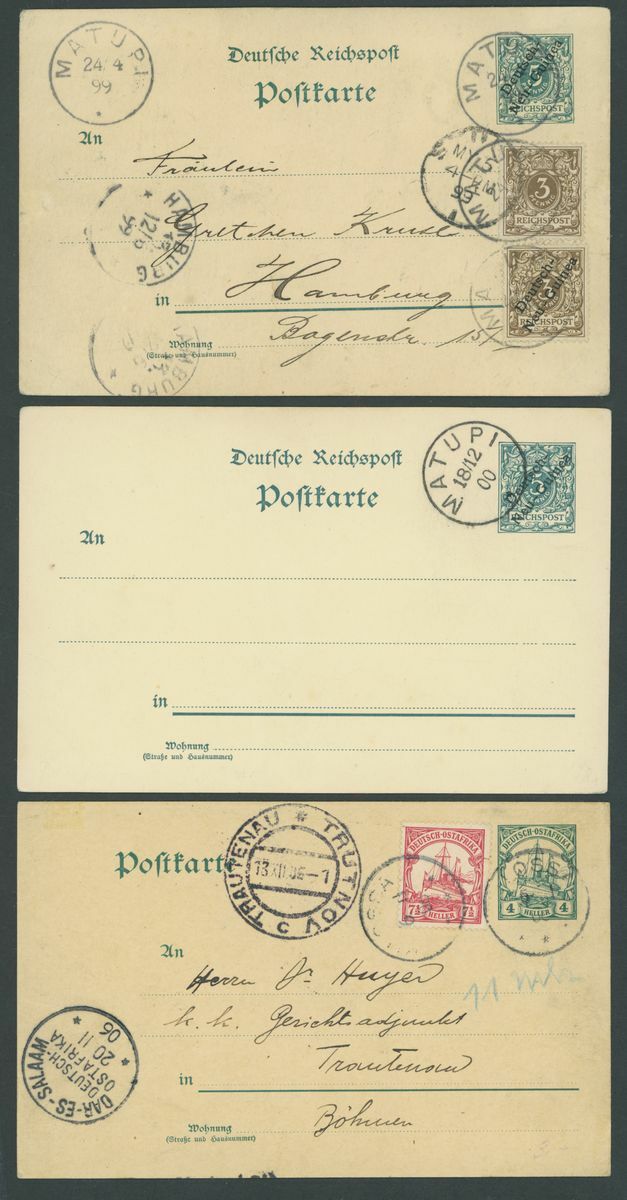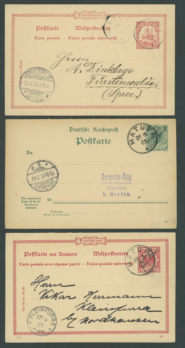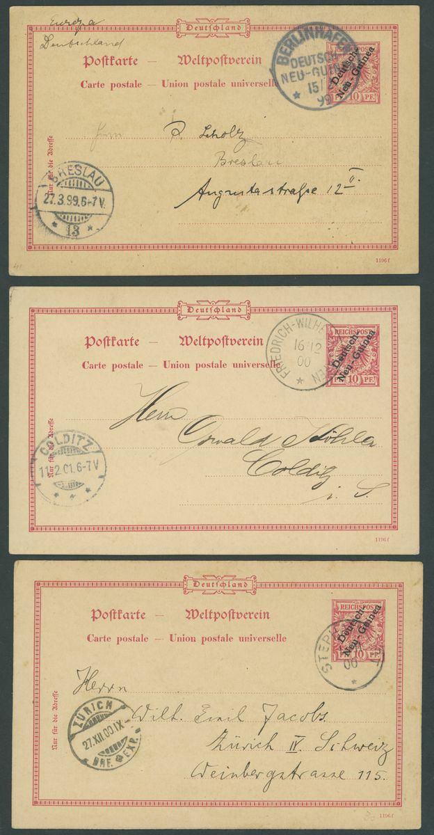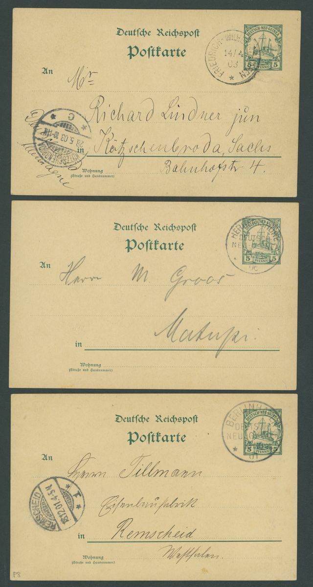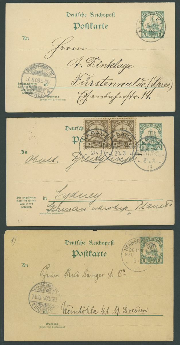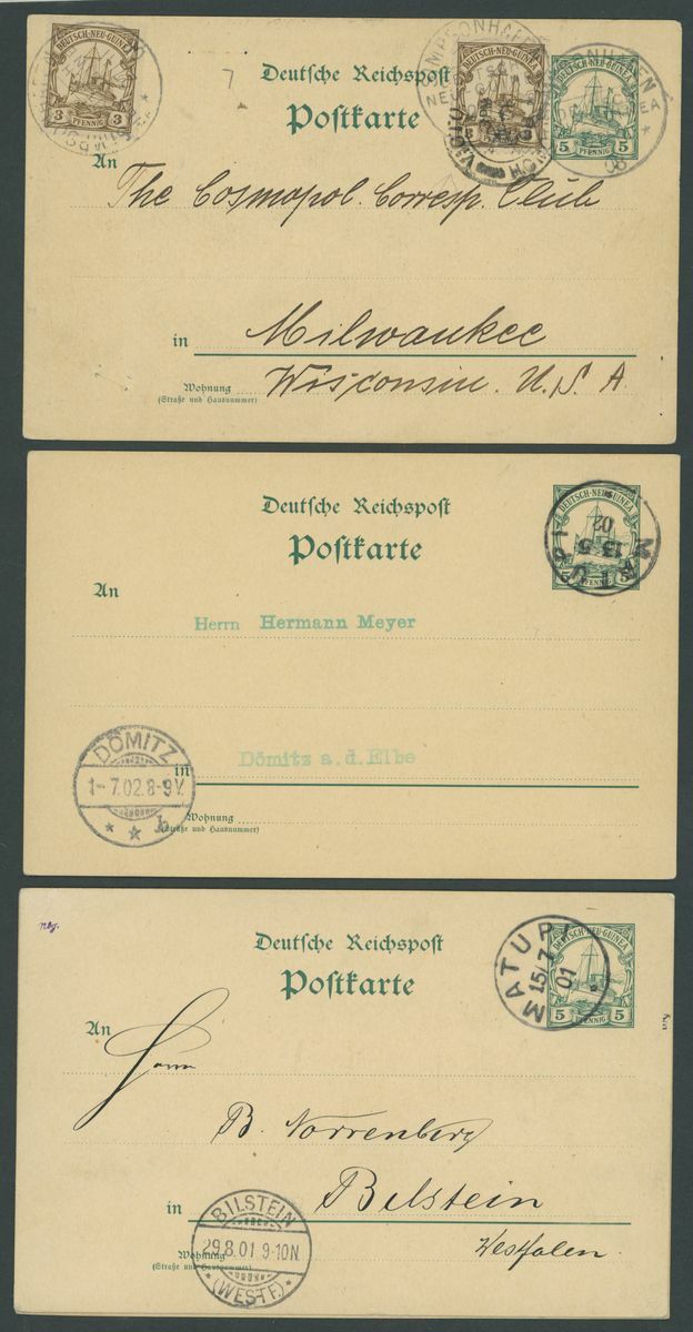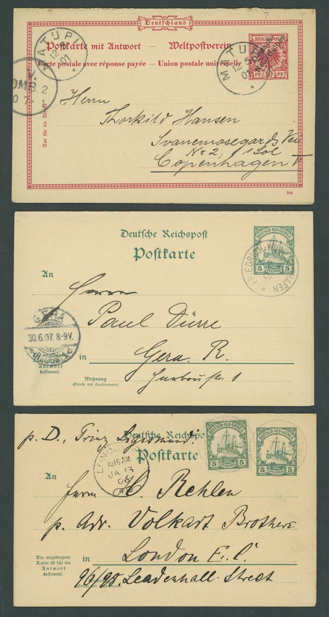 Postal Stationery: Mint and used selection (51 items), including single cards 1897 3pf. (2 mint, 3 used), 10pf. (1 mint, 4 used), 1901 5pf. (2 mint, eleven used, two of these uprated), 10pf. (3 mint and 5 used), reply paid cards with 1897 5pf. (3 mint and 1 used), 10pf. (2 mint and 2 used), cancellations with Berlinhafen, Frederich-Wilhelmshafen, Herbertshoh, Maputi, Rabaul, Simpsonhafen, Stephensort, etc., chiefly good to fine