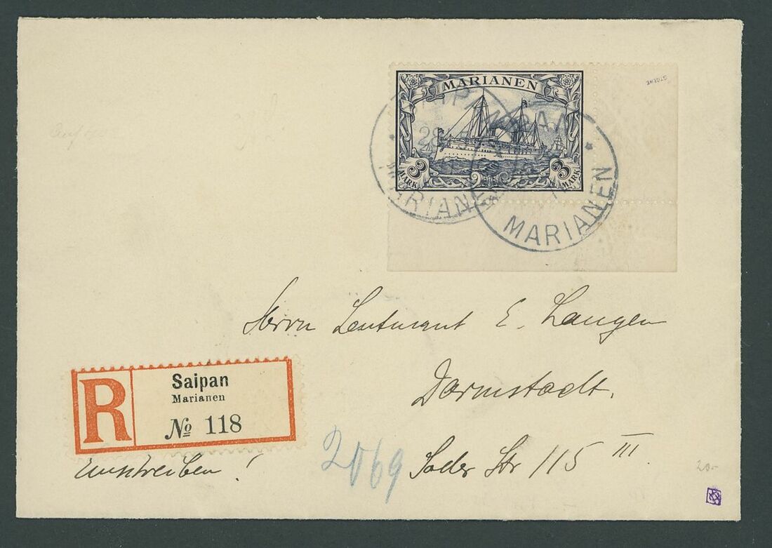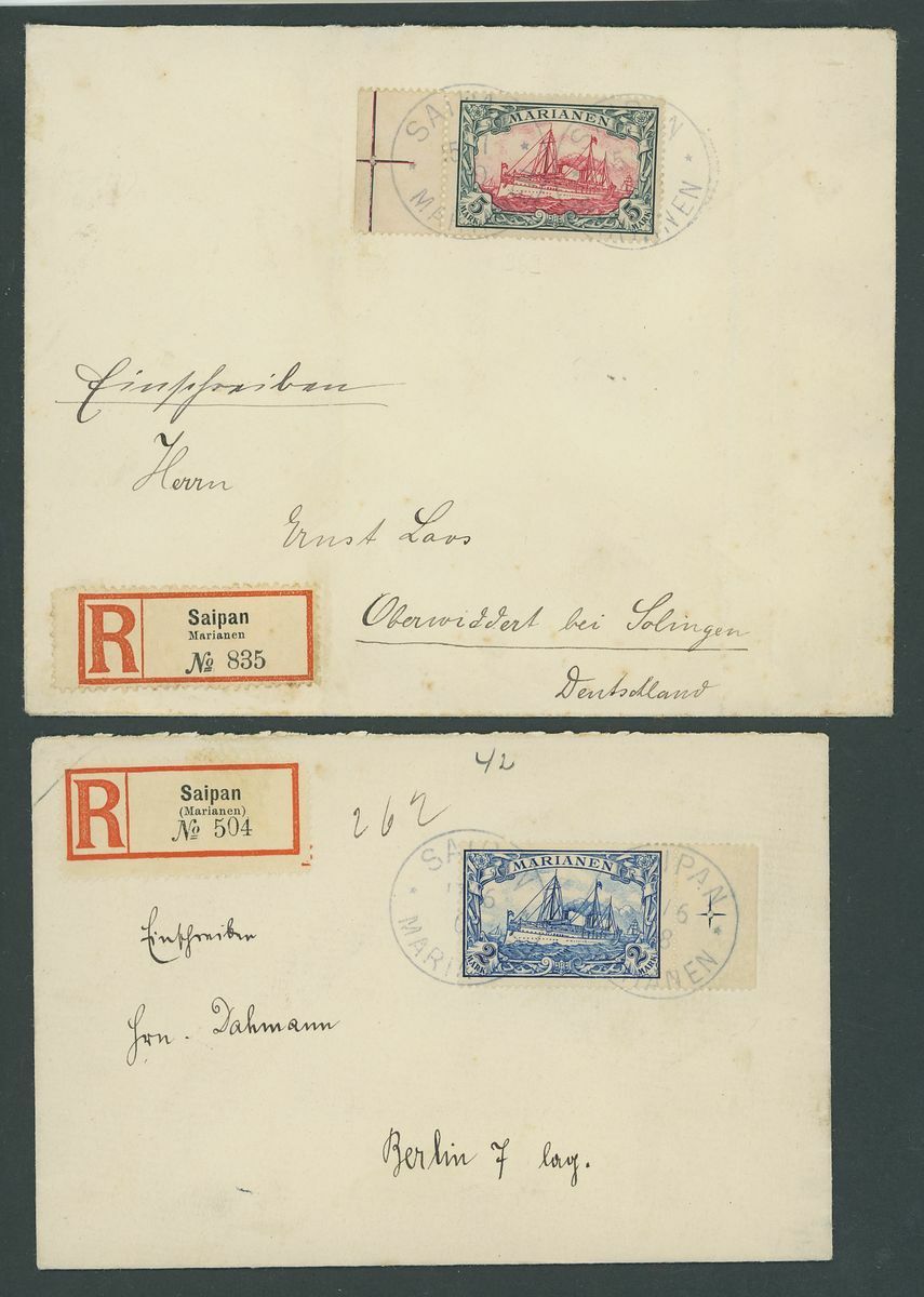 1901 2m., 3m. and 5m., tied to separate envelopes Registered from Saipan to Germany, the 2m. and 5m. from the side of the sheet with perf. registration cross, the 3m. from the lower right corner of the sheet, arrival markings; fine. The 2m. and 3m. with Jäschke-Lantelme Certificates. S.G. G21-23. Photo