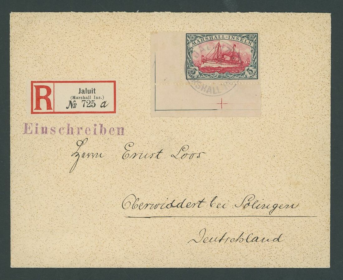 5m. carmine and black, from the lower left corner of the sheet, tied by single Jailut cancellation of envelope Registered to Oberwindert, arrival on reverse; fine. S.G. G23