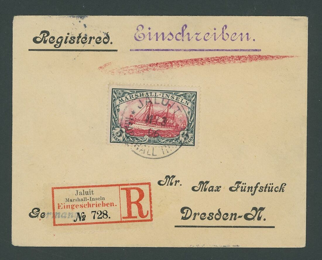 5m. carmine and black, tied by single Jailut cancellation to small envelope Registered to Dresden, arrival datestamp on the reverse; fine. Steuer Certificate (2010). S.G. G23