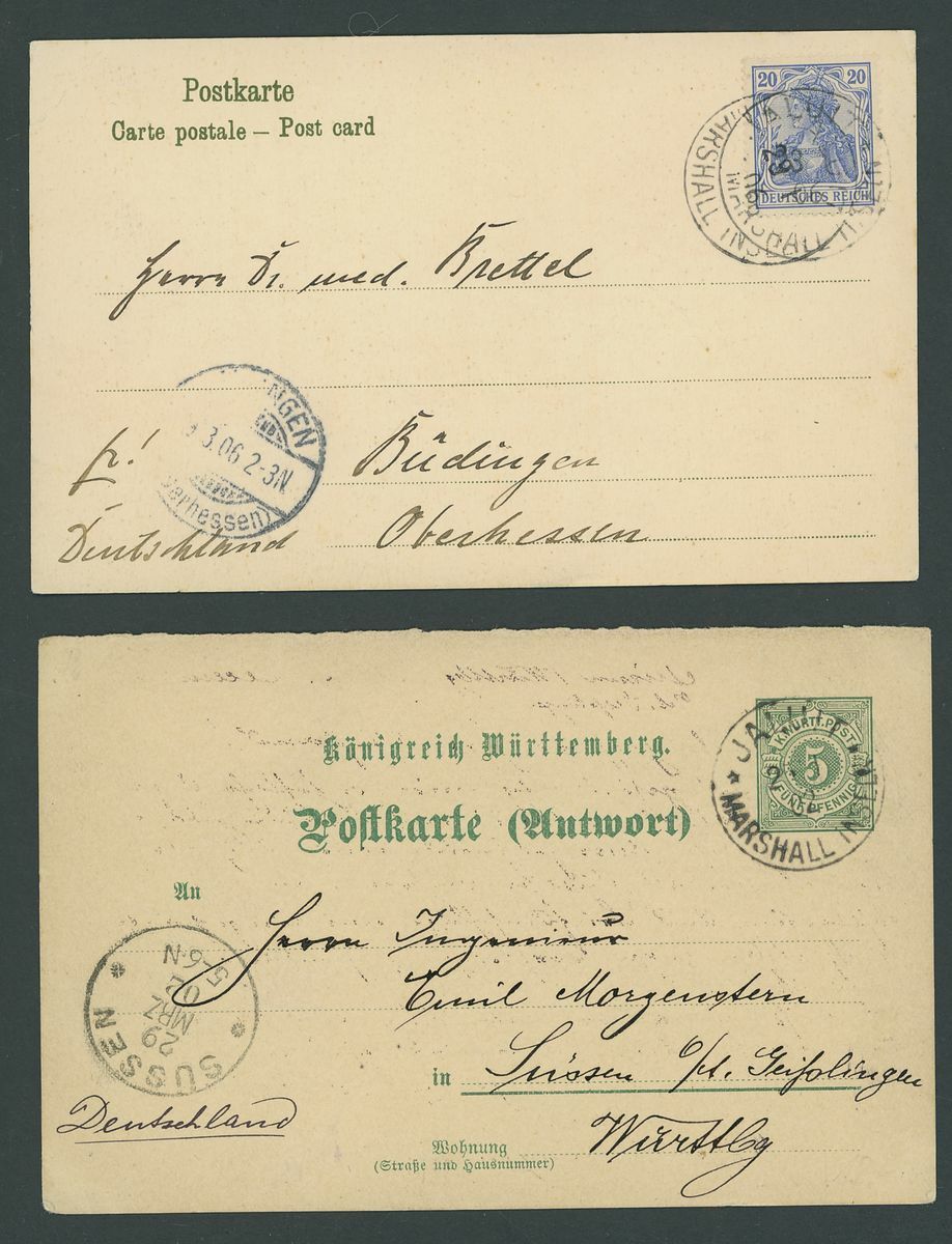1902 (25 Jan.), reply portion of Württemburg 5pf. + 5pf. postal stationery card, Jailut cancellation and Sussen arrival, also 1906 (29 Jan.) coloured p.p.c. (Postdampfer Germania)) franked Germania 20pf. with Jailut cancellation and Oberhessen arrival, corner crease, fine