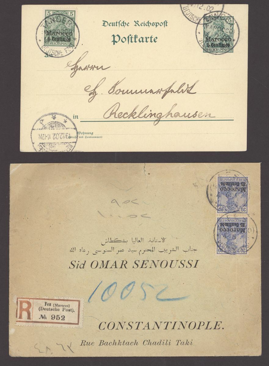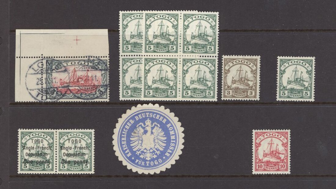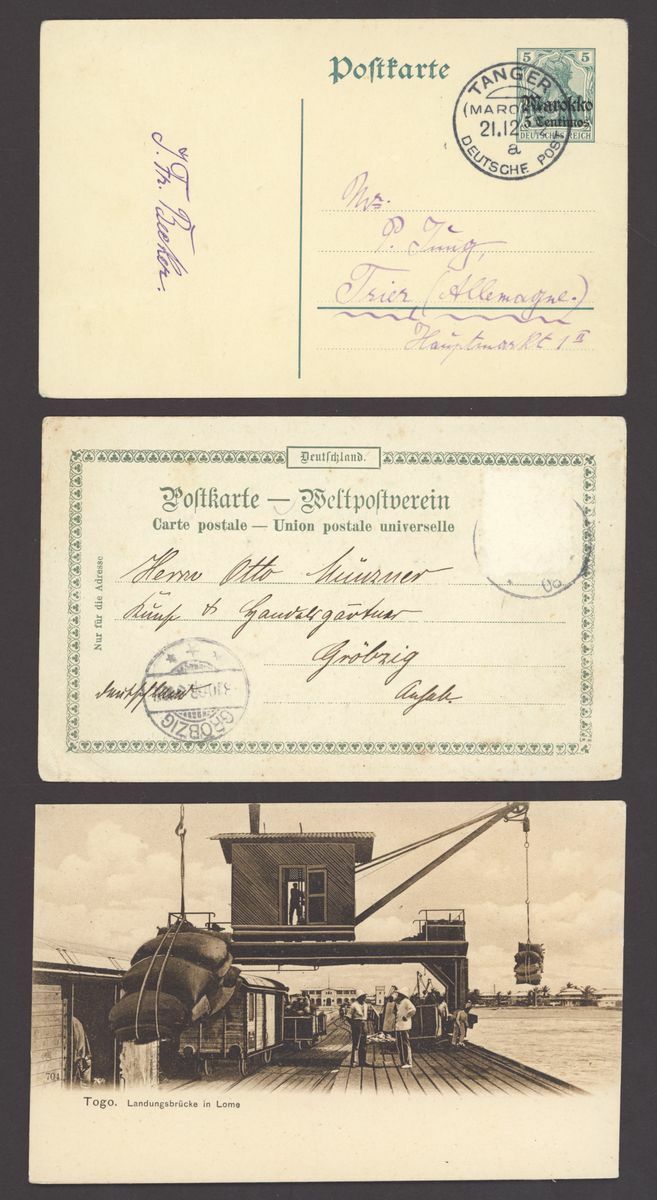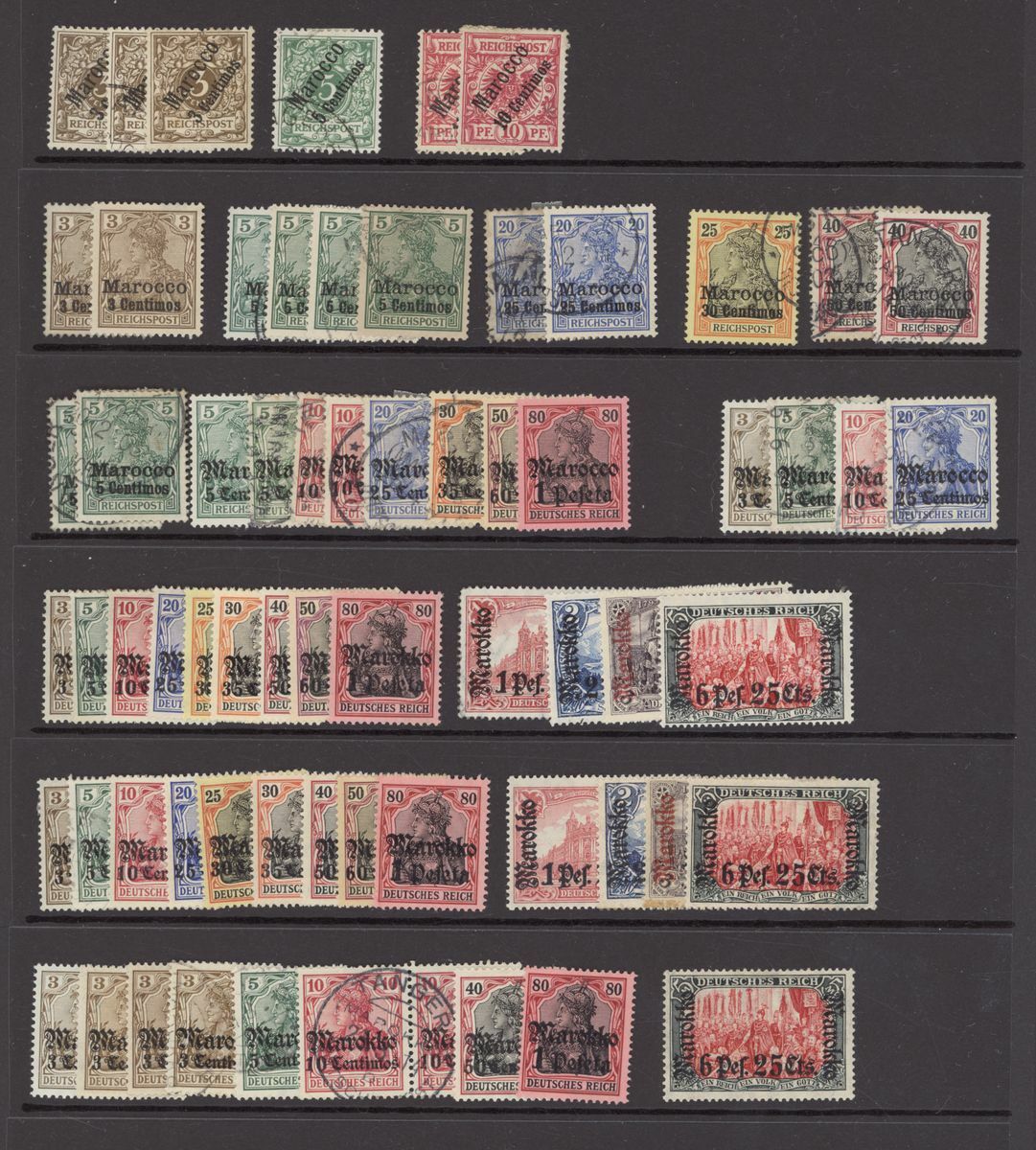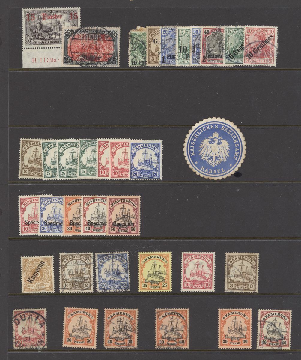 Selection on stock pages and loose, including Cameroun, Post Offices in Morocco 1899 set of six on cover Registered to Bavaria, 1911-18 6p. 25c. on 5m. (3), Post Offices in the Turkish Empire 1905-12 15pi. on 3m. mint from the foot of the sheet with HAN, 25pi. on 5m. used, Kiaochow 1901 10pf., 20pf., 30pf., 40pf. and 5pf. overprinted "Specimen", postal stationery, Togo 1900 5m. used, from the upper left corner of the sheet, Ship Post covers and cards, etc., chiefly good to fine