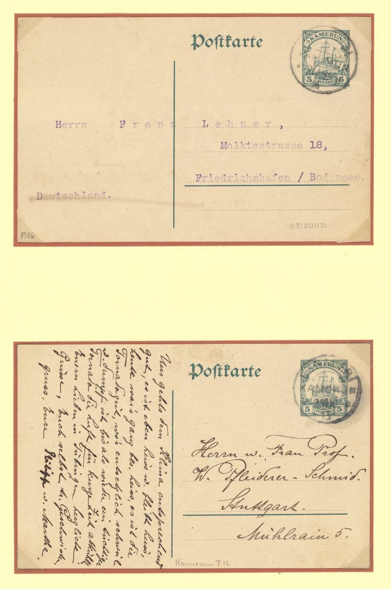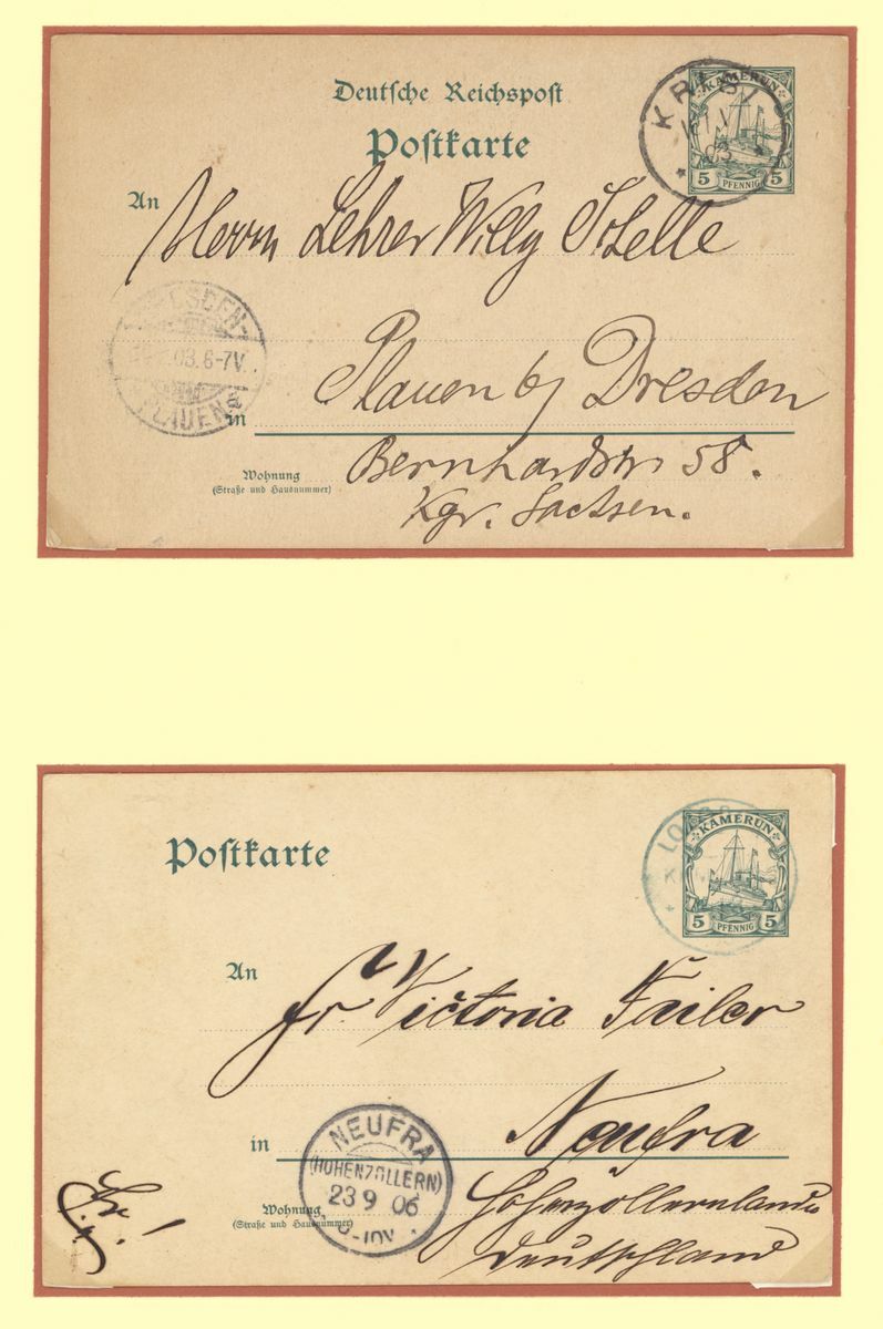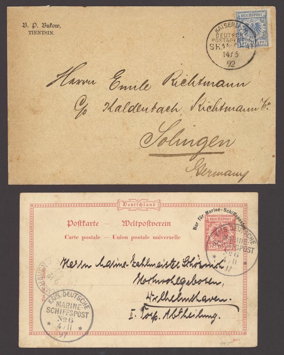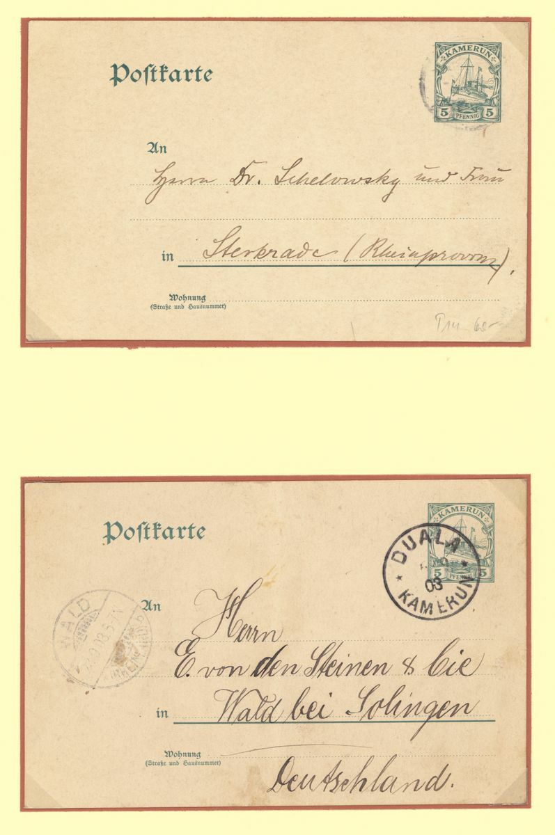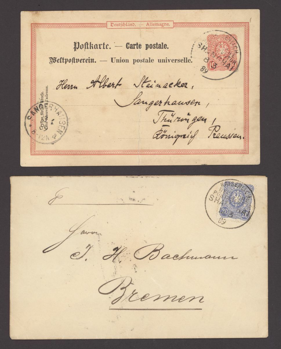 A mainly postal history selection (21) including Post Offices in China Forerunners (4): Shanghai type 1 c.d.s.; 1889-92 group of covers with Small Eagle 20pf. on commercial covers to Berlin and Bremen, Large Eagle 20pf. on commercial envelope from Tientsin to Solingen and 10pf. postal stationery card to Sangerhausen; Cameroun 1895-1914 "Postkarte" selection (10) including 1895 forerunner 5pf. uprated with 5pf. stamp cancelled by