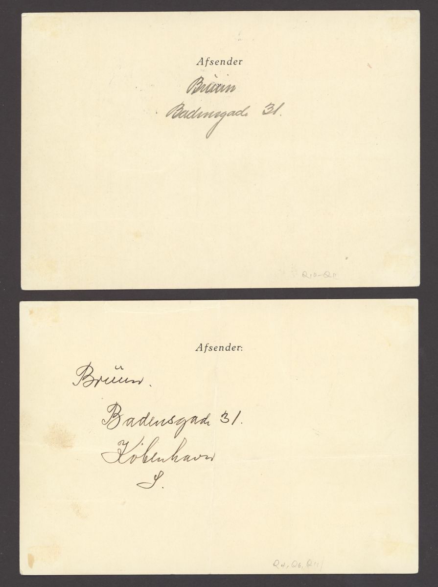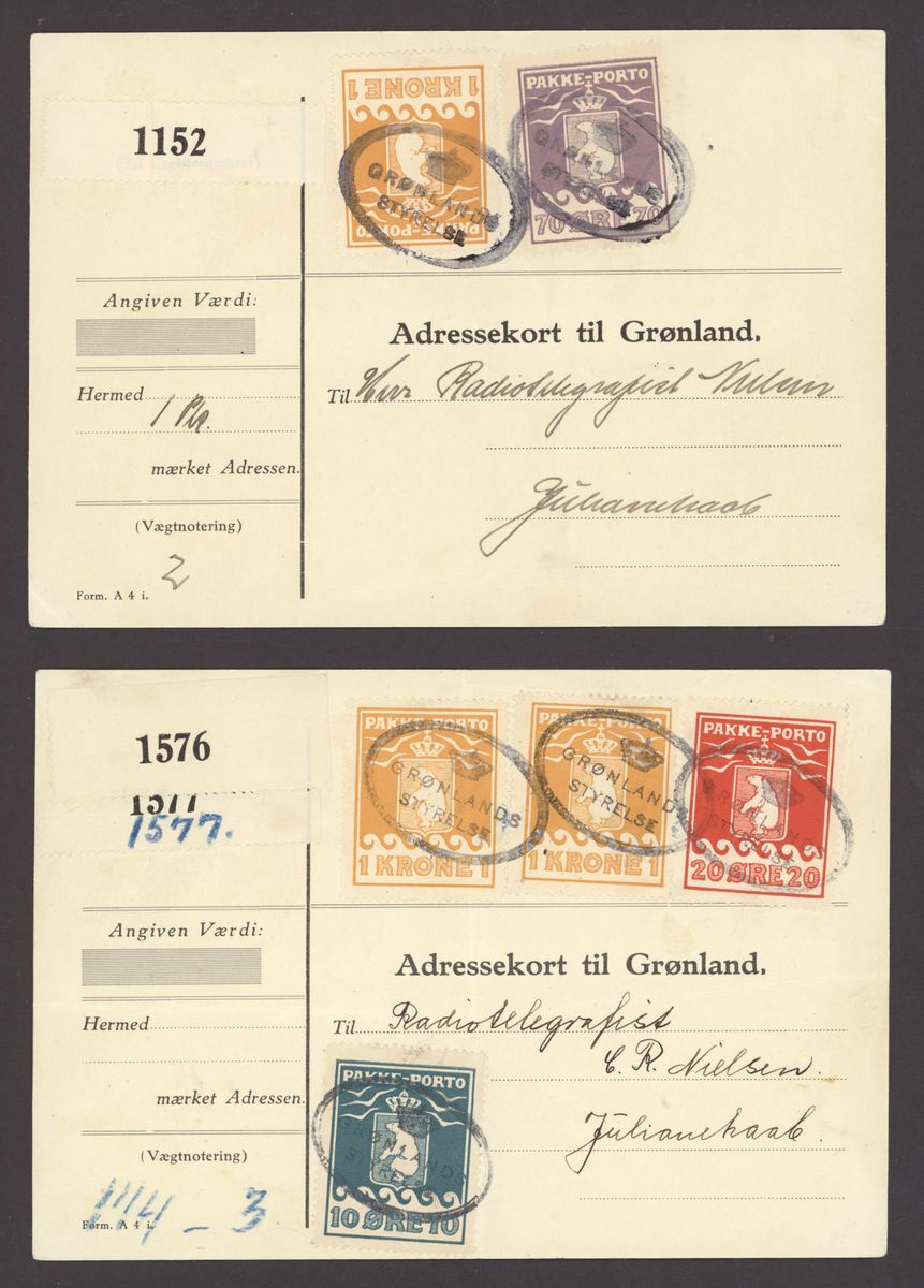 Two undated "Adressekort", the first franked 10oe., 20oe. and 1k. (pair), the second franked 70oe. (creased) and 1k., oval
