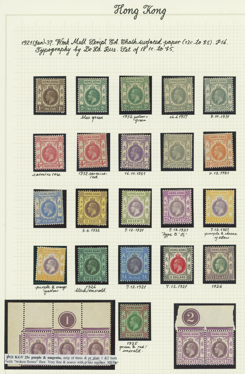 1921-37 Script group of twenty-six on an album page with some shades and including 25c. plate number '1' strip of three and plate number '2' horizontal pair both showing variety broken flower, 30c. purple and orange yellow, etc. generally fine mint. S.G. 117-132 group, £1,200+
