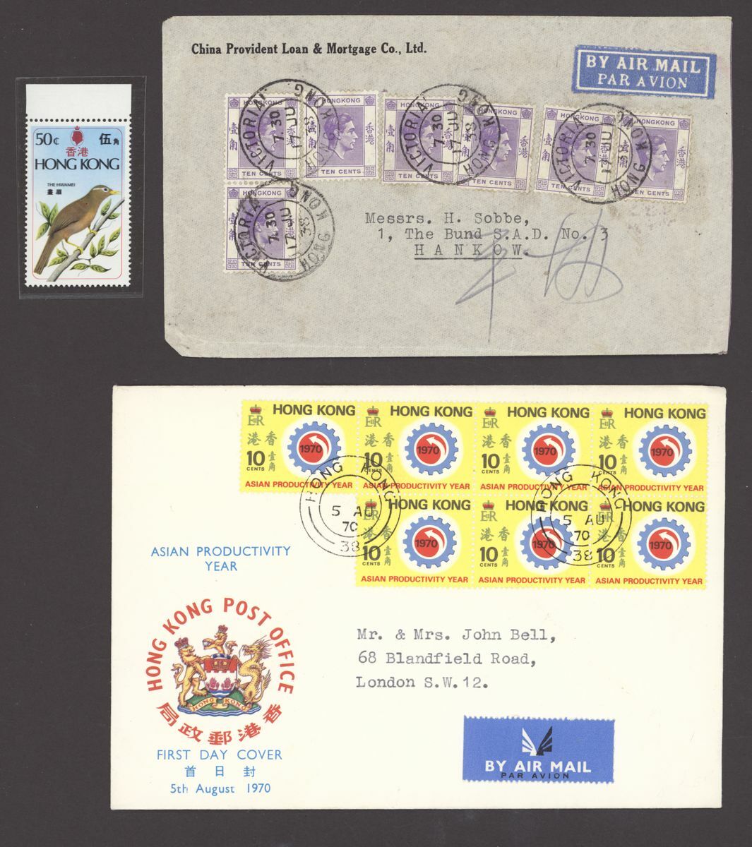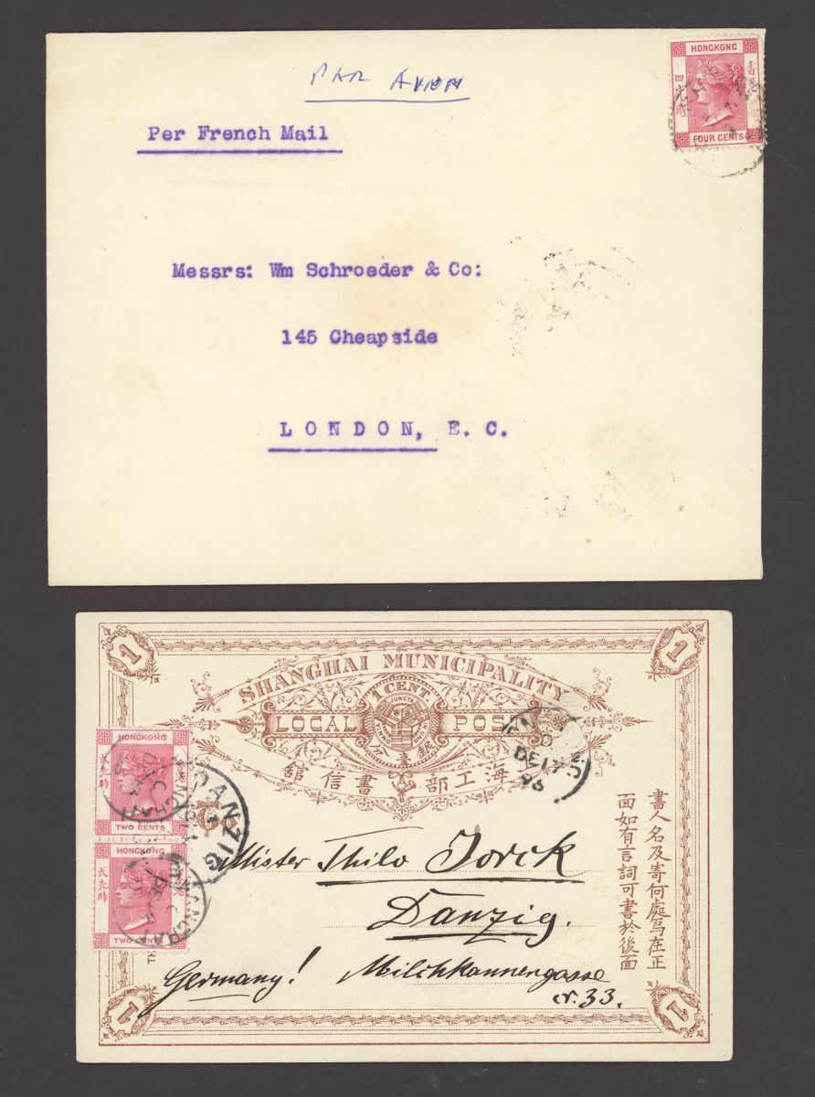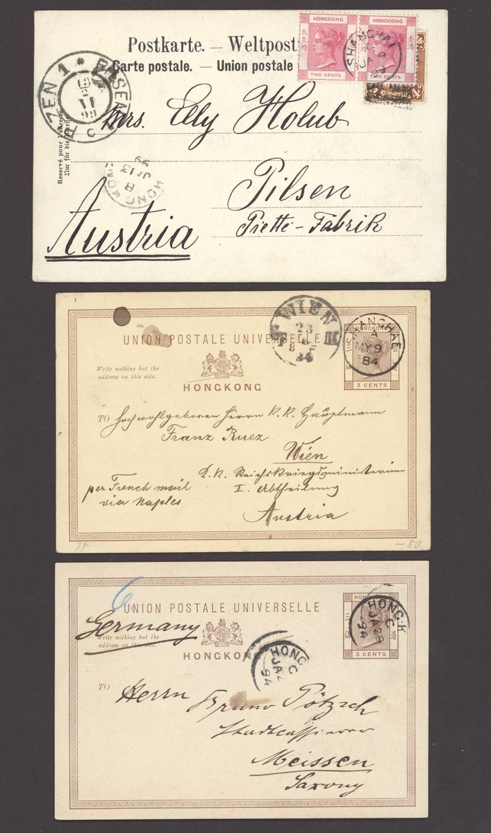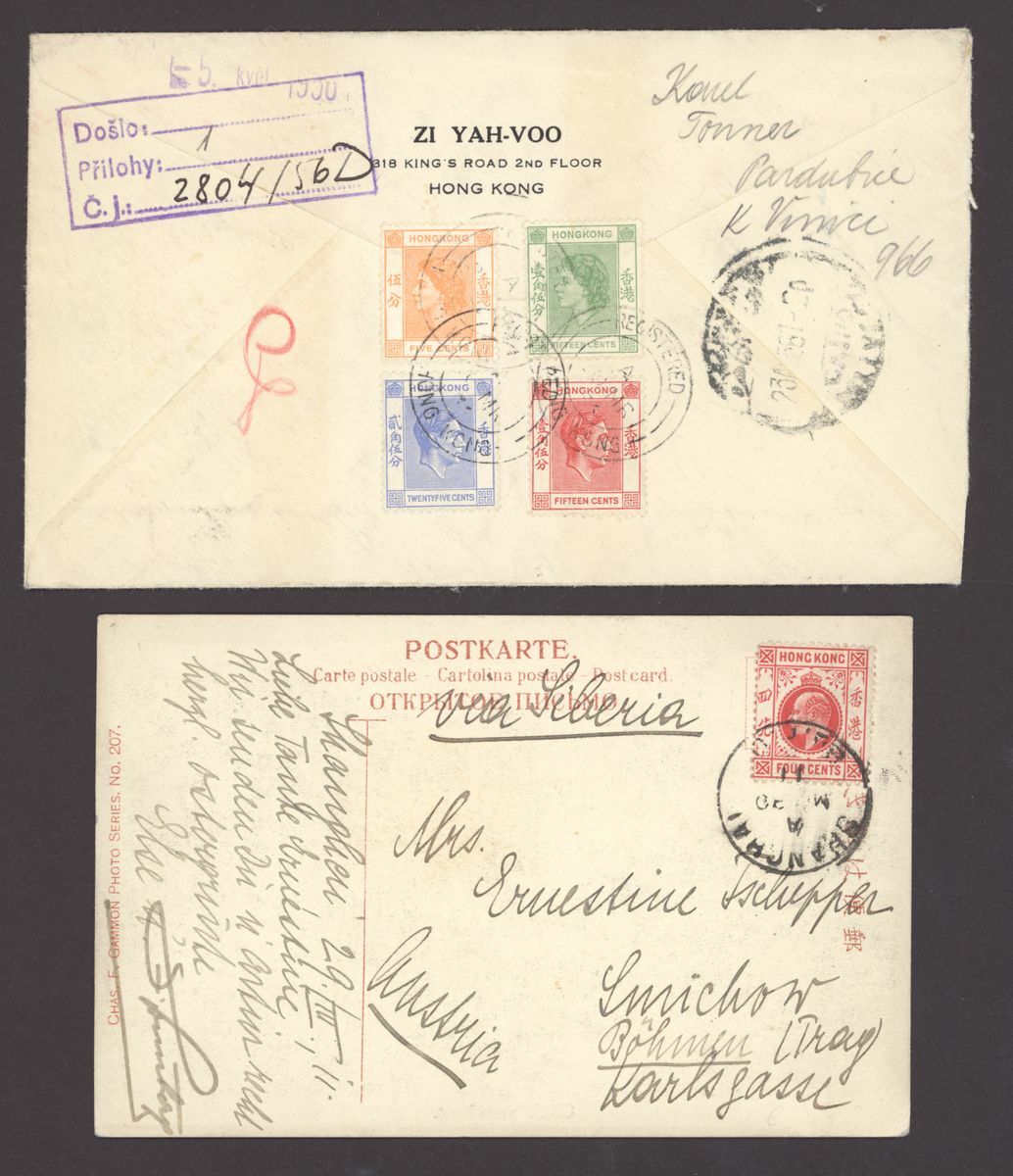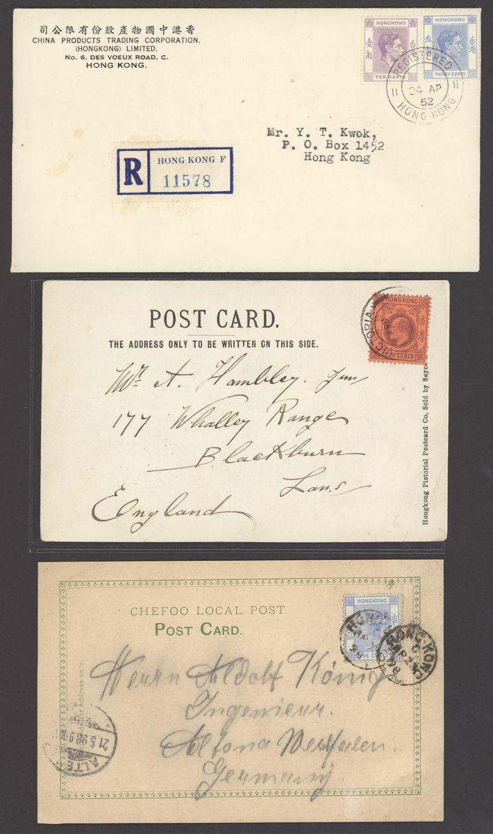 1884-1970s Postal History collection including 1884 3c. postal stationery card from Shanghai to Austria, 1899 postcard from China to Austria bearing China CIP 4c. tied by Pa-kua cancellation overlapped by Hong-Kong 2c. pair cancelled by Shanghai c.d.s., 1931 red band cover to China bearing Hong Kong 2c. and 10c. In addition a 1975 50c. bird ' The Hwamei' variety 'black printed double with Hong Kong stamp society certificate. Mixed condition, an interesting lot for the student of the subject.
