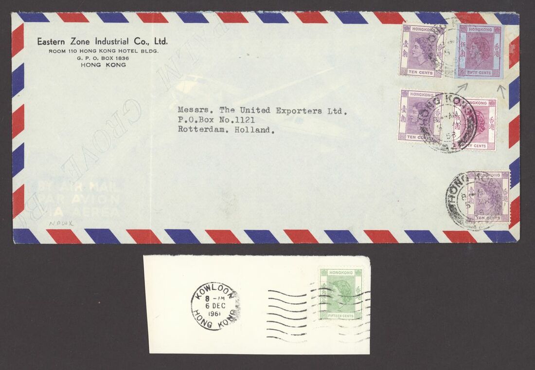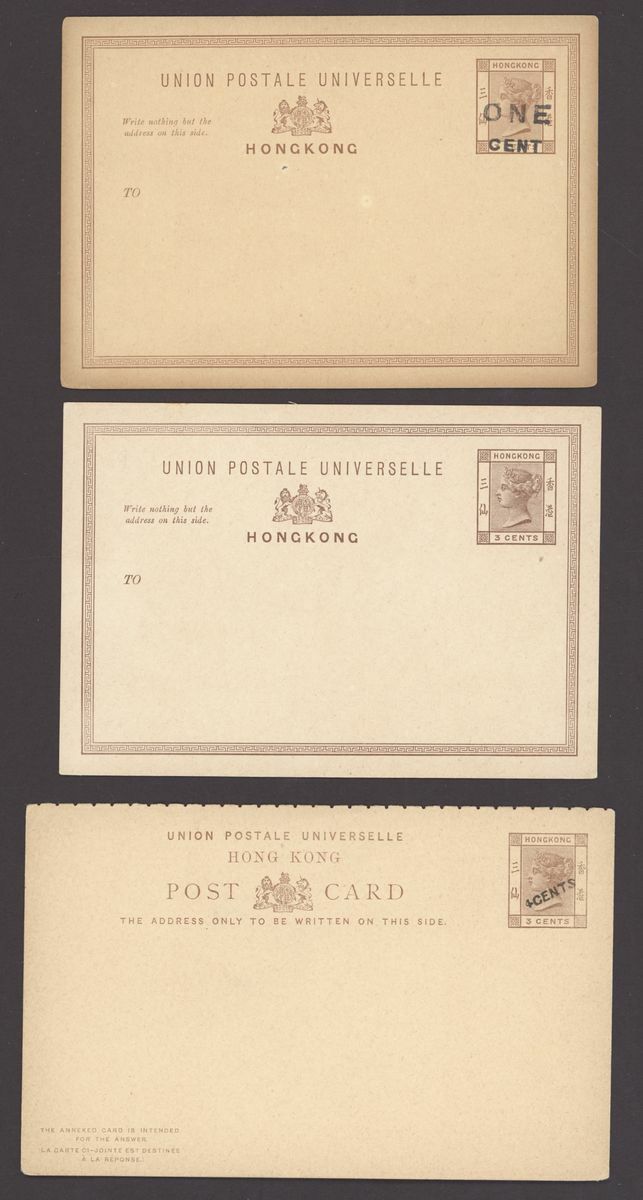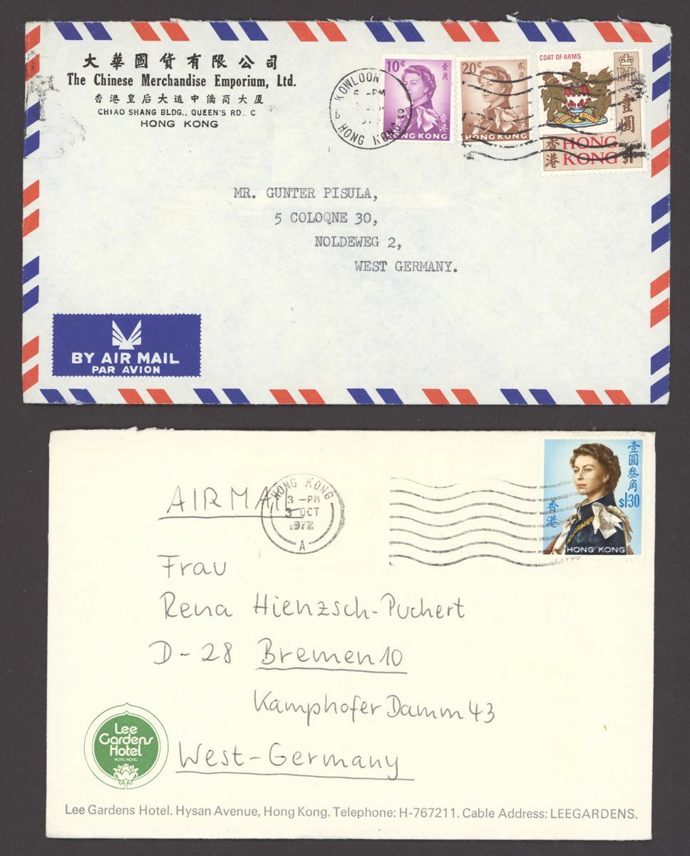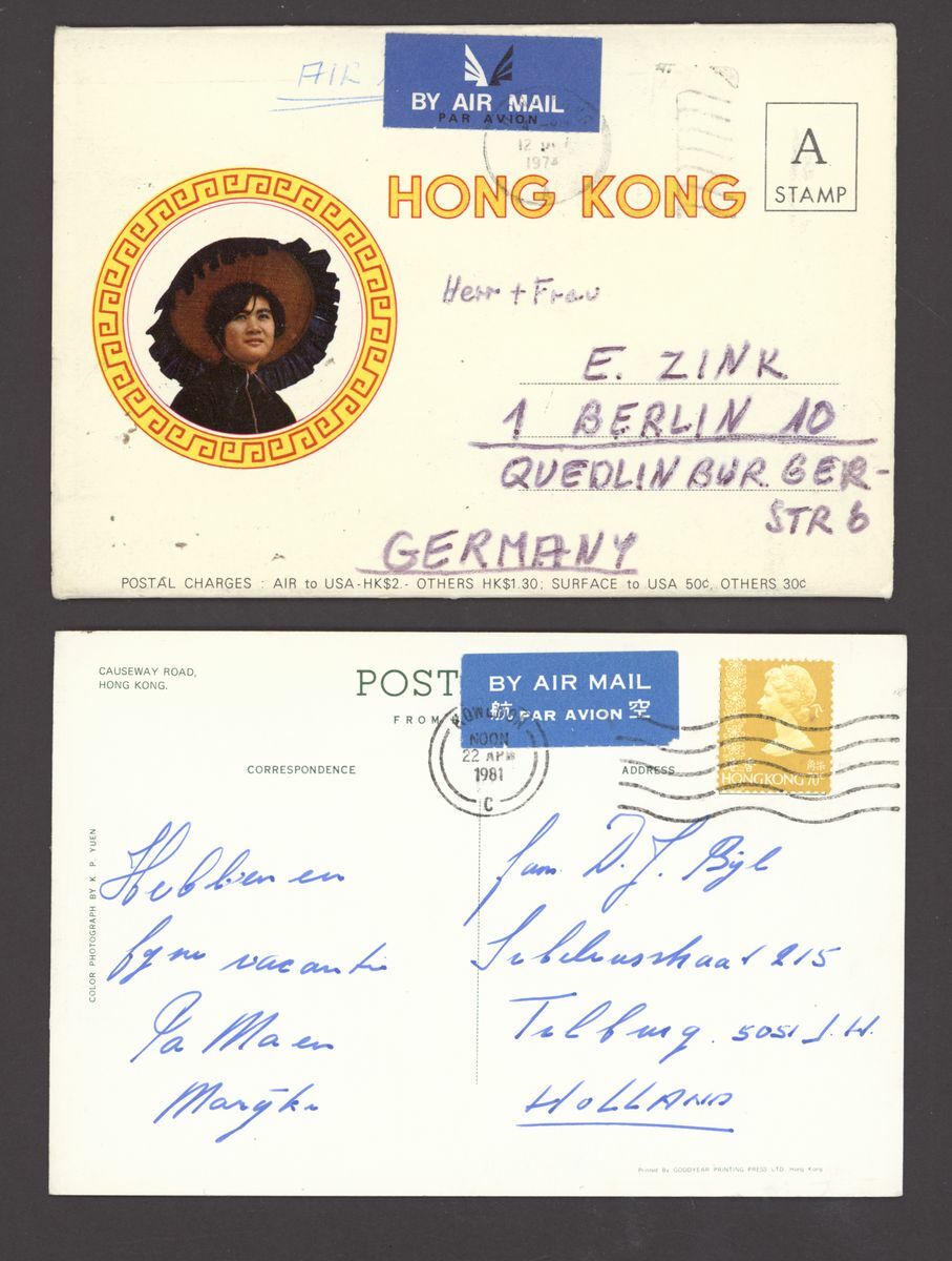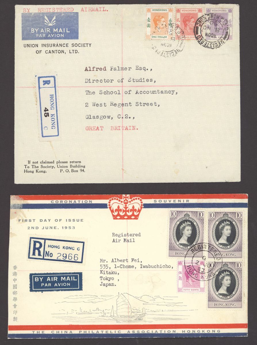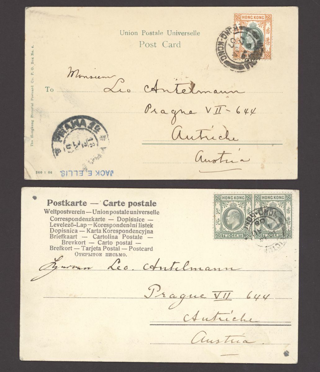 1884-1970s Postal History collection including 1884 3c. postal stationery card from Shanghai to Austria, 1899 postcard from China to Austria bearing China CIP 4c. tied by Pa-kua cancellation overlapped by Hong-Kong 2c. pair cancelled by Shanghai c.d.s., 1931 red band cover to China bearing Hong Kong 2c. and 10c. In addition a 1975 50c. bird ' The Hwamei' variety 'black printed double with Hong Kong stamp society certificate. Mixed condition, an interesting lot for the student of the subject.