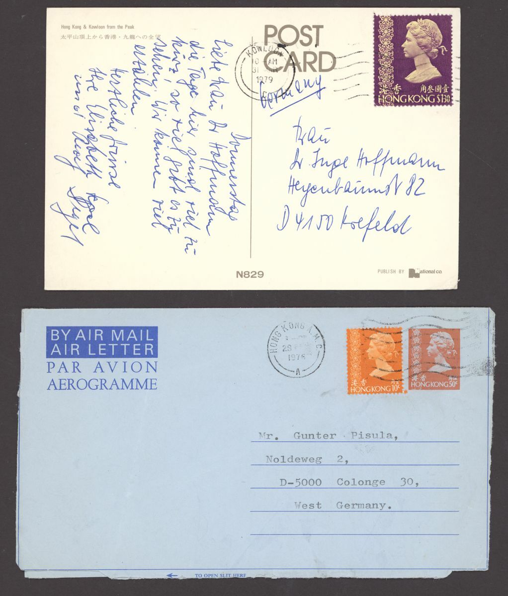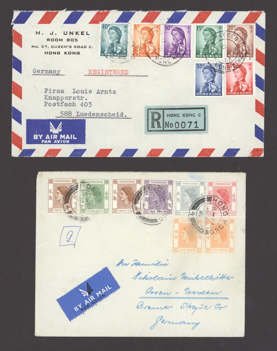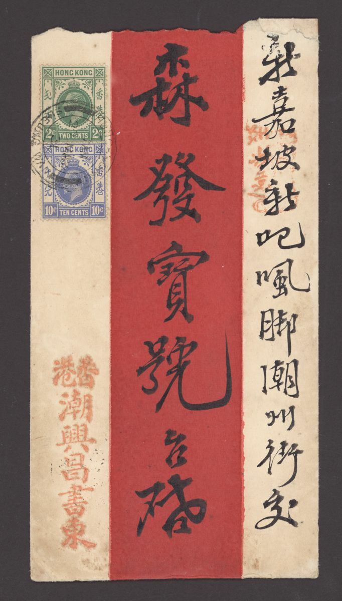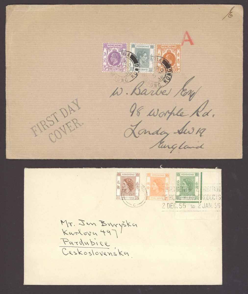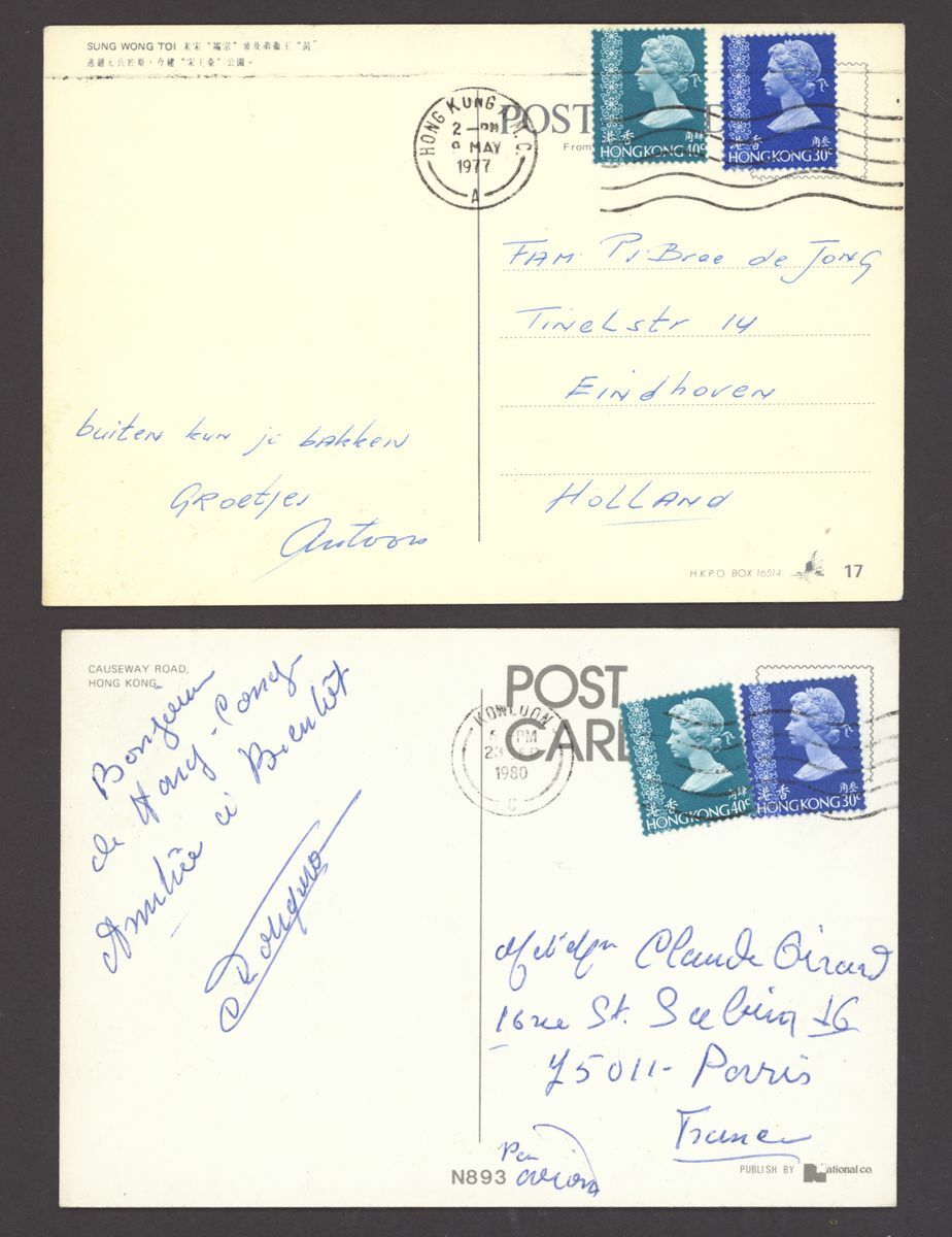 1884-1970s Postal History collection including 1884 3c. postal stationery card from Shanghai to Austria, 1899 postcard from China to Austria bearing China CIP 4c. tied by Pa-kua cancellation overlapped by Hong-Kong 2c. pair cancelled by Shanghai c.d.s., 1931 red band cover to China bearing Hong Kong 2c. and 10c. In addition a 1975 50c. bird ' The Hwamei' variety 'black printed double with Hong Kong stamp society certificate. Mixed condition, an interesting lot for the student of the subject.