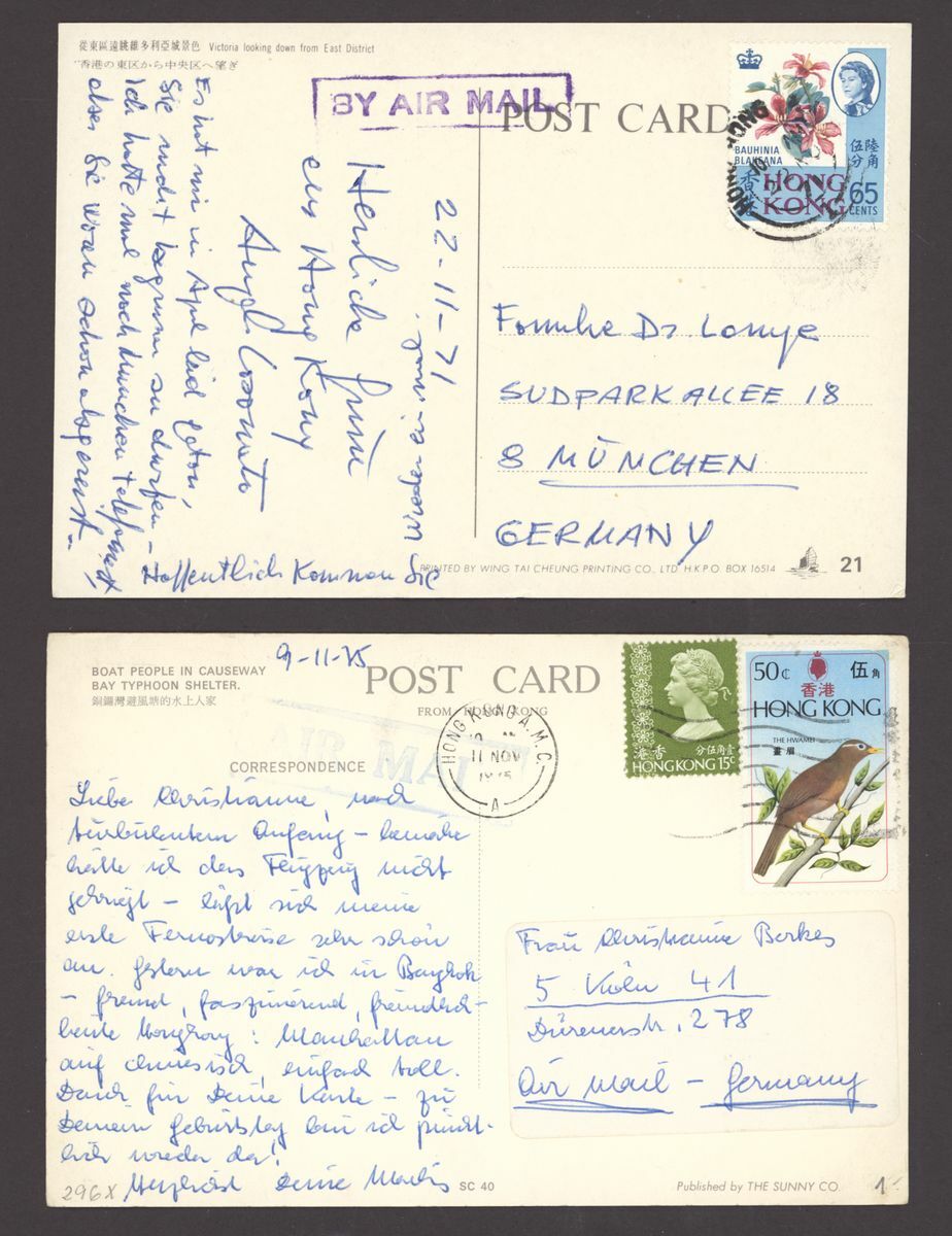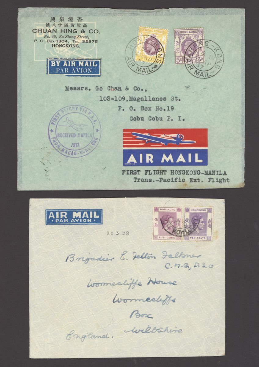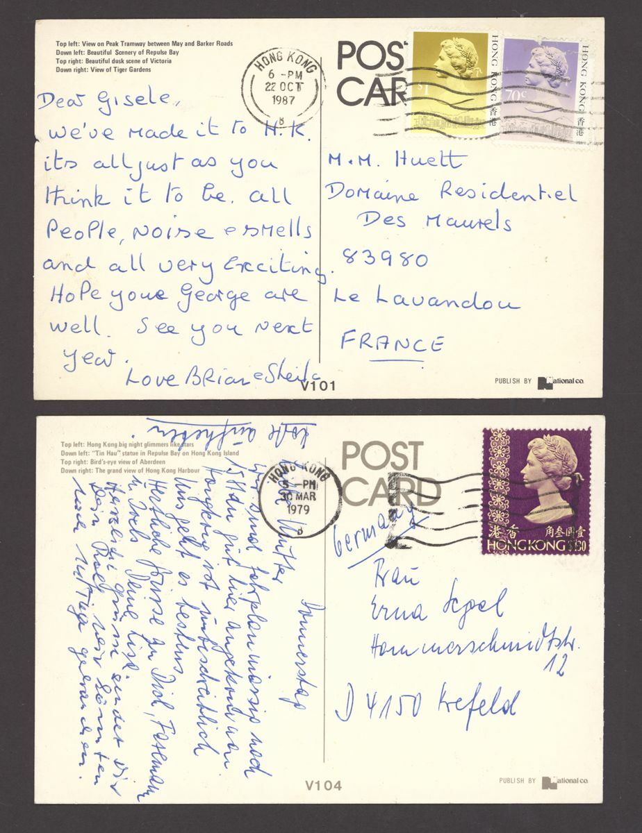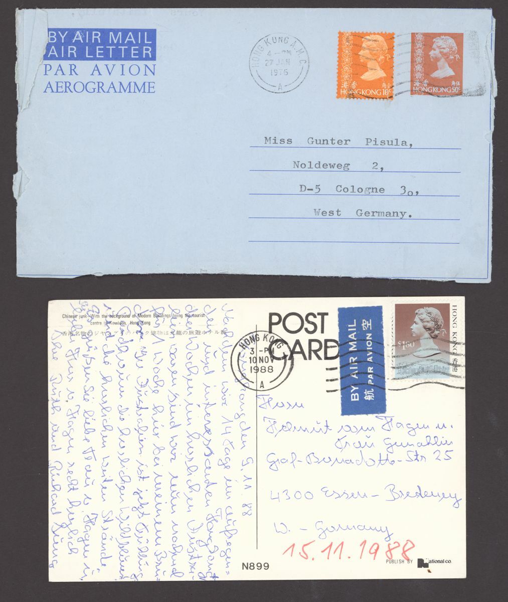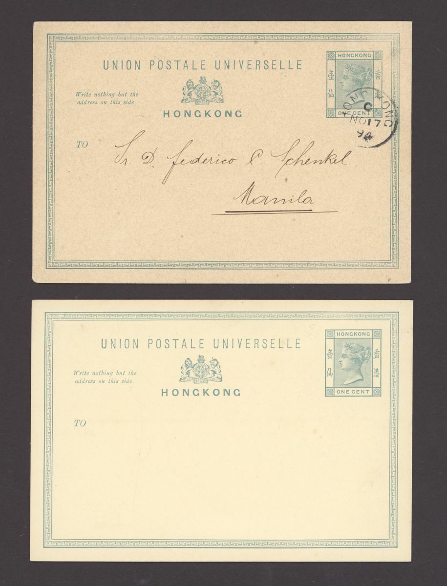1884-1970s Postal History collection including 1884 3c. postal stationery card from Shanghai to Austria, 1899 postcard from China to Austria bearing China CIP 4c. tied by Pa-kua cancellation overlapped by Hong-Kong 2c. pair cancelled by Shanghai c.d.s., 1931 red band cover to China bearing Hong Kong 2c. and 10c. In addition a 1975 50c. bird ' The Hwamei' variety 'black printed double with Hong Kong stamp society certificate. Mixed condition, an interesting lot for the student of the subject.