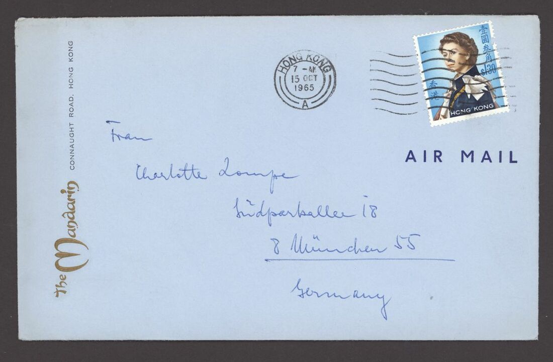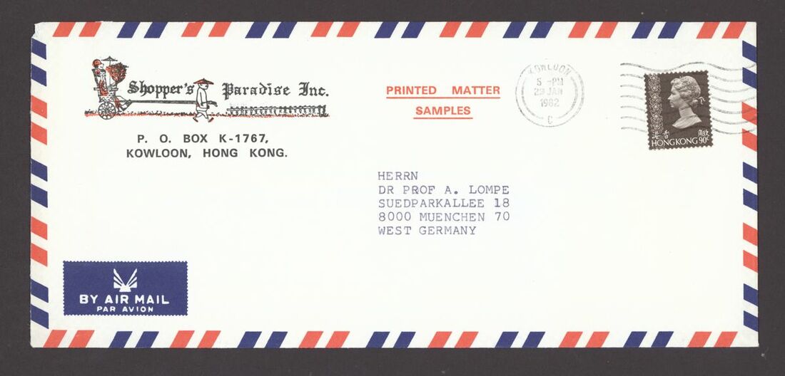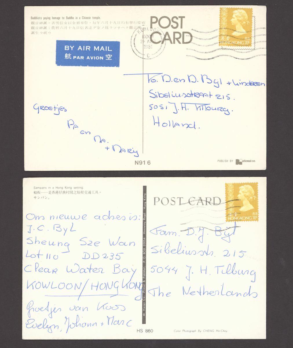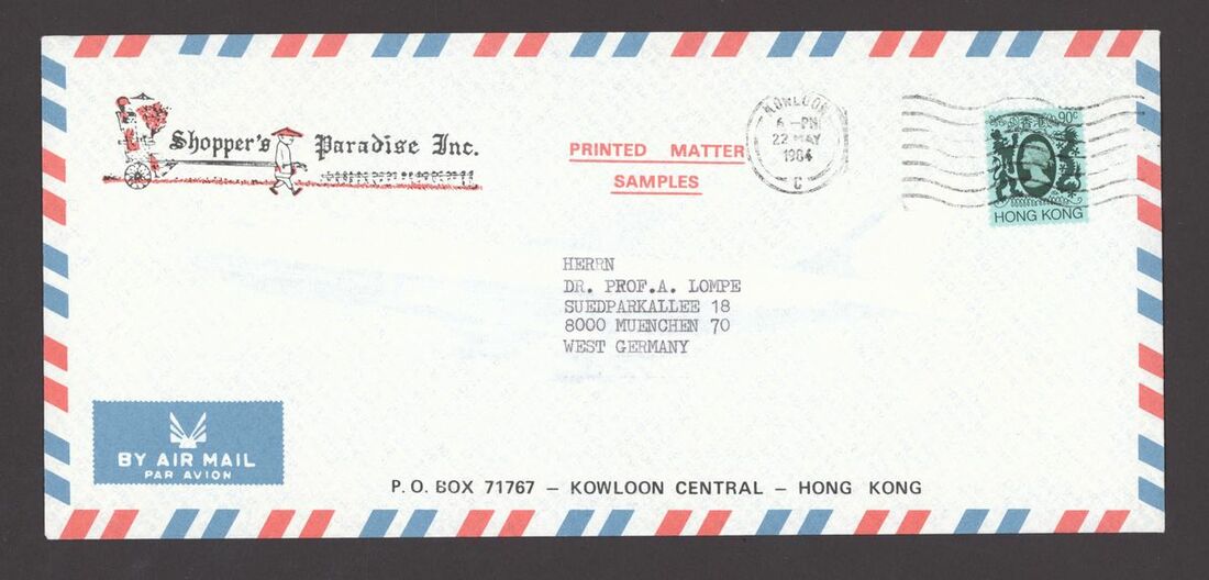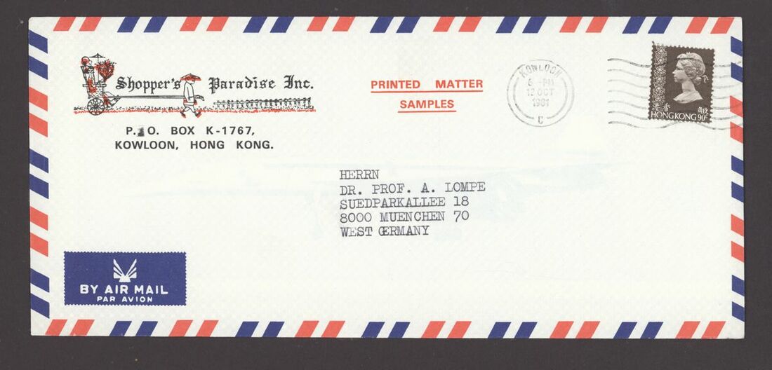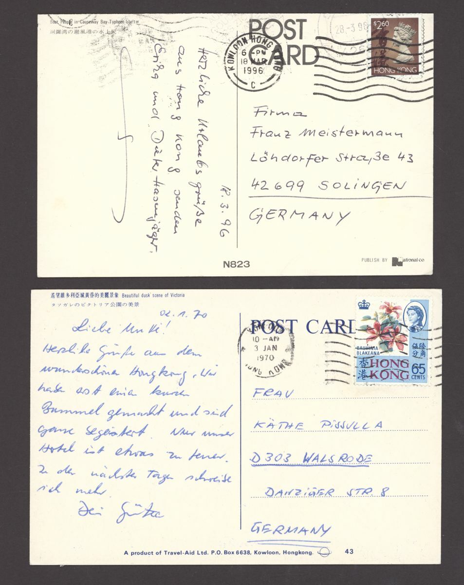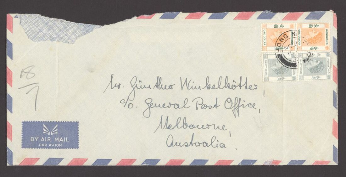 1884-1970s Postal History collection including 1884 3c. postal stationery card from Shanghai to Austria, 1899 postcard from China to Austria bearing China CIP 4c. tied by Pa-kua cancellation overlapped by Hong-Kong 2c. pair cancelled by Shanghai c.d.s., 1931 red band cover to China bearing Hong Kong 2c. and 10c. In addition a 1975 50c. bird ' The Hwamei' variety 'black printed double with Hong Kong stamp society certificate. Mixed condition, an interesting lot for the student of the subject.
